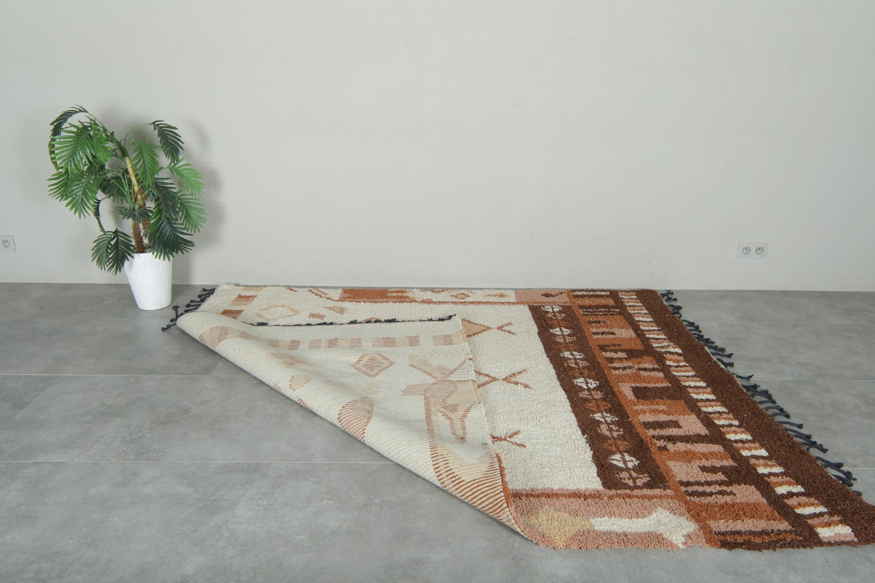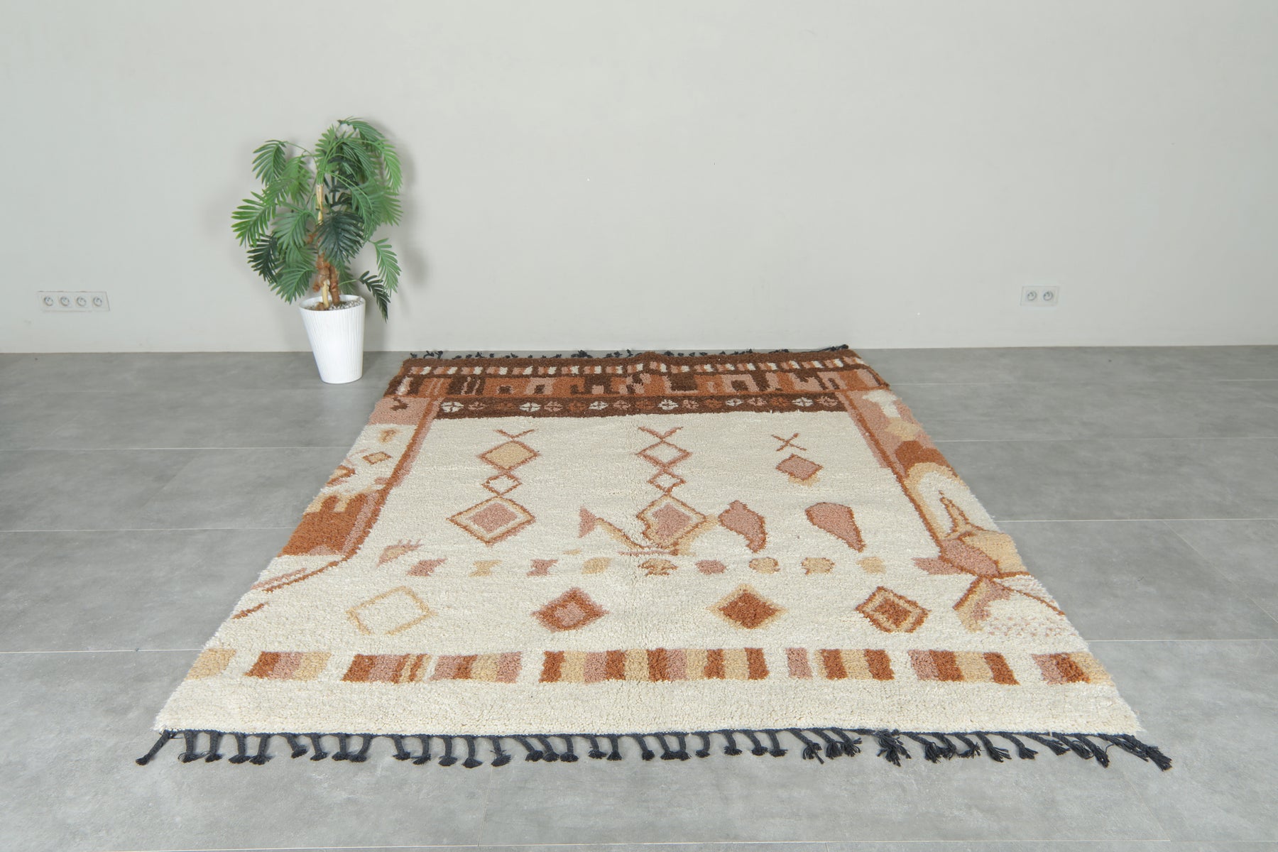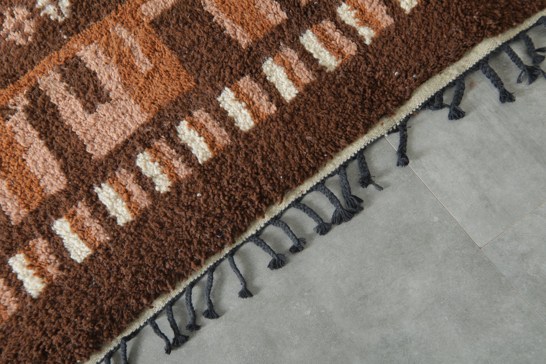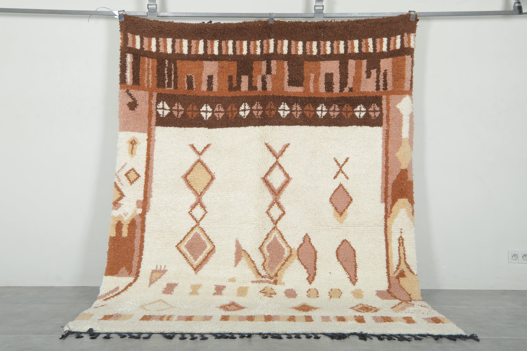 This one-of-a-kind Azilal rug is handwoven in Morocco using natural wool and cotton, showcasing a vibrant tapestry of Berber artistry. The design features layered geometric and abstract motifs—diamonds, zigzags, and rectangles—in a warm palette of brown, rust, beige, and white. A darker brown border anchors the composition, while asymmetrical shapes add visual rhythm and storytelling. Finished with hand-knotted fringe, this piece is ideal for eclectic, bohemian, or modern interiors seeking depth and cultural texture.