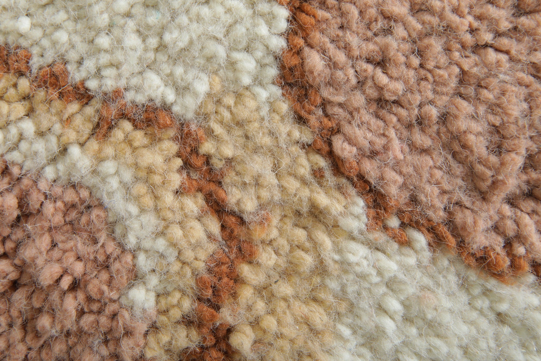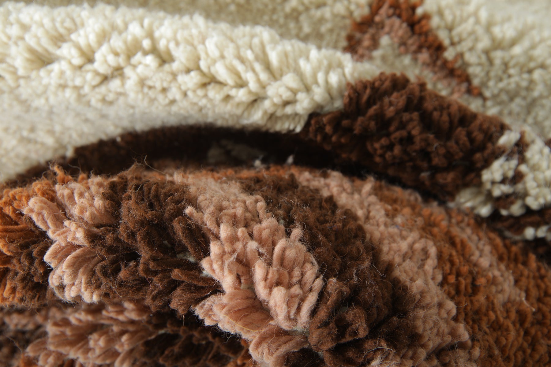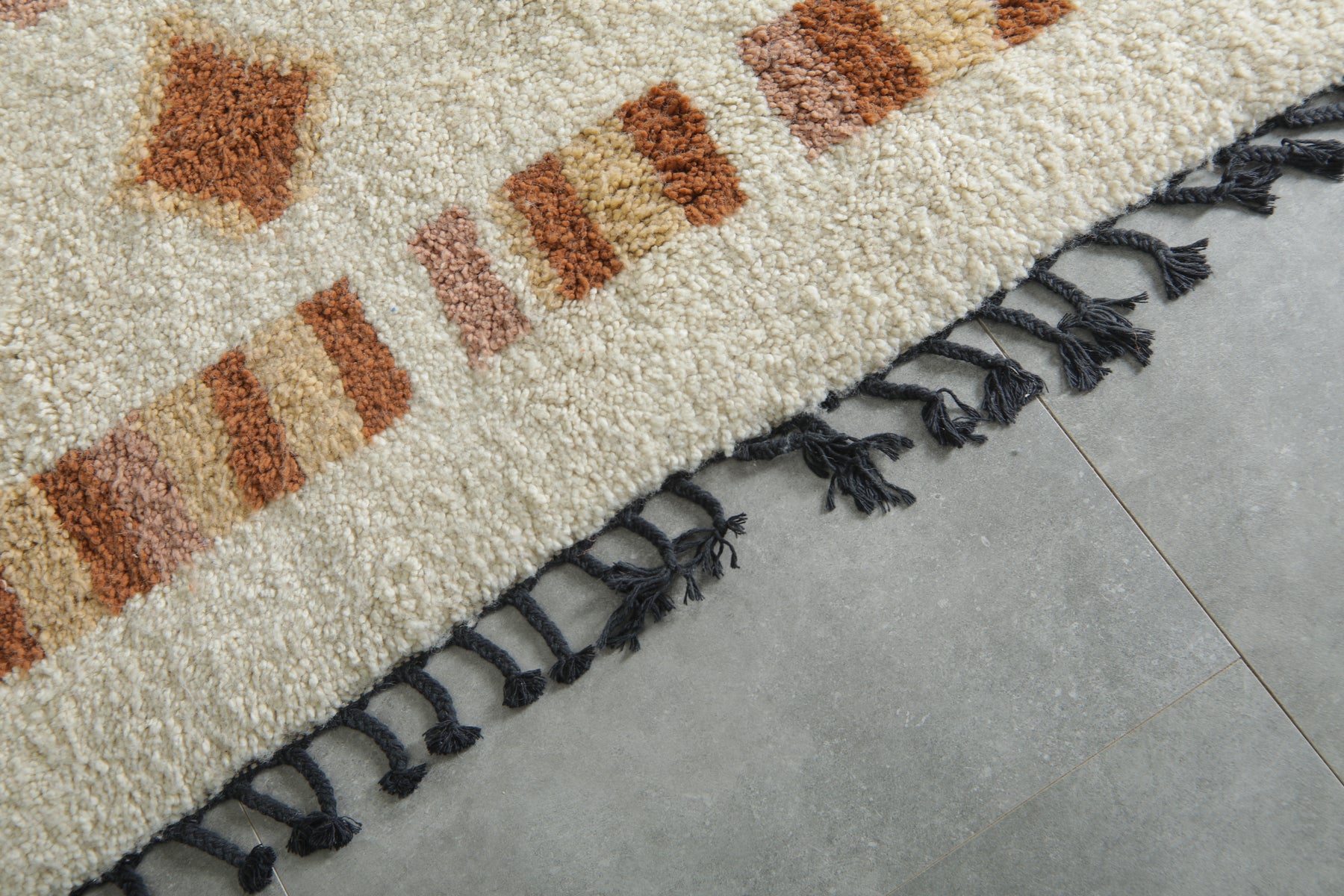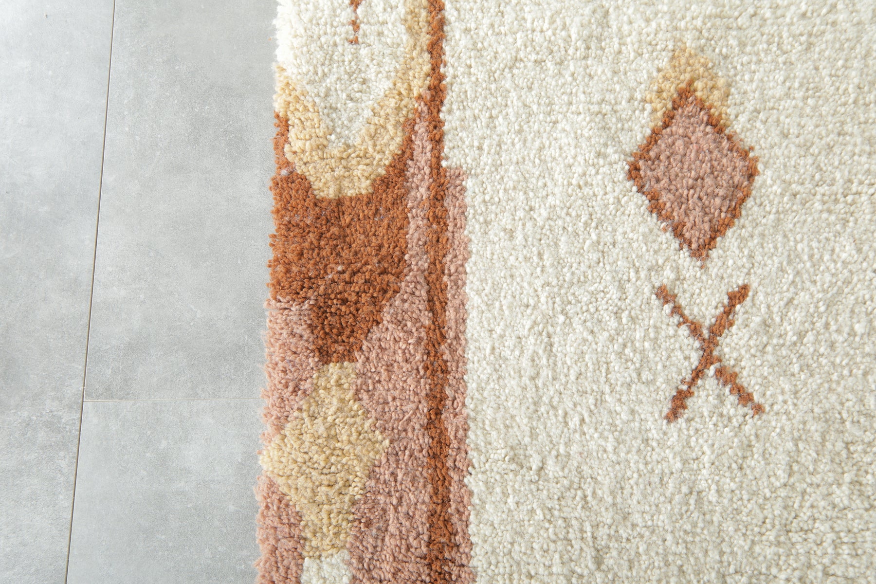 This one-of-a-kind Azilal rug is handwoven in Morocco using natural wool and cotton, showcasing a vibrant tapestry of Berber artistry. The design features layered geometric and abstract motifs—diamonds, zigzags, and rectangles—in a warm palette of brown, rust, beige, and white. A darker brown border anchors the composition, while asymmetrical shapes add visual rhythm and storytelling. Finished with hand-knotted fringe, this piece is ideal for eclectic, bohemian, or modern interiors seeking depth and cultural texture.