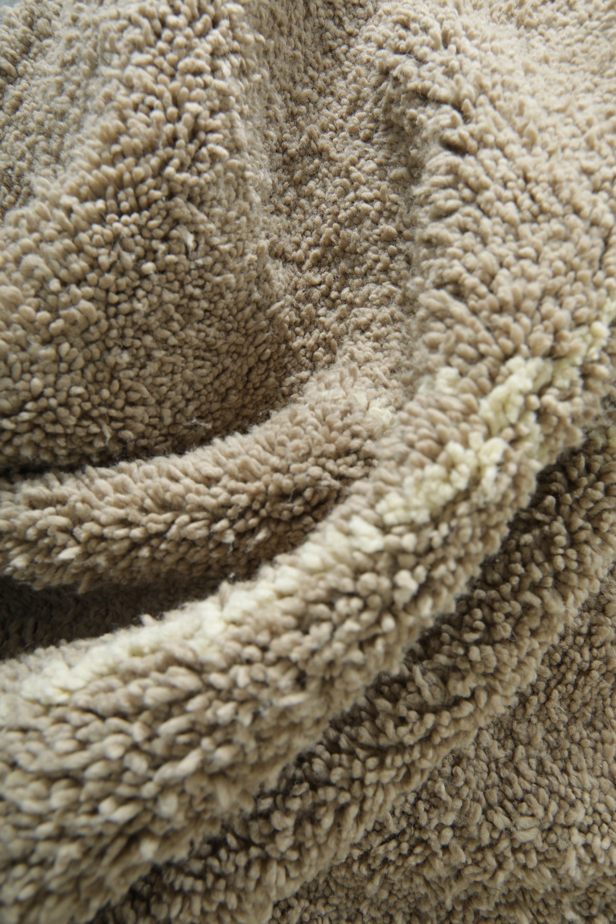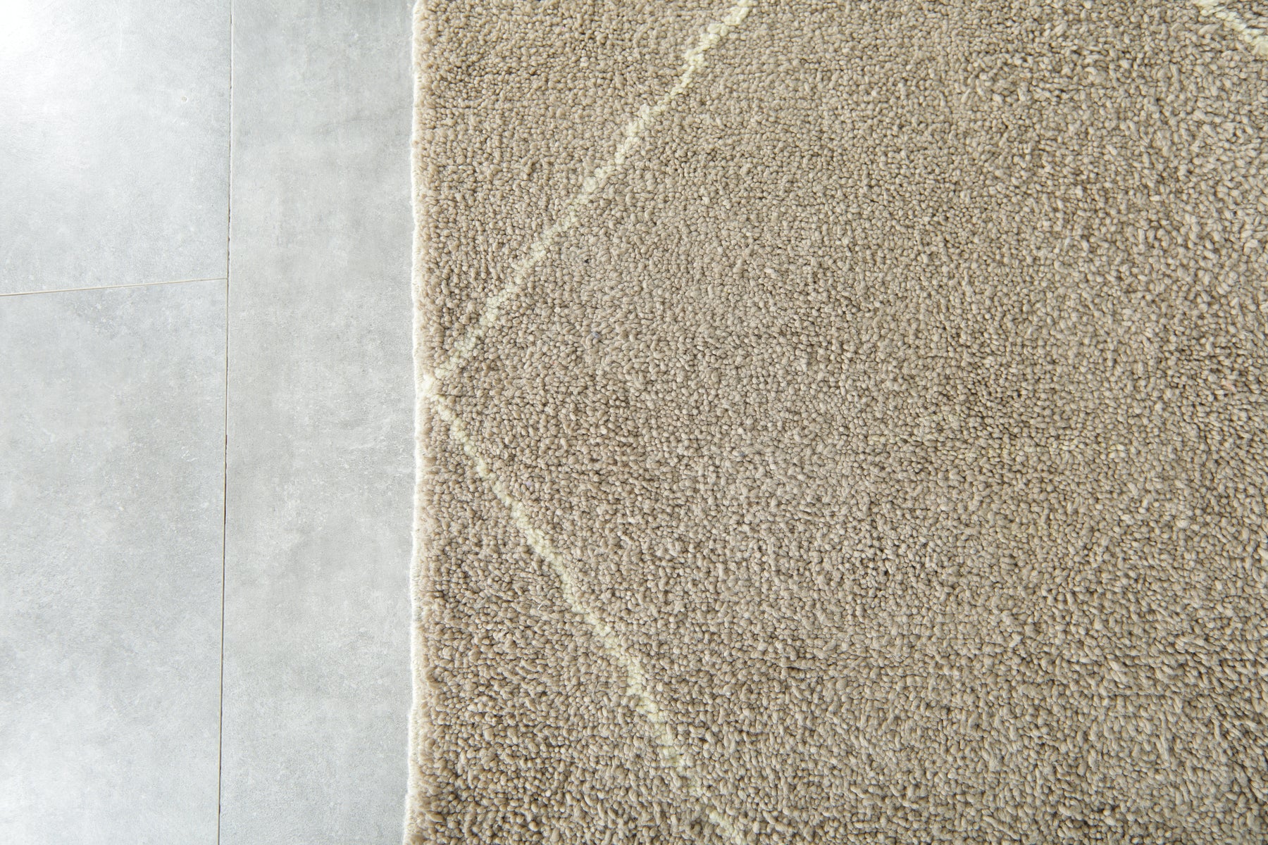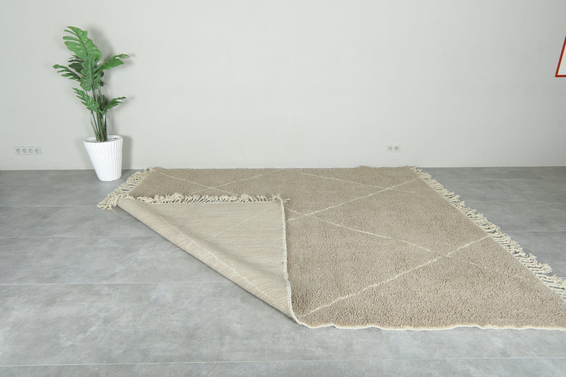 This elegant Beni Ourain rug is handwoven in Morocco from 100% natural wool, featuring a warm beige base accented by crisp white geometric lines. The classic diamond lattice pattern adds structure and visual rhythm, while the plush texture and hand-knotted fringe bring softness and artisanal charm. Its neutral palette makes it a versatile statement piece—ideal for minimalist, bohemian, or Scandinavian-inspired interiors.