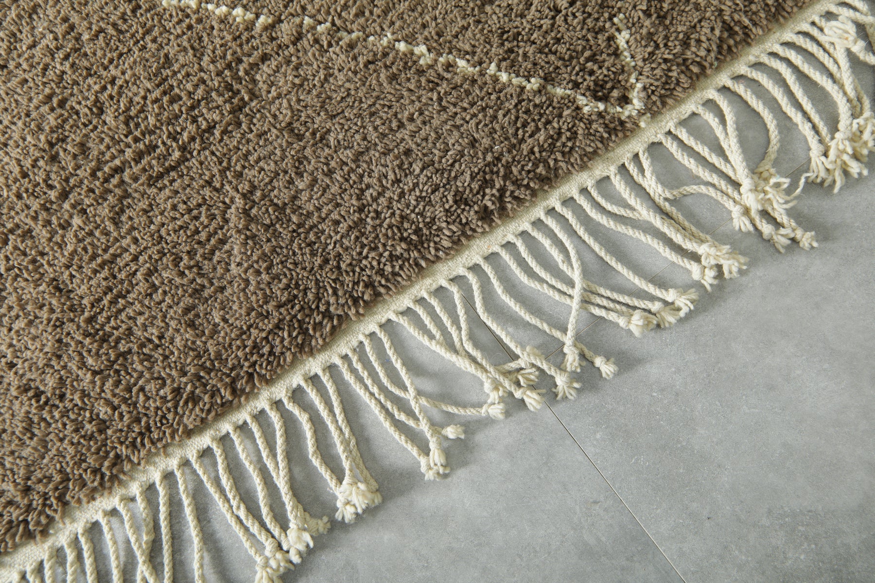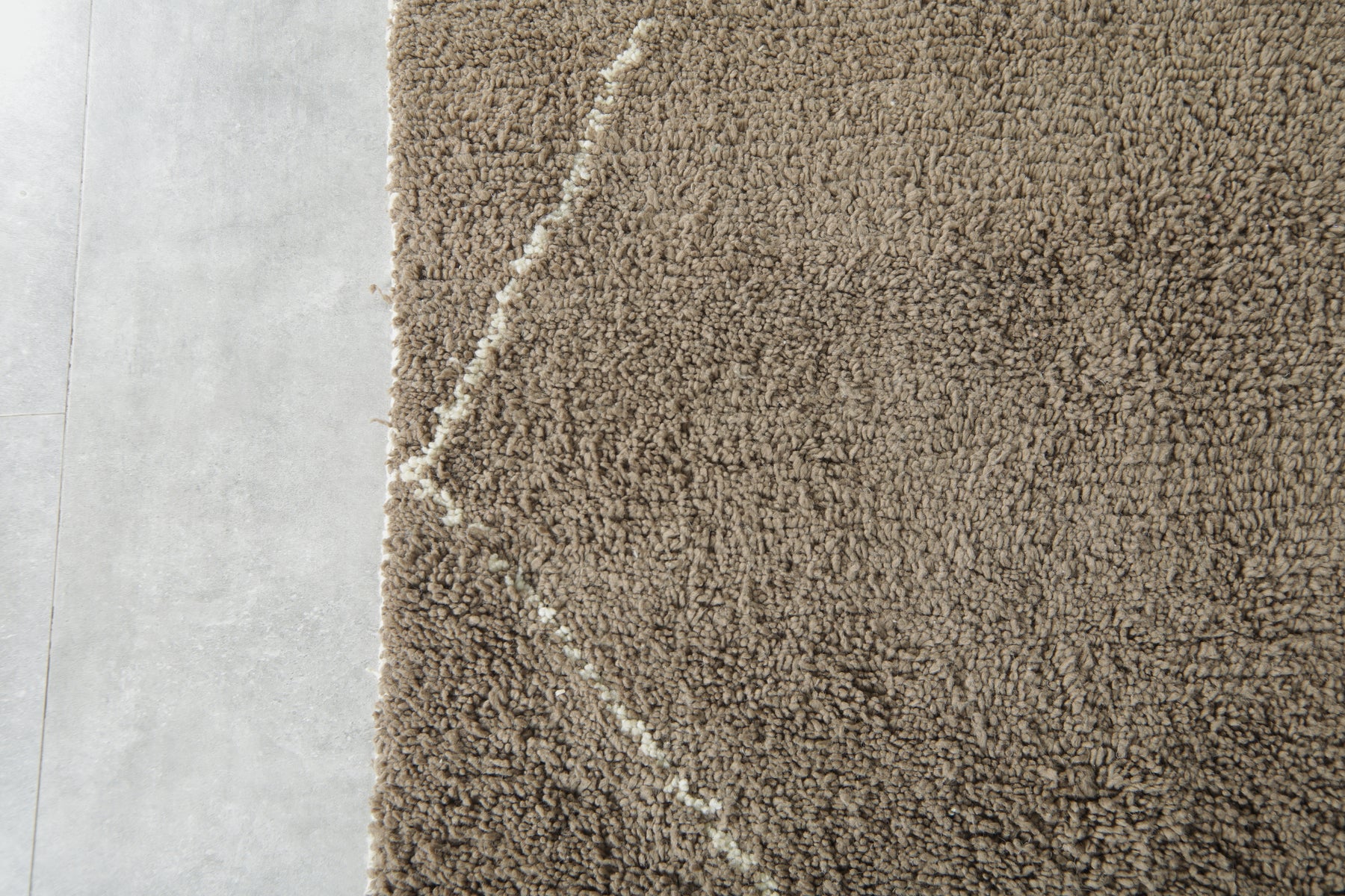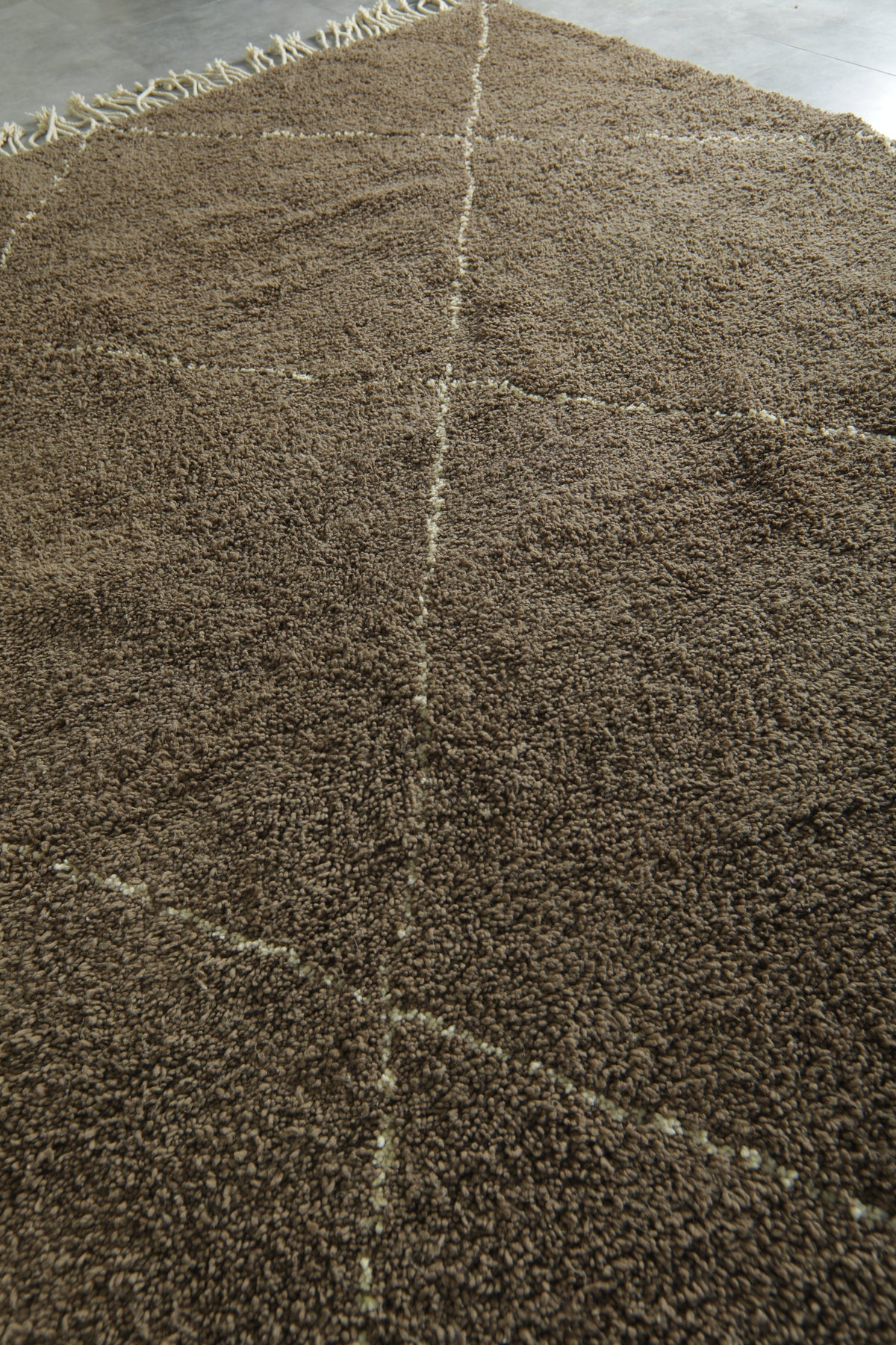 This artisanal Beni Ourain rug is handwoven in Morocco from 100% natural wool, featuring a warm brown base with a soft, shaggy texture. Thin white lines form an elongated diamond lattice across the surface, adding graphic structure to its earthy tone. Finished with hand-knotted white fringe, this piece blends traditional Berber craftsmanship with a grounded, minimalist aesthetic—perfect for rustic, bohemian, or modern interiors seeking warmth and authenticity.