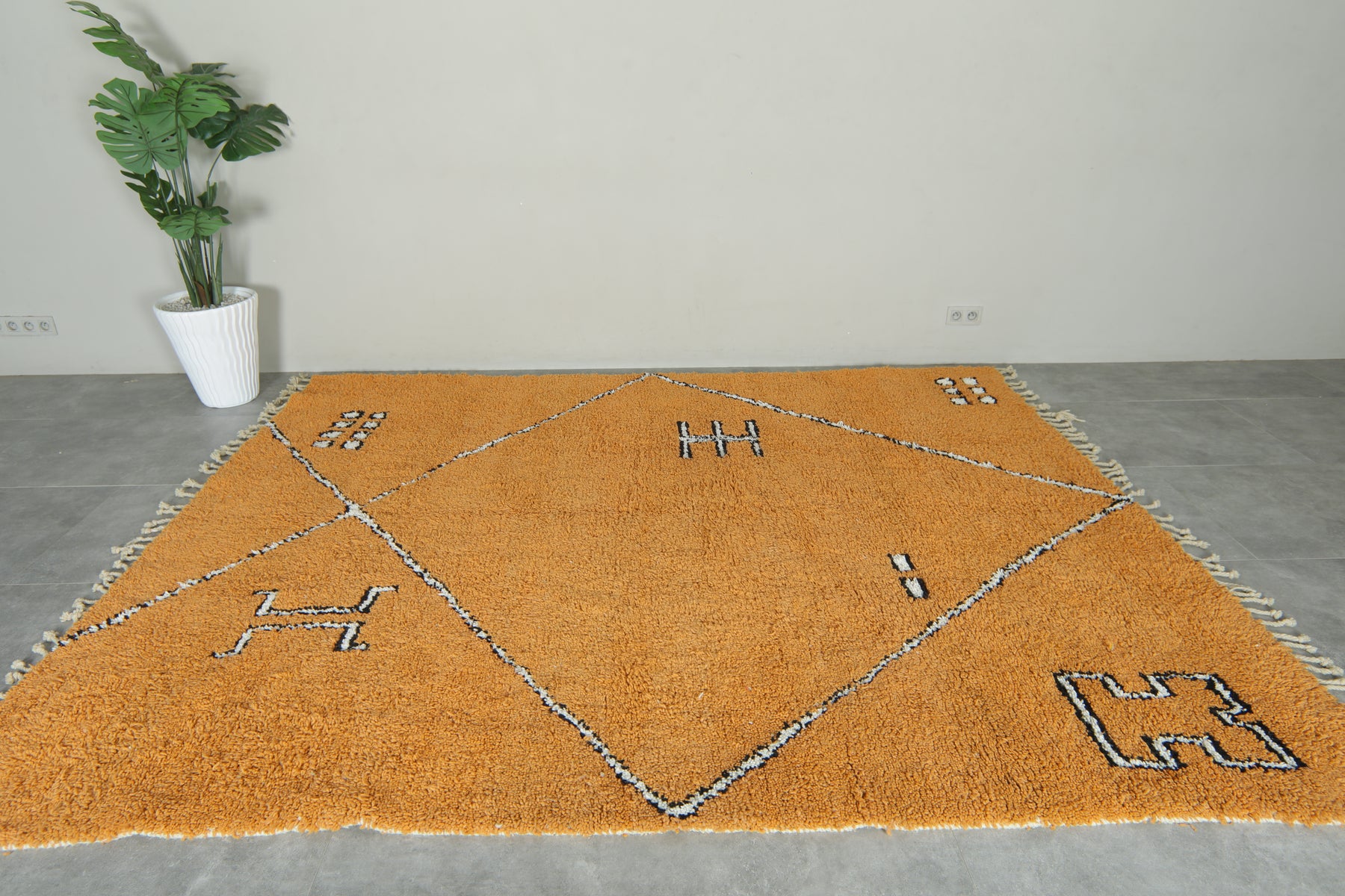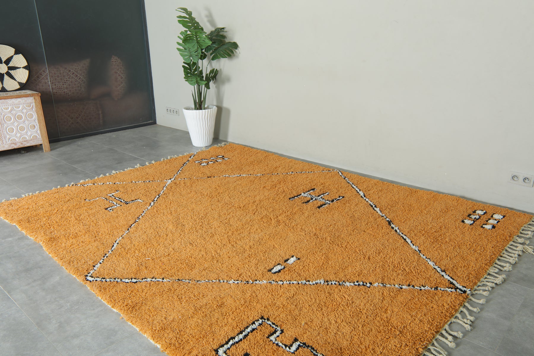 Elevate your space with this handwoven Moroccan rug, featuring a bold burnt orange background and minimalist Berber tribal motifs in black and white. Inspired by traditional Amazigh (Berber) symbolism, this modern wool area rug blends cultural heritage with contemporary style, making it a perfect statement piece for bohemian, eclectic, or modern interiors.