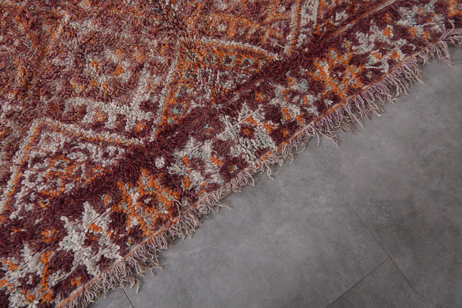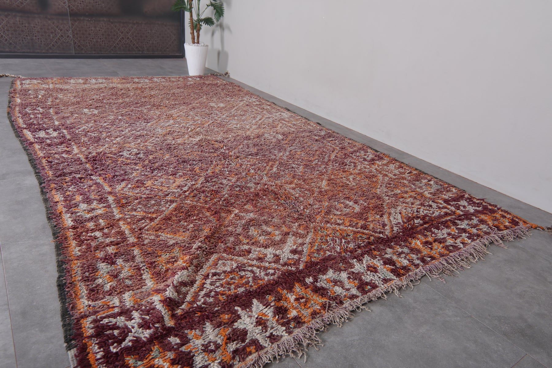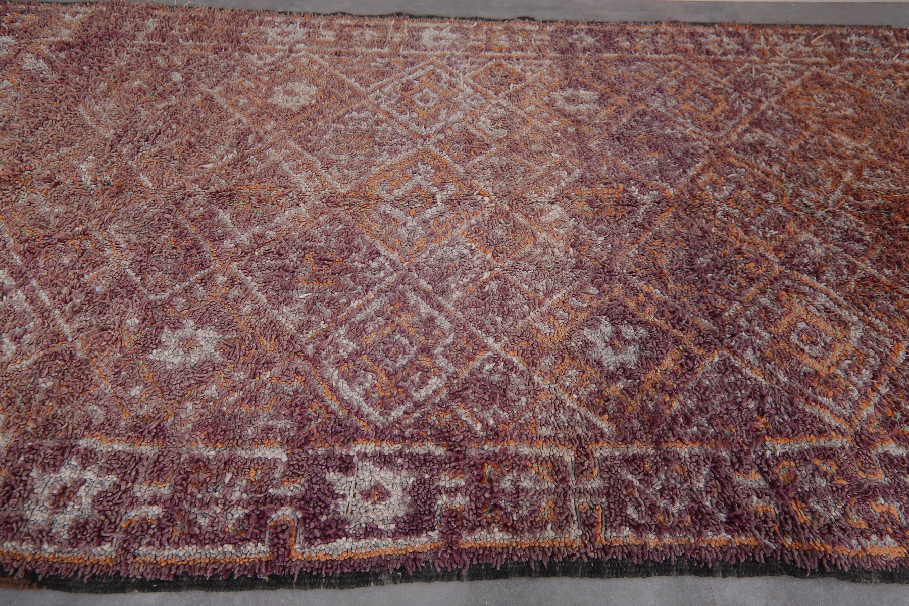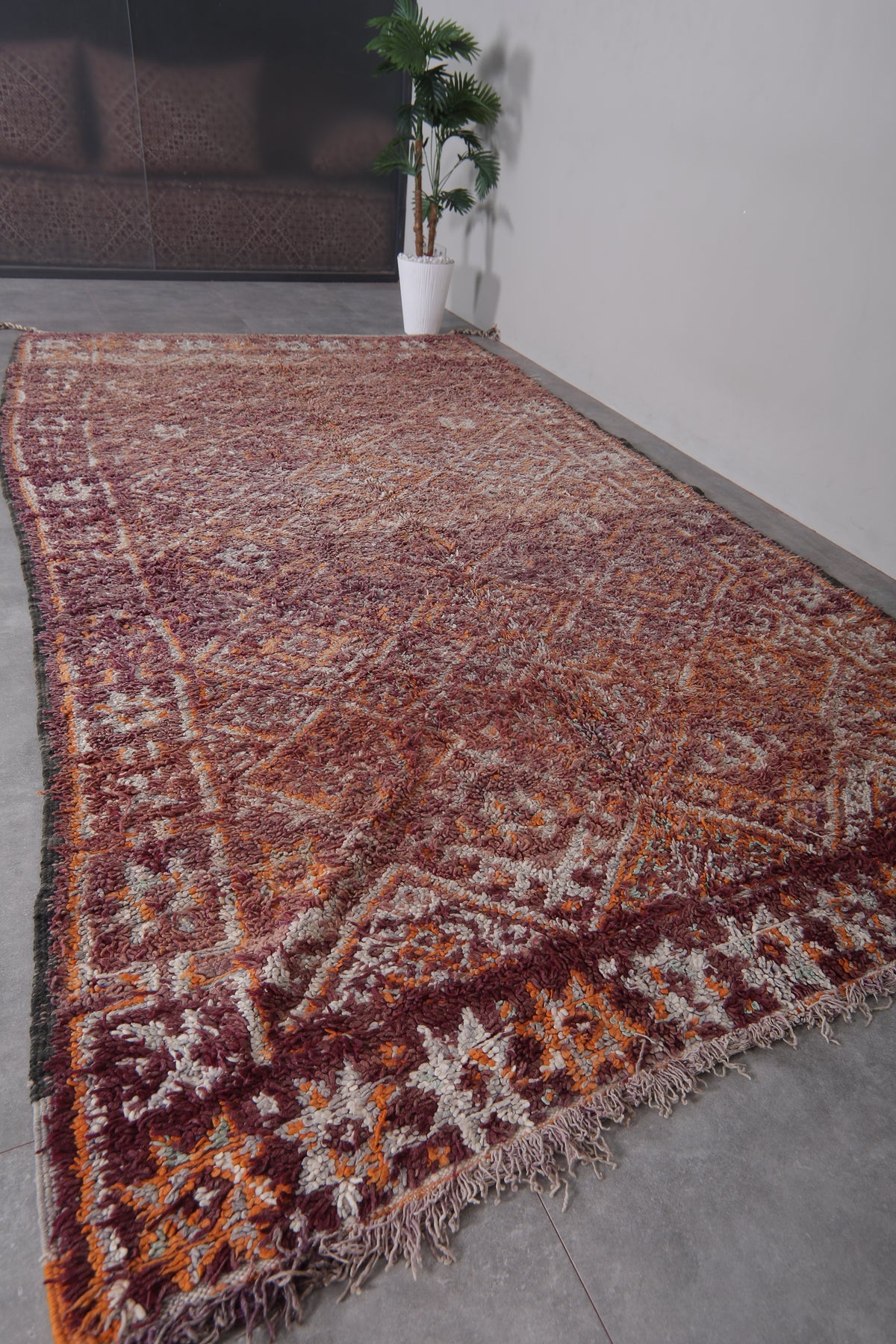 Bring understated elegance to your space with this handwoven Moroccan Boujaad rug, measuring 6.3 x 11.5 feet. Designed with a delicate arrangement of geometric diamond patterns, interspersed with floral-inspired motifs, this rug captures the essence of Moroccan craftsmanship. The muted palette blends earthy tones of burgundy, beige, and soft orange, creating a warm and inviting aesthetic. Framed with subtle borders, it offers a harmonious mix of traditional artistry and contemporary style.