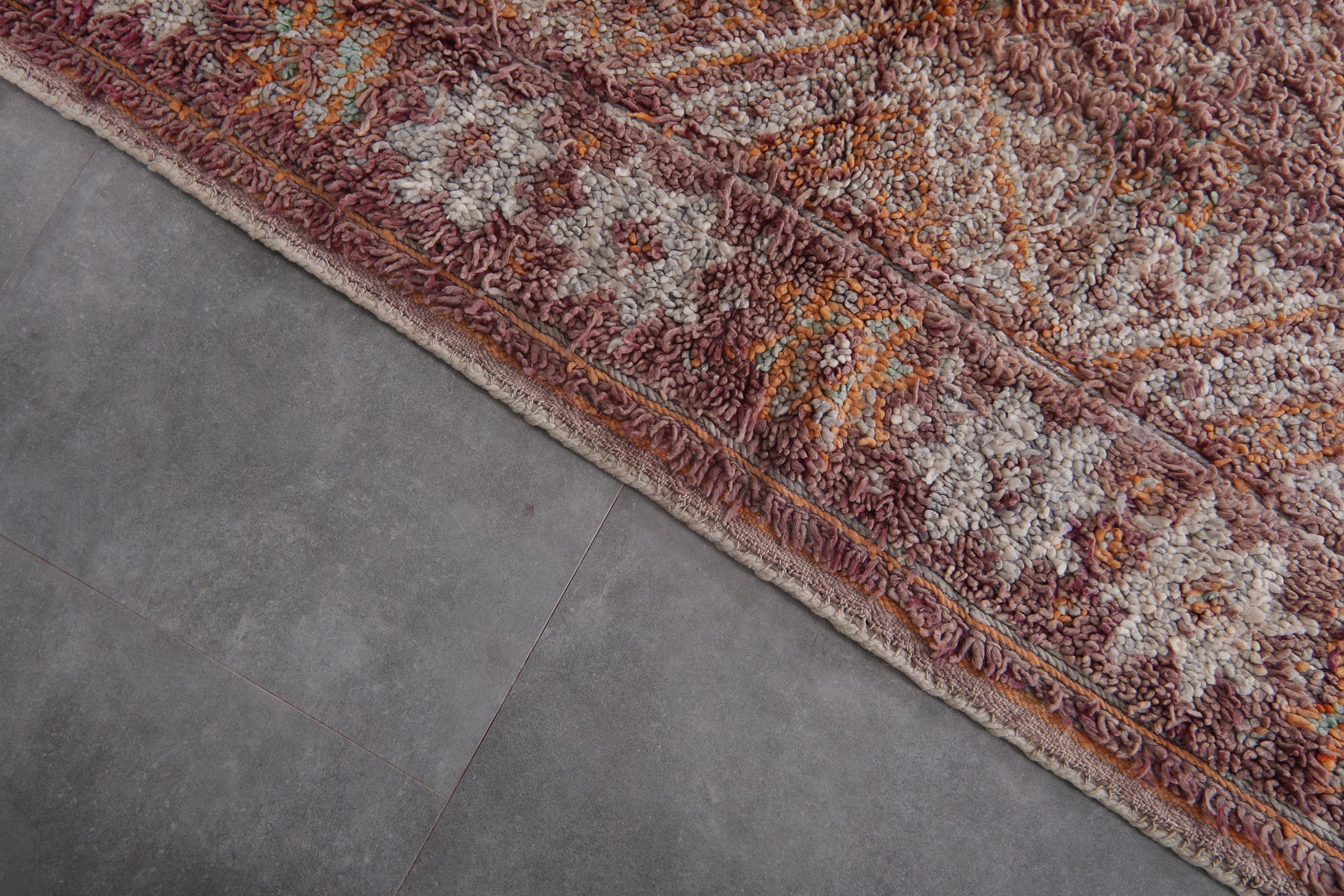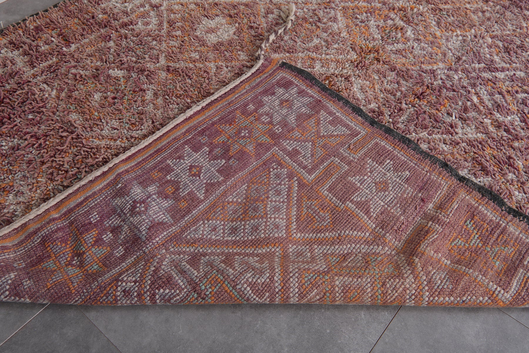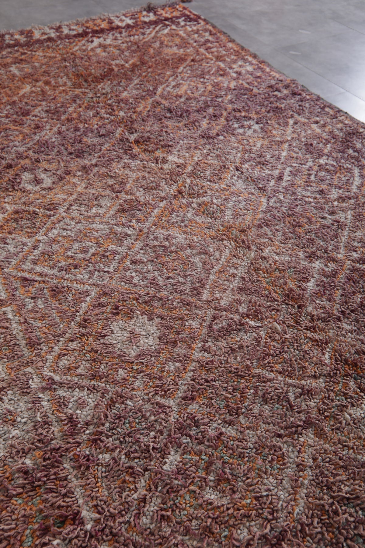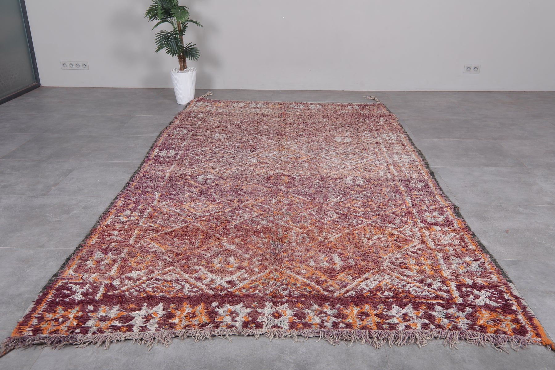 Bring understated elegance to your space with this handwoven Moroccan Boujaad rug, measuring 6.3 x 11.5 feet. Designed with a delicate arrangement of geometric diamond patterns, interspersed with floral-inspired motifs, this rug captures the essence of Moroccan craftsmanship. The muted palette blends earthy tones of burgundy, beige, and soft orange, creating a warm and inviting aesthetic. Framed with subtle borders, it offers a harmonious mix of traditional artistry and contemporary style.