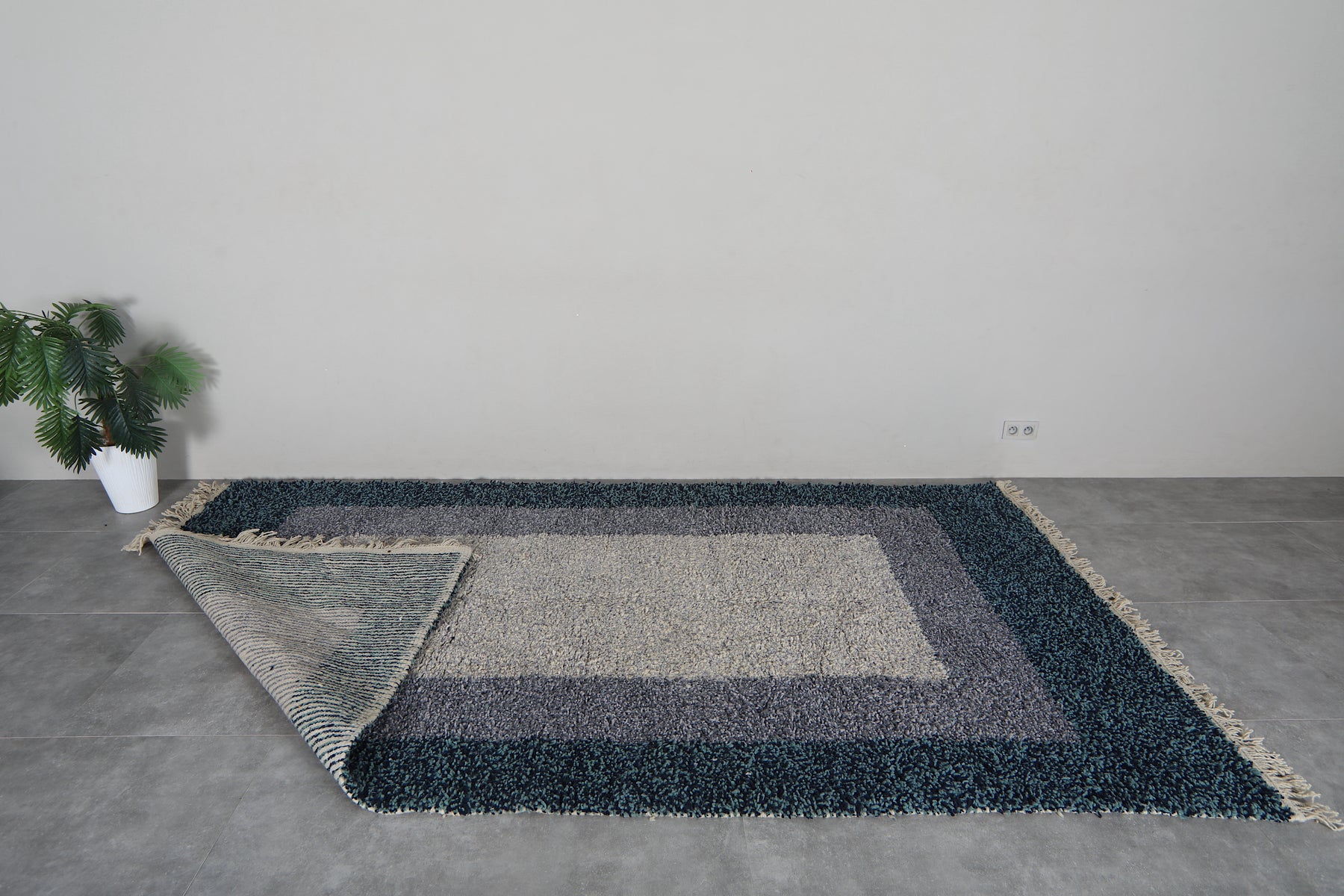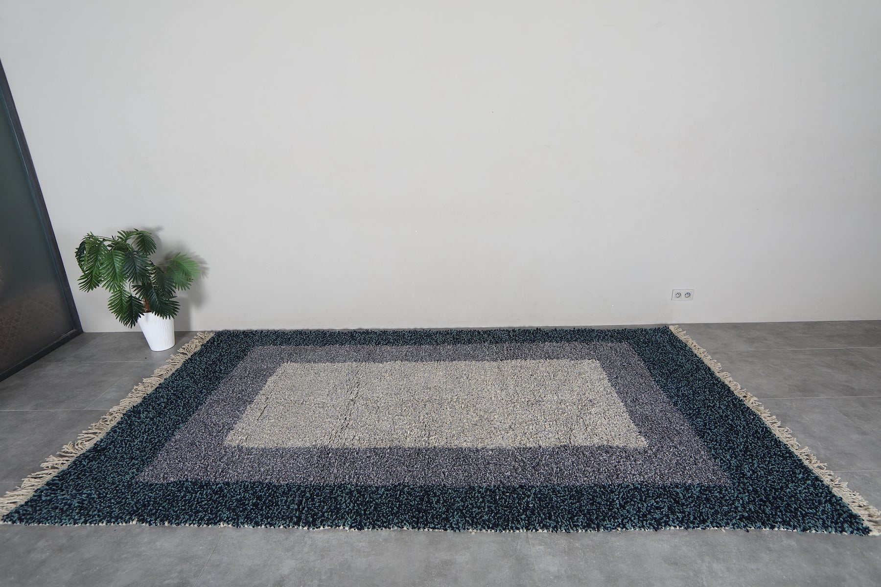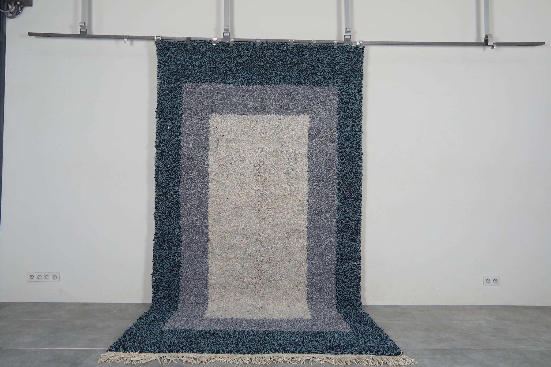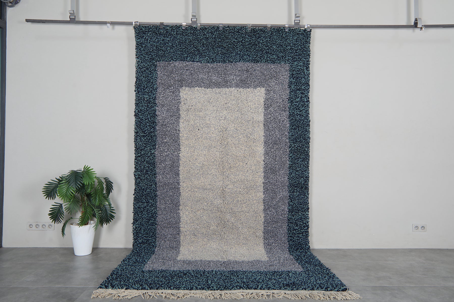 This contemporary Beni Ourain rug reimagines traditional Moroccan weaving with a sophisticated blue and gray palette and layered border design. Handcrafted by Berber artisans using premium wool, it bridges classic heritage and modern aesthetics. The subtle geometric borders frame the piece with refined detail, while the cool color palette complements minimalist, industrial, and contemporary interiors. Naturally durable and stain-resistant wool ensures longevity through years of daily use. Customize the size to perfectly fit your space. Each rug is individually woven, making it a unique statement piece that adds depth and texture to living rooms, bedrooms, and offices. Authentic Moroccan craftsmanship meets modern design sensibility.