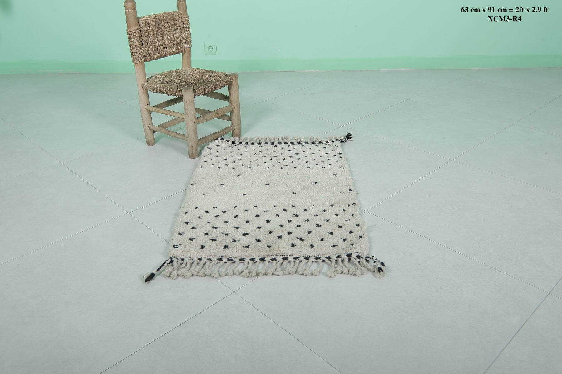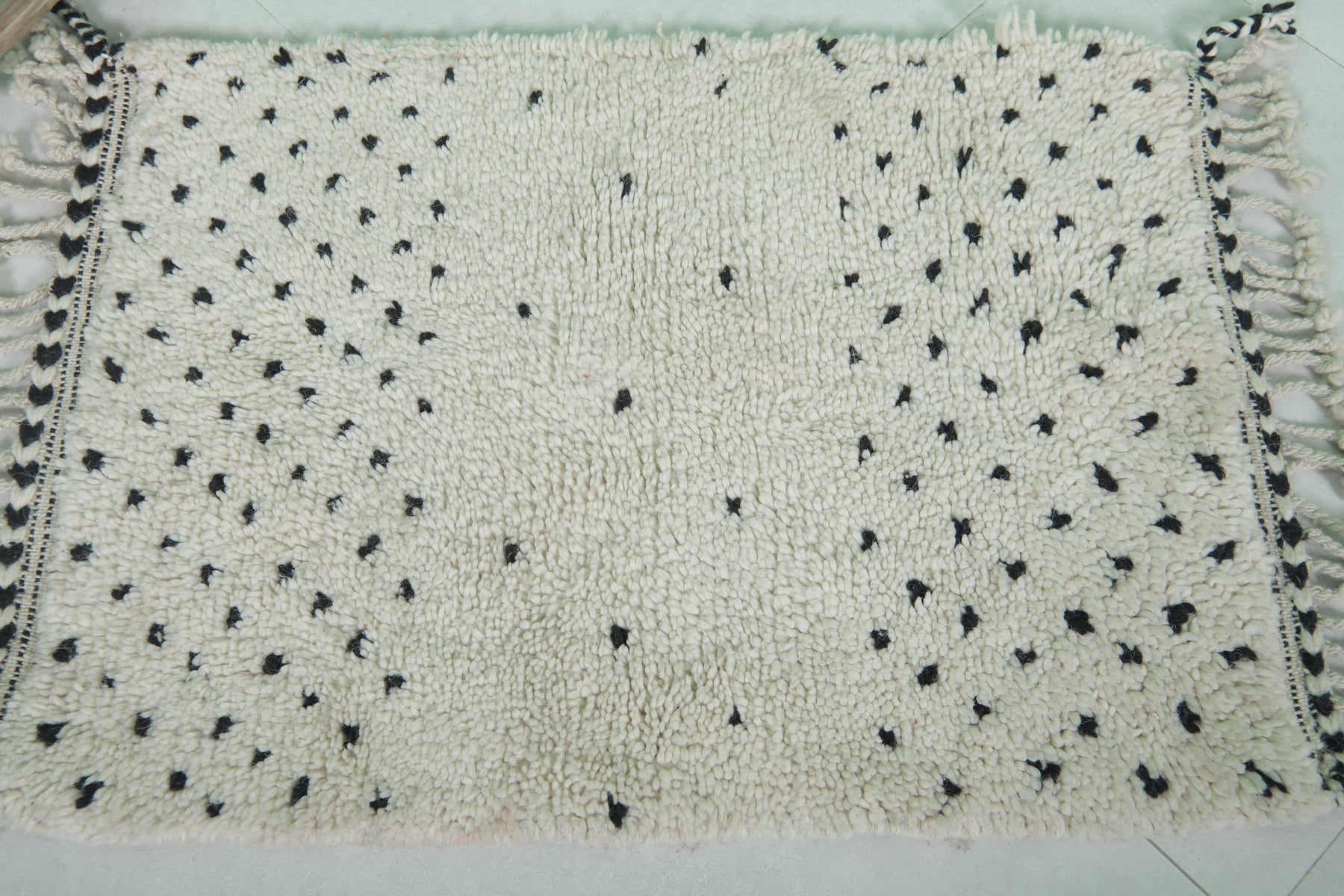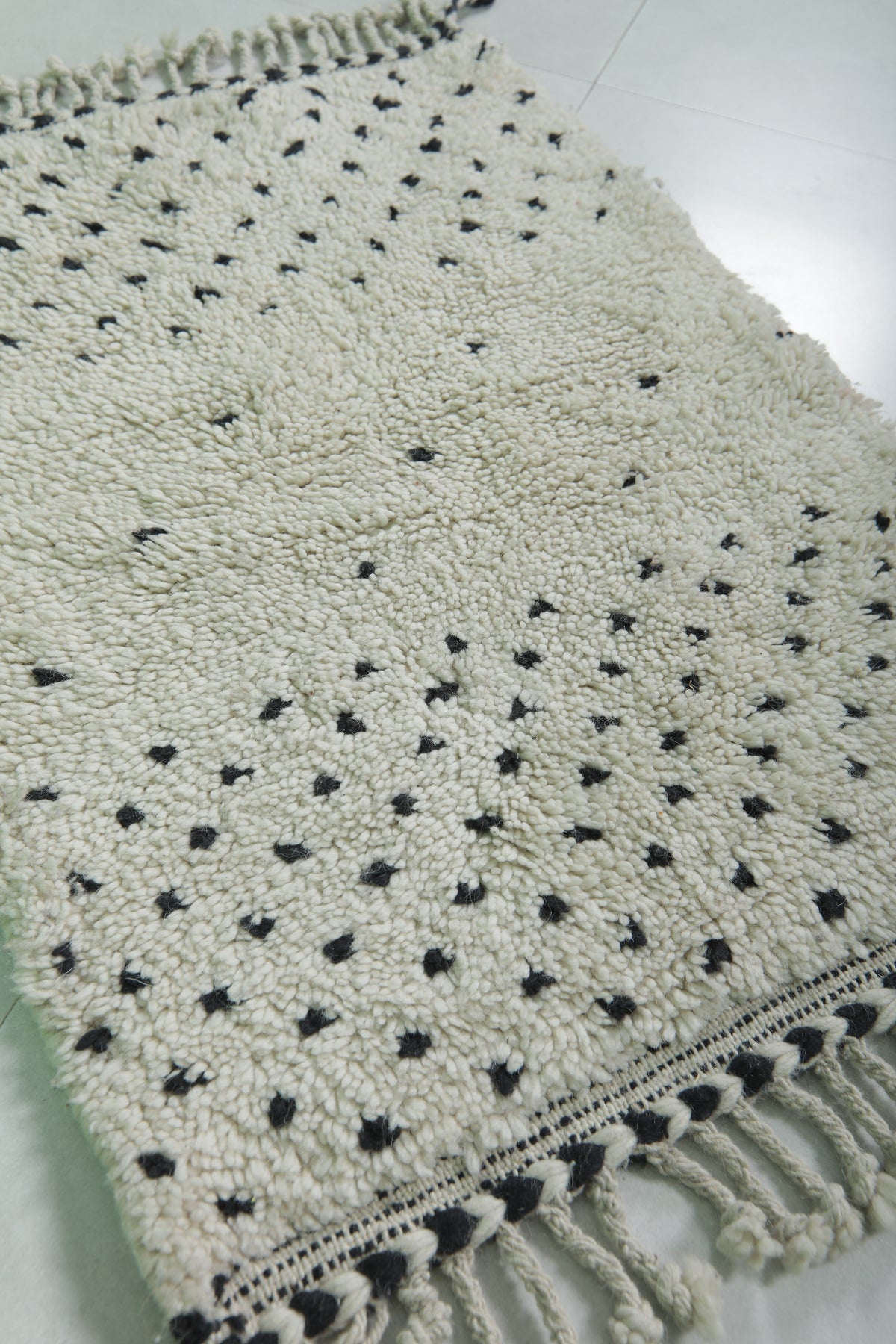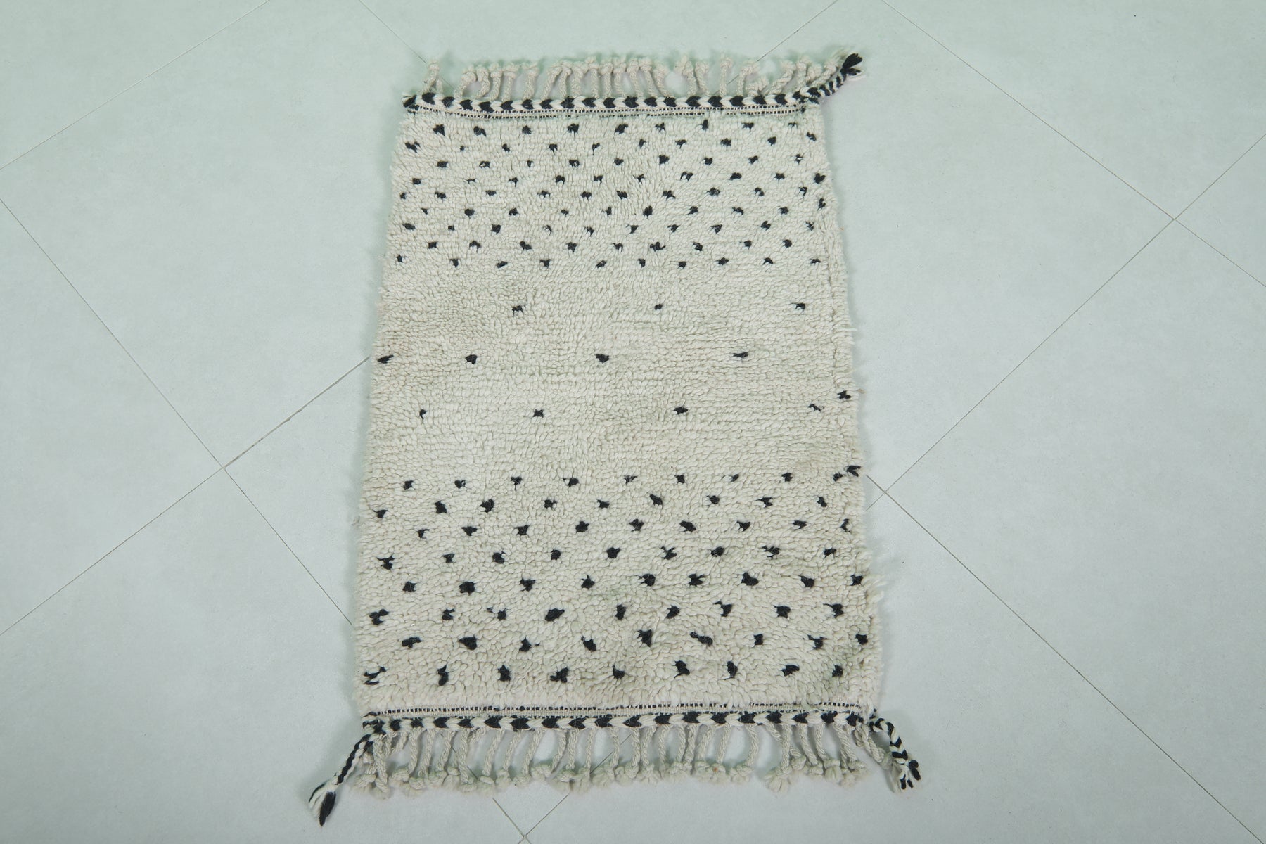 Introduce Moroccan craftsmanship to your home with this Handmade Wool Rug, sized at 2 x 2.9 feet (63 CM x 91 CM). Featuring a delicate black dot pattern on a neutral base, this charming rug is ideal for entryways, bathrooms, or as an accent piece in any space. Its soft texture and durable craftsmanship guarantee long-lasting elegance.