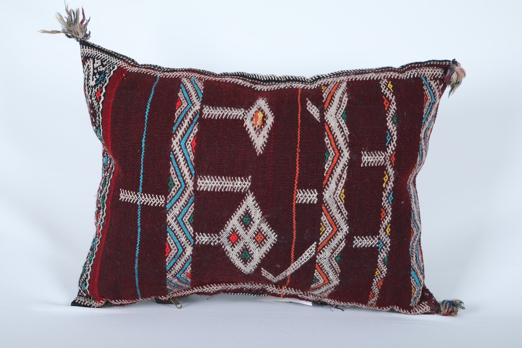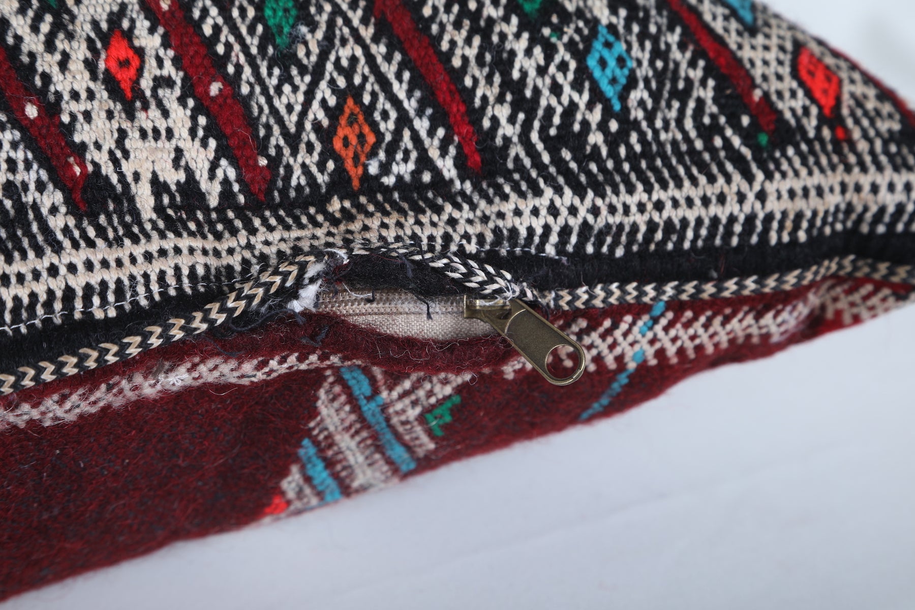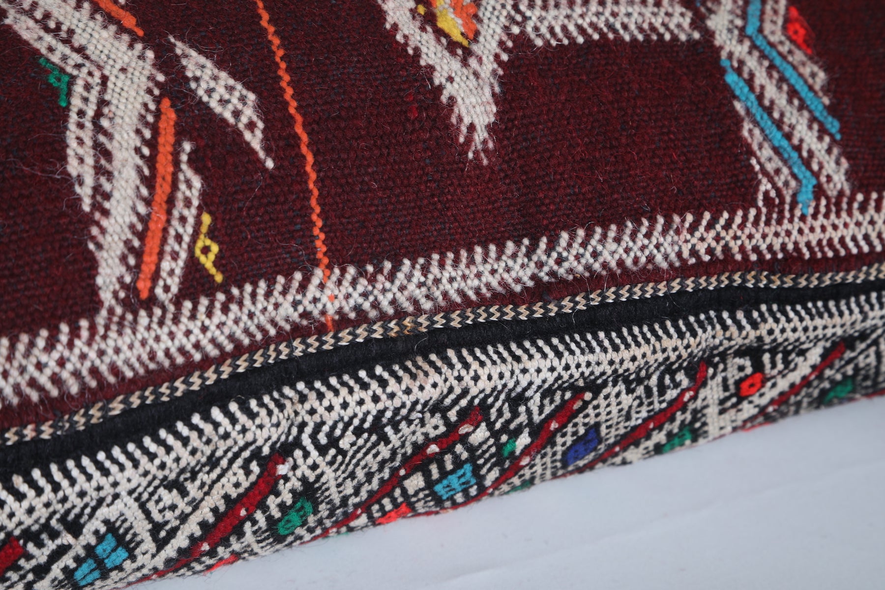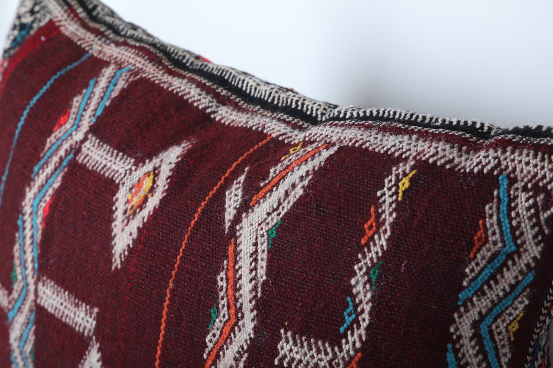 Add a bold pop of color and handcrafted artistry to your home with this handwoven Kilim Moroccan Pillow, sized at 16.9 x 22.8 inches (43 CM x 58 CM). Featuring intricate geometric patterns in rich red, black, and ivory hues, this pillow embodies the timeless beauty of Moroccan craftsmanship. Whether placed on a sofa, bed, or favorite chair, it brings warmth, culture, and texture to any living space.