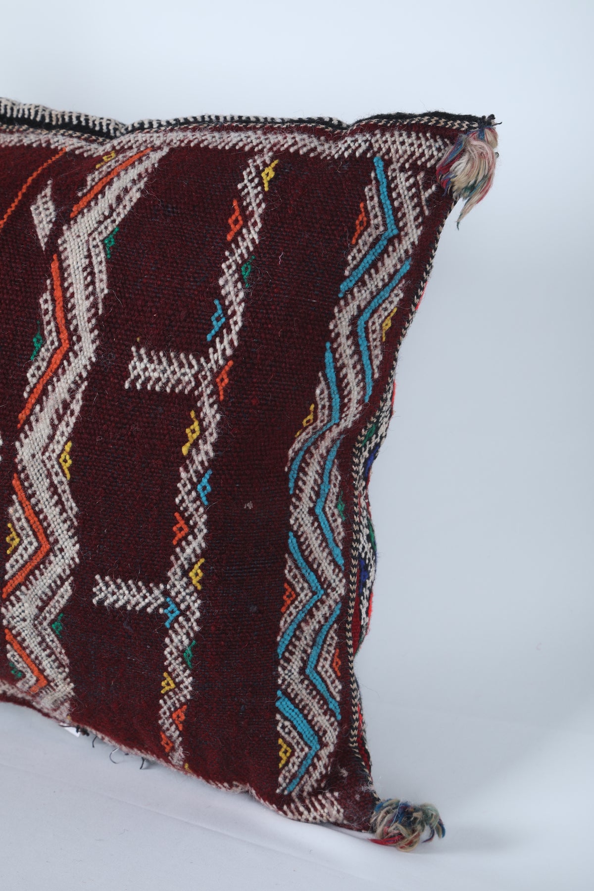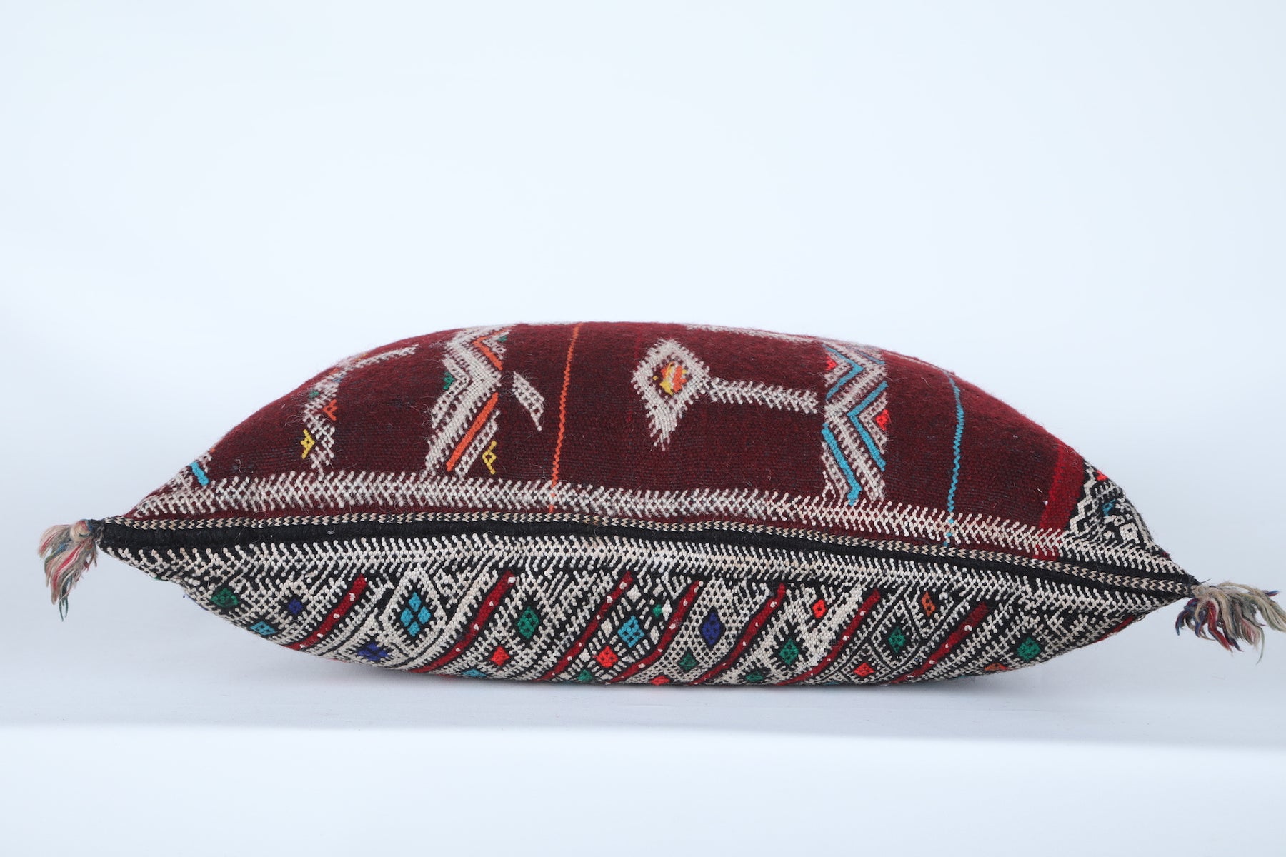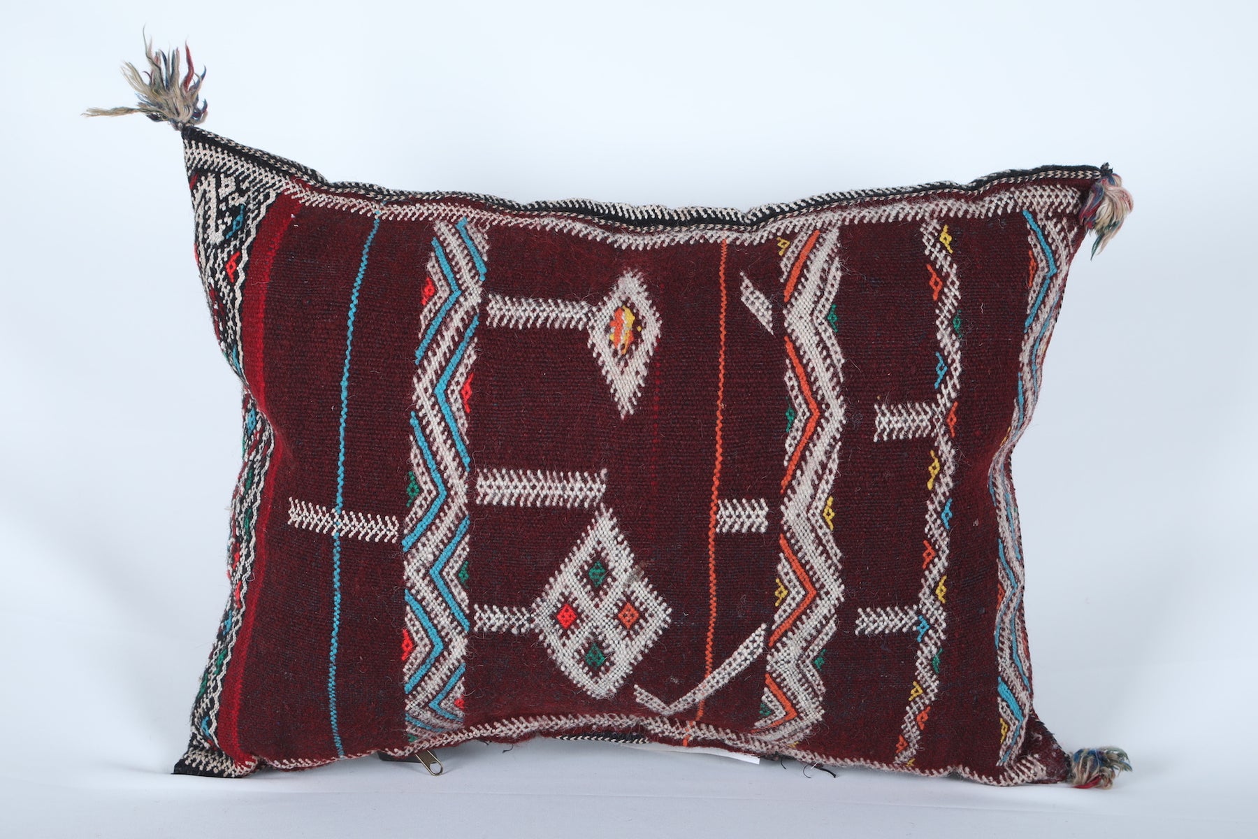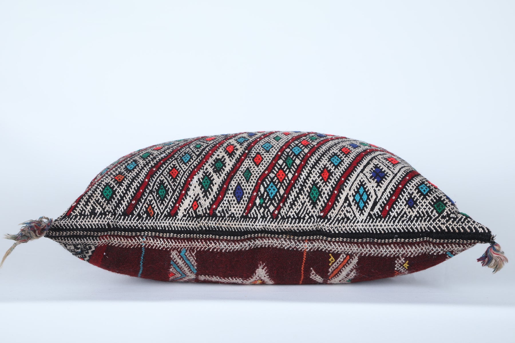 Add a bold pop of color and handcrafted artistry to your home with this handwoven Kilim Moroccan Pillow, sized at 16.9 x 22.8 inches (43 CM x 58 CM). Featuring intricate geometric patterns in rich red, black, and ivory hues, this pillow embodies the timeless beauty of Moroccan craftsmanship. Whether placed on a sofa, bed, or favorite chair, it brings warmth, culture, and texture to any living space.