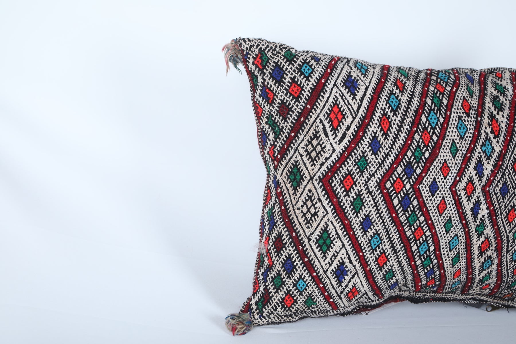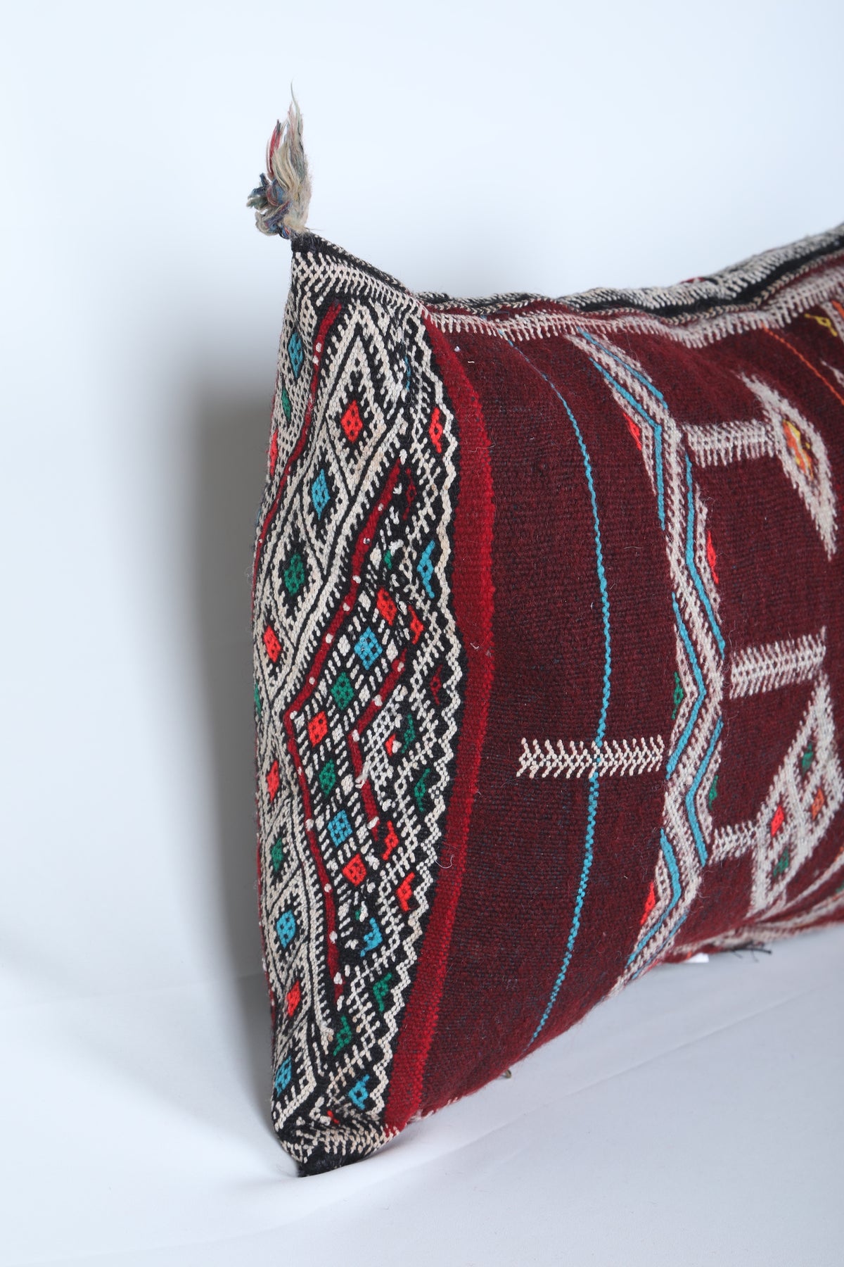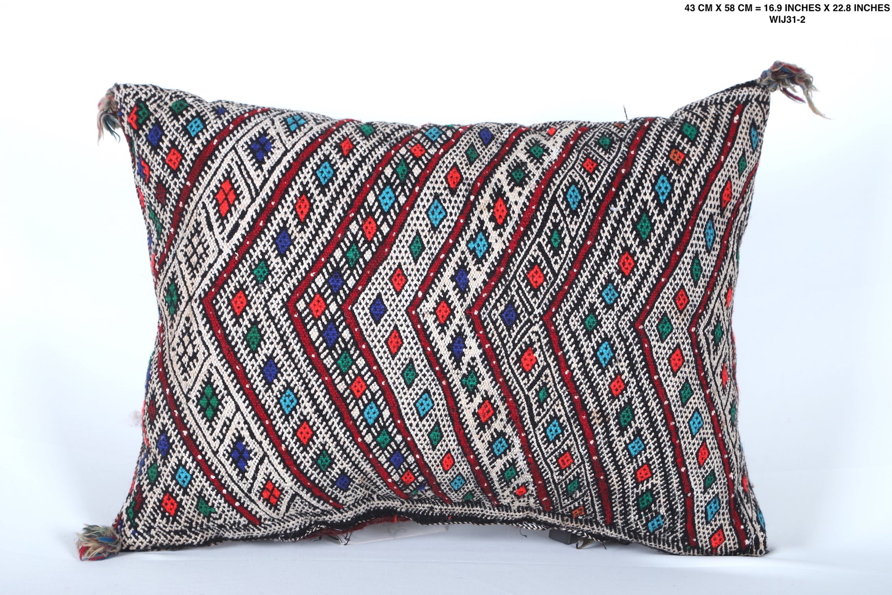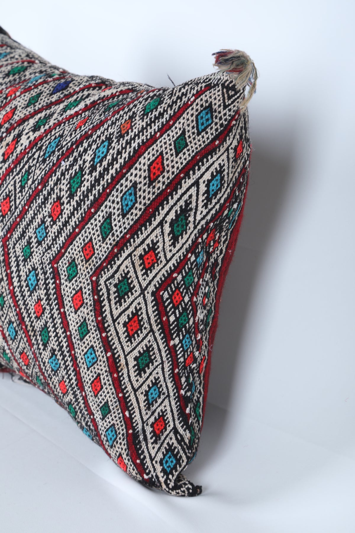 Add a bold pop of color and handcrafted artistry to your home with this handwoven Kilim Moroccan Pillow, sized at 16.9 x 22.8 inches (43 CM x 58 CM). Featuring intricate geometric patterns in rich red, black, and ivory hues, this pillow embodies the timeless beauty of Moroccan craftsmanship. Whether placed on a sofa, bed, or favorite chair, it brings warmth, culture, and texture to any living space.