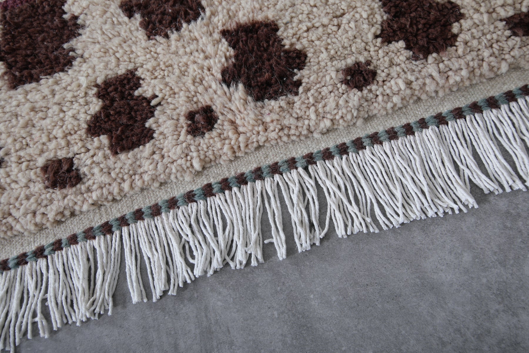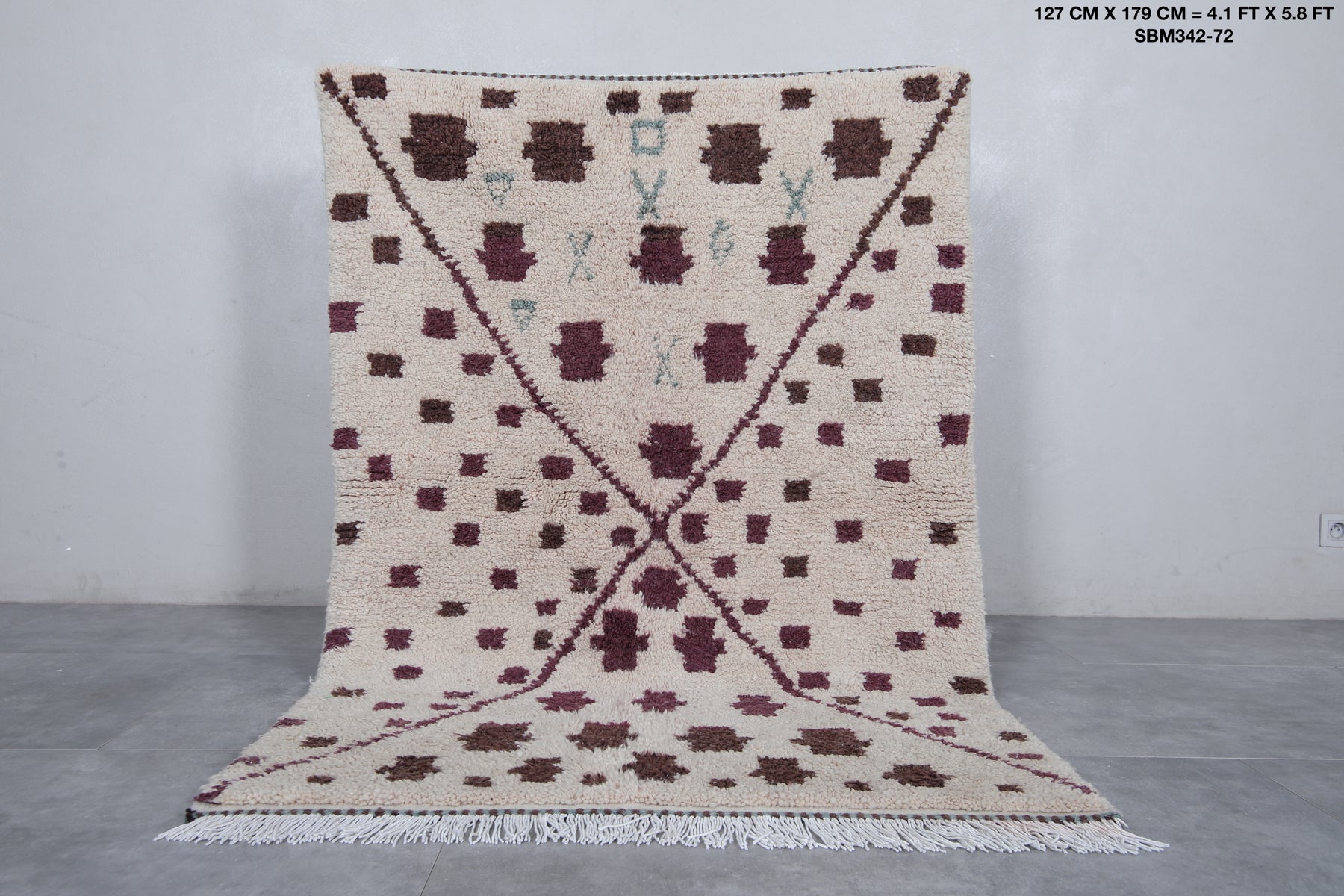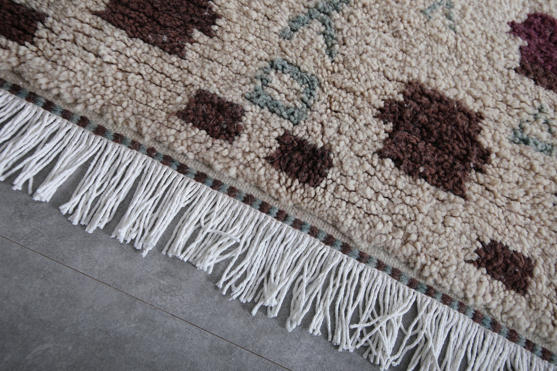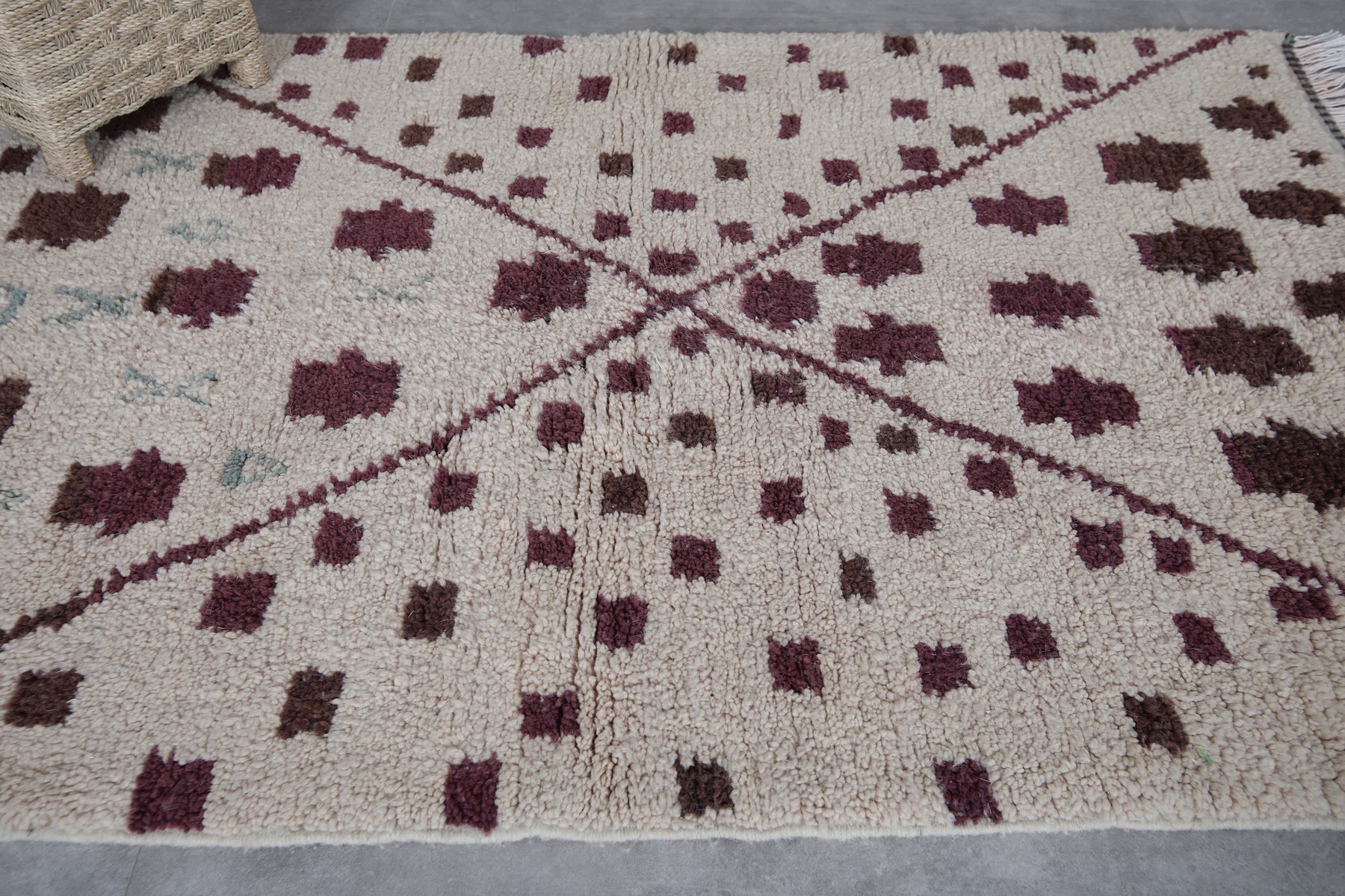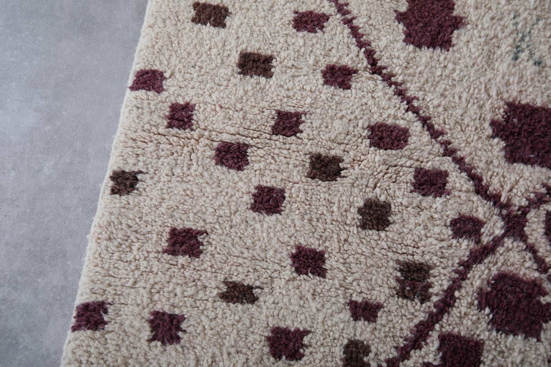 Introduce a touch of bohemian charm to your space with this Moroccan Azilal Rug, handwoven from high-quality natural wool. Measuring 4.1 x 5.8 feet (127 CM x 179 CM), this unique rug features an ivory base adorned with intricate burgundy, green, and brown tribal patterns. Its artistic design and vibrant colors make it a perfect accent piece for living rooms, bedrooms, or creative spaces. Plush and durable, this handmade rug offers comfort underfoot while enhancing your decor with traditional Moroccan craftsmanship. Shop now to bring a bold, artistic statement to your home!