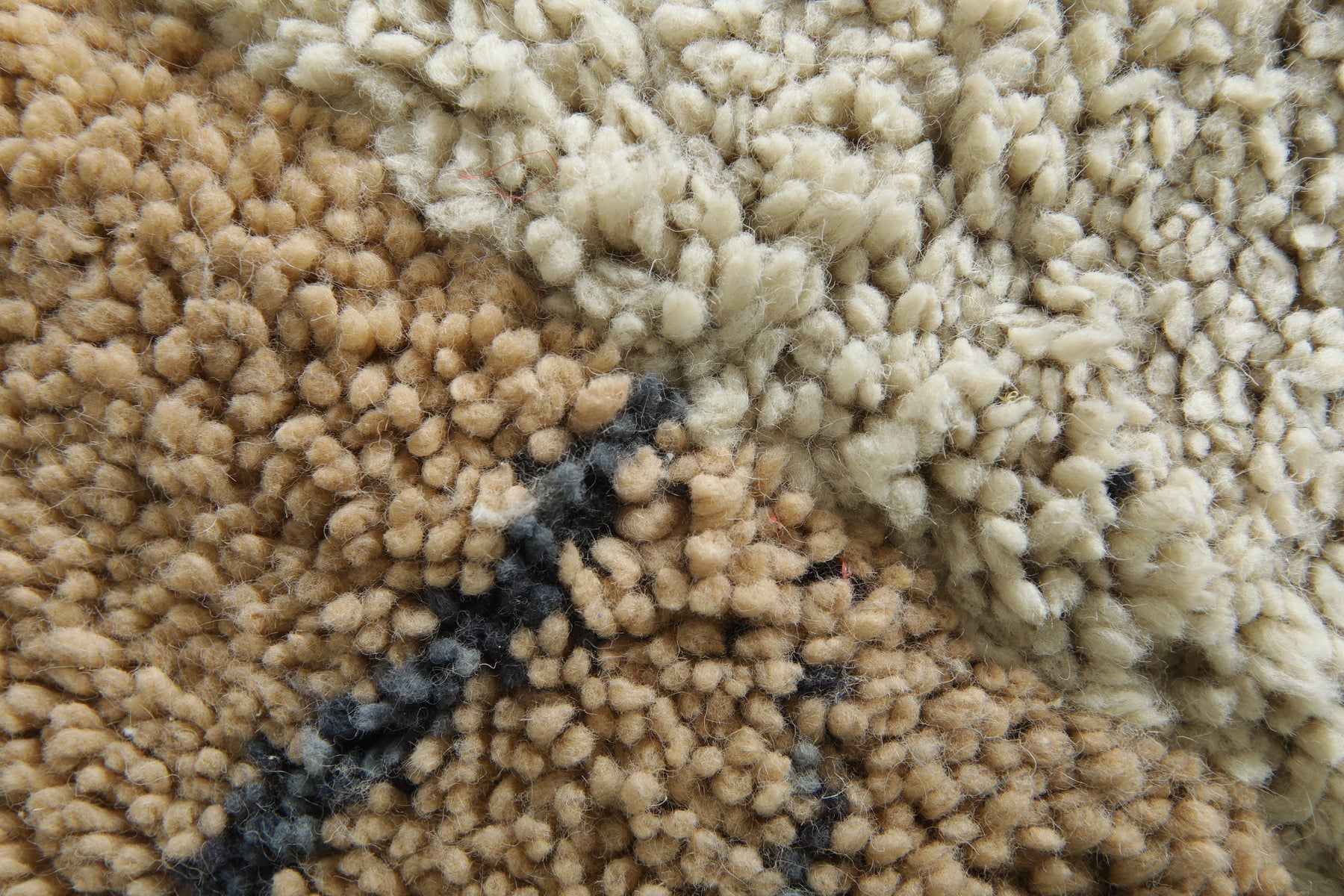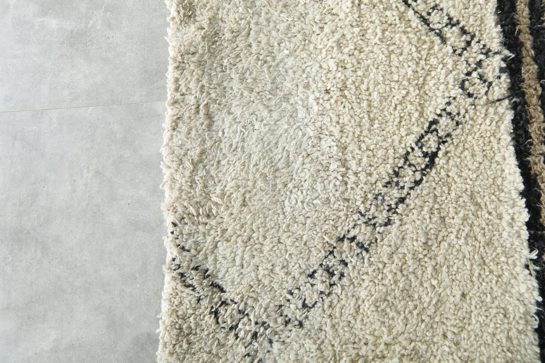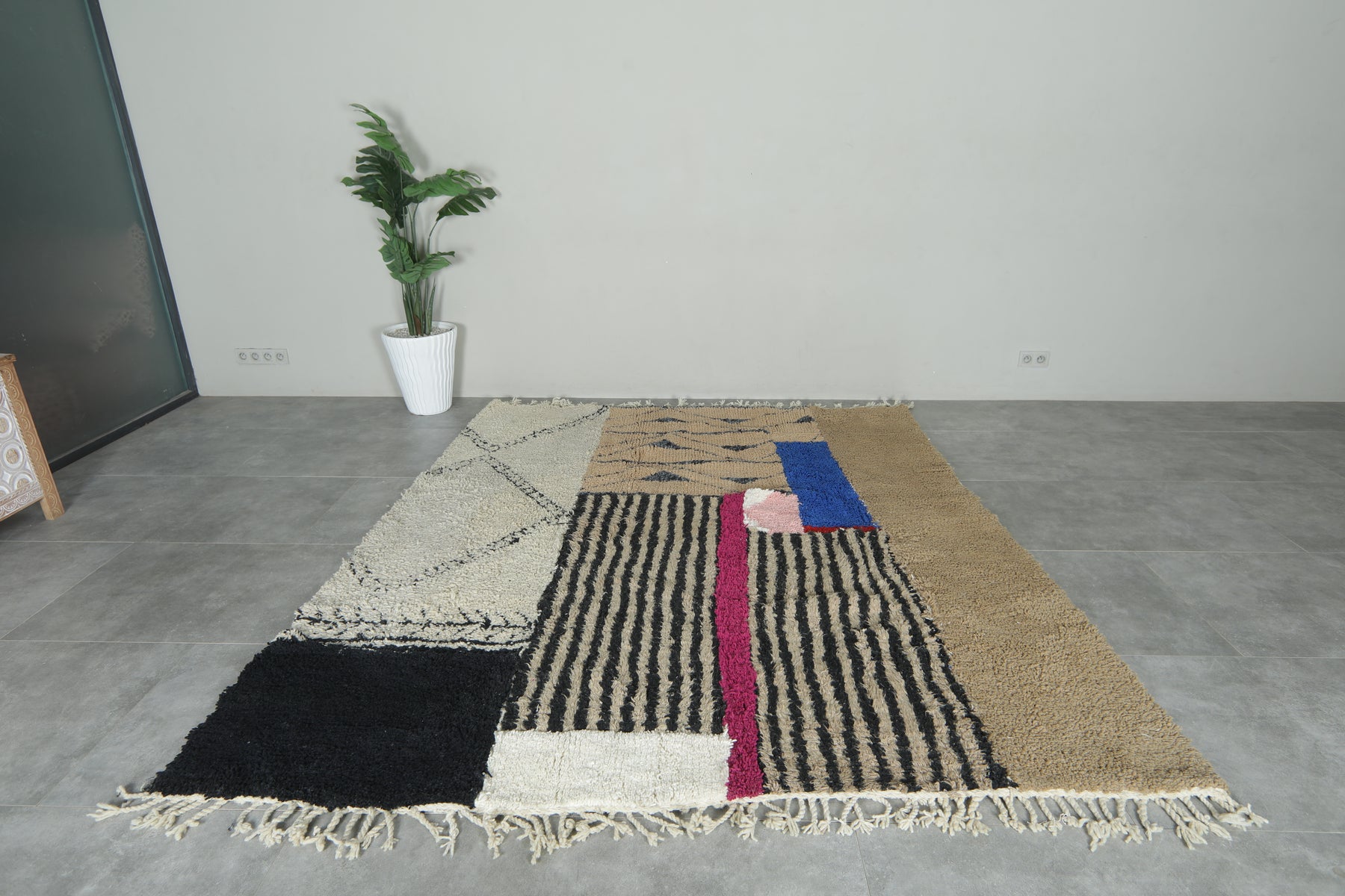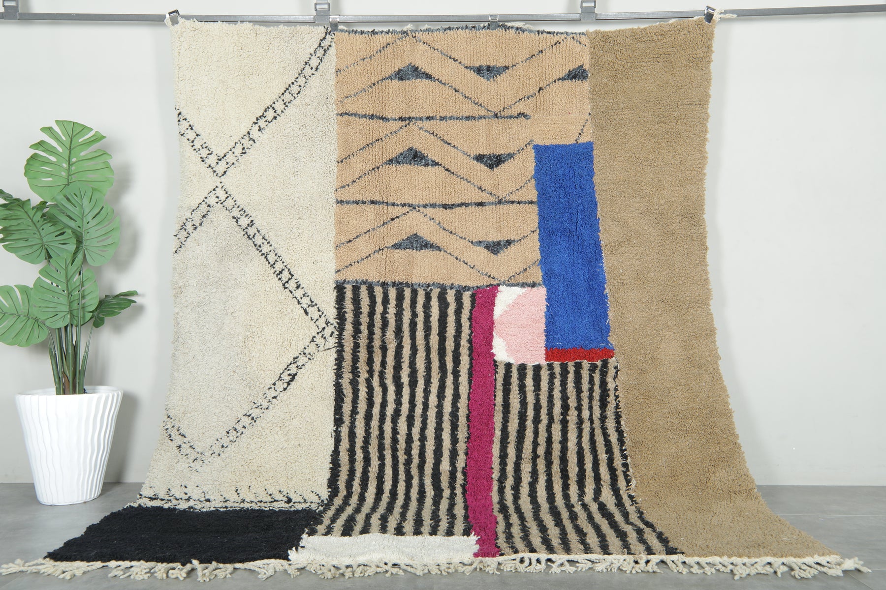 Crafted from 100% natural wool, this Moroccan rug showcases bold artistry rooted in Berber tradition. Its design combines a creamy ivory field with black diamond outlines, earthy beige panels, bold black stripes, and colorful accents of cobalt blue, blush pink, and deep red. The mix of geometric shapes and vibrant color blocking creates a contemporary statement while preserving authentic tribal heritage. With its soft, plush texture, this rug adds warmth, character, and timeless style to living rooms, bedrooms, or creative interiors.