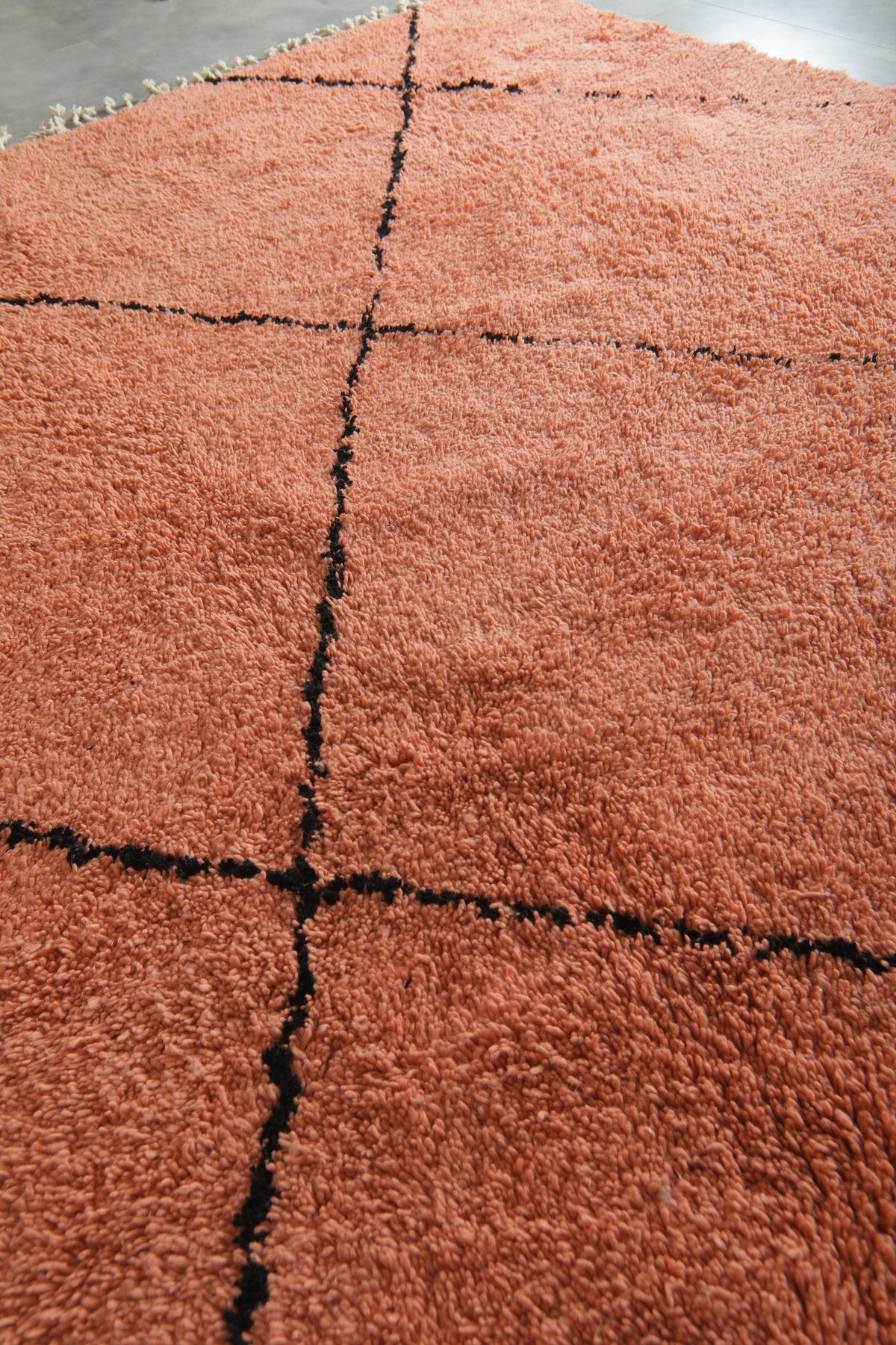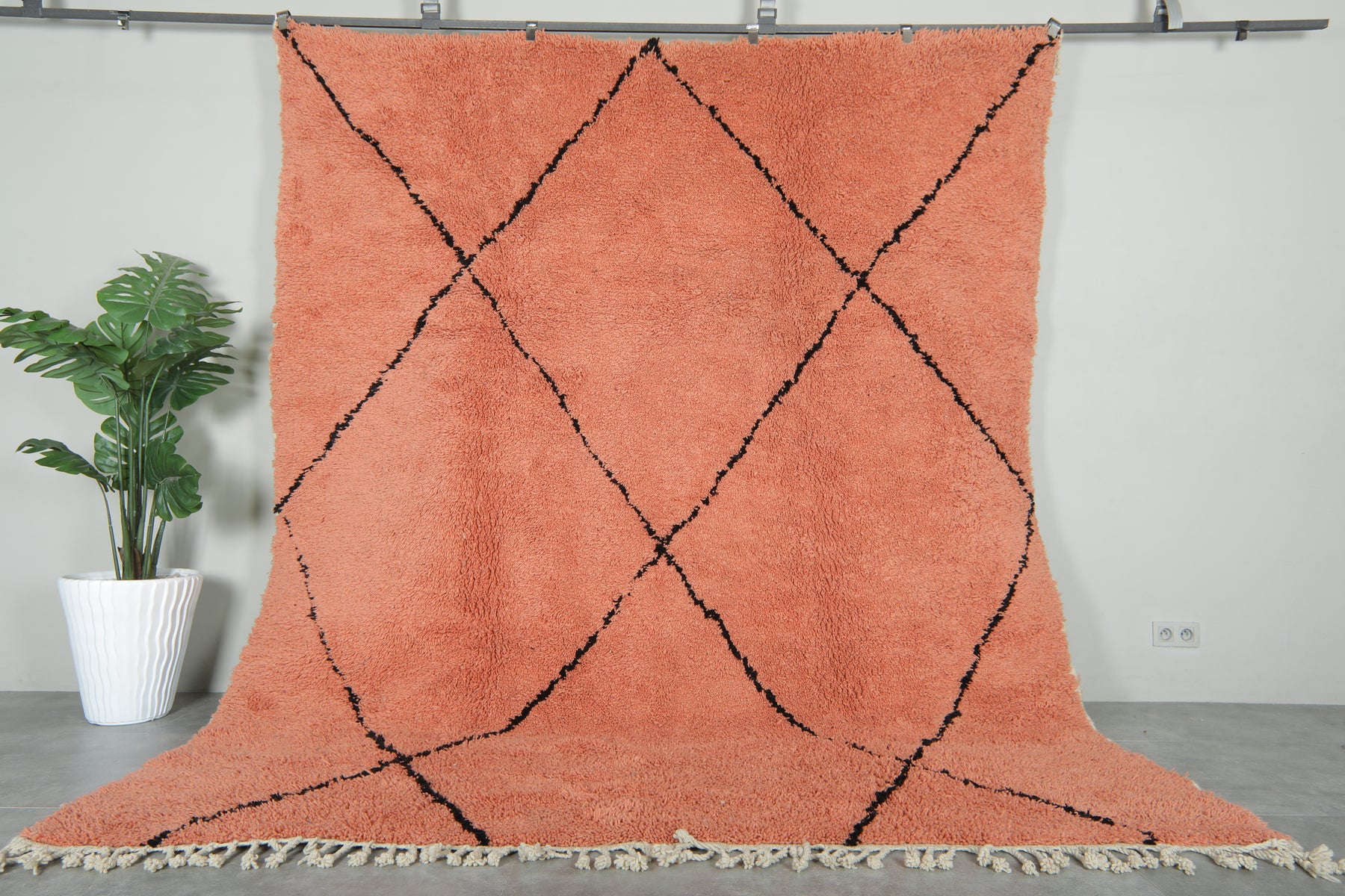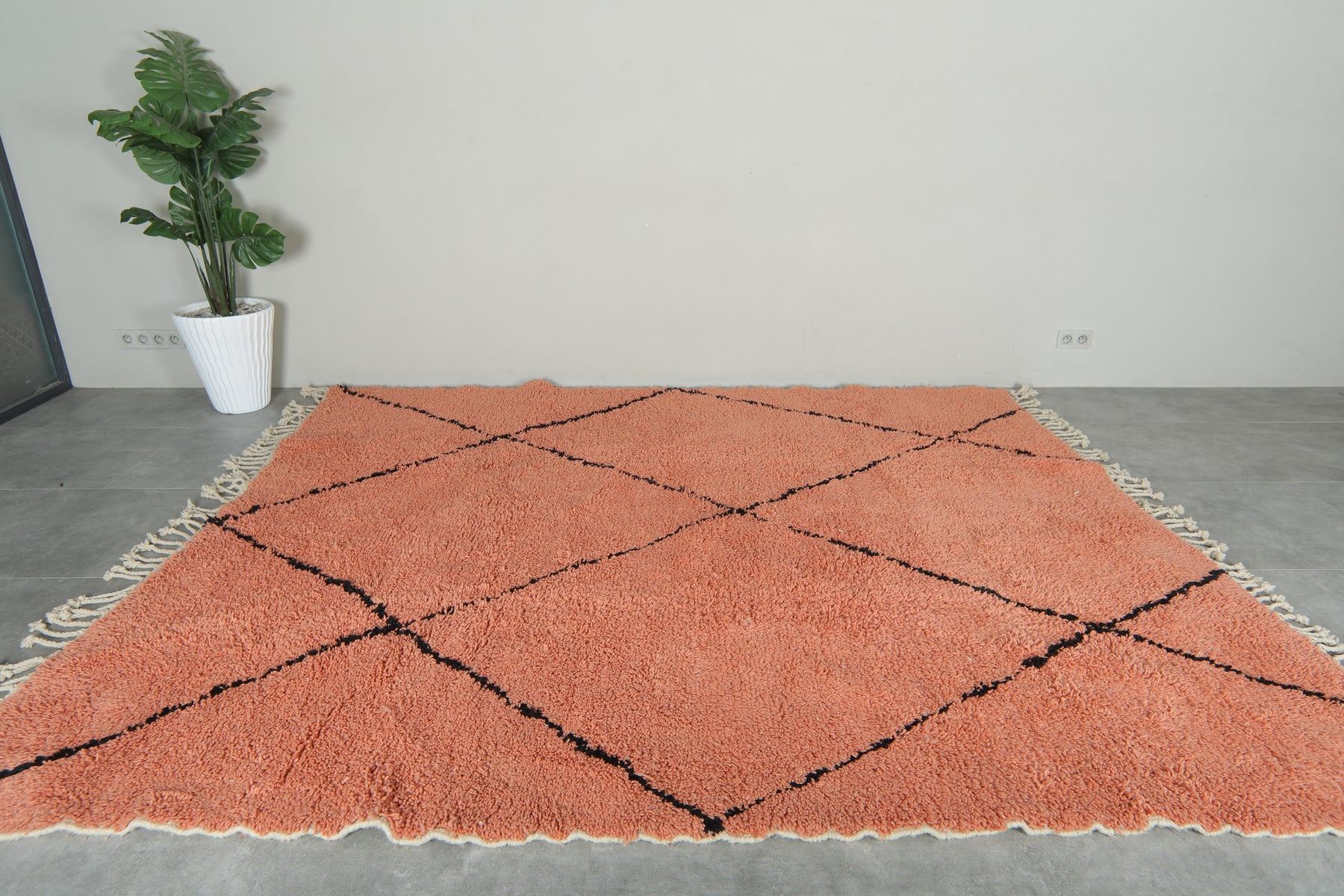 Add warmth and modern Moroccan charm to your space with this peach Beni Ourain rug, handwoven from 100% natural wool by Berber artisans in the Atlas Mountains. Its soft peach base is beautifully contrasted with bold black diamond lines, creating a timeless geometric design. Plush underfoot and finished with traditional fringes, this rug is perfect for adding comfort and style to living rooms, bedrooms, or creative spaces. A unique piece that blends Moroccan heritage with contemporary elegance.