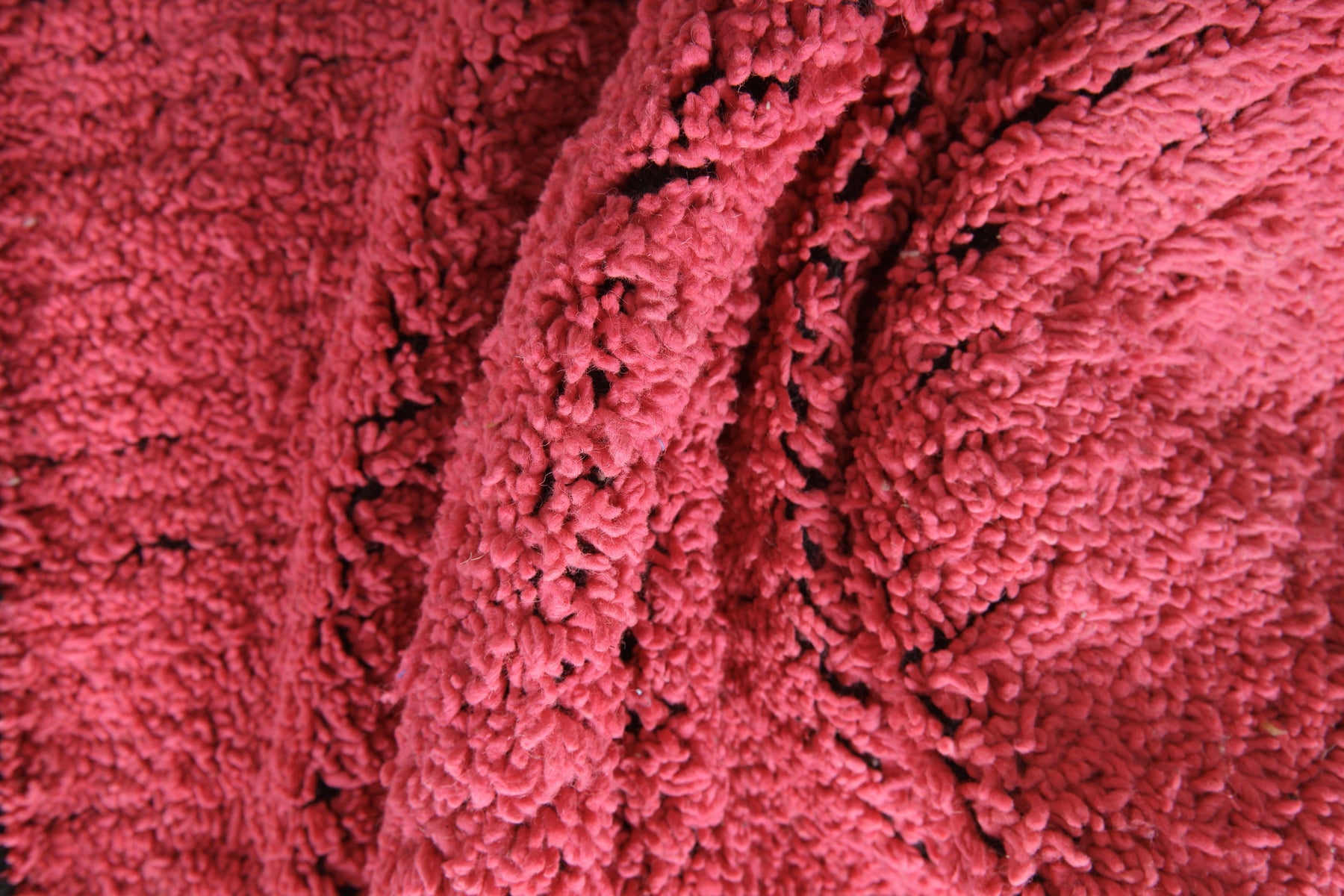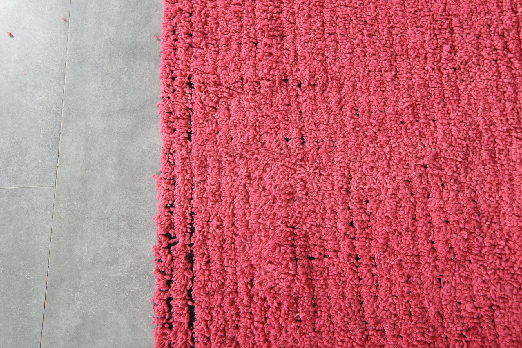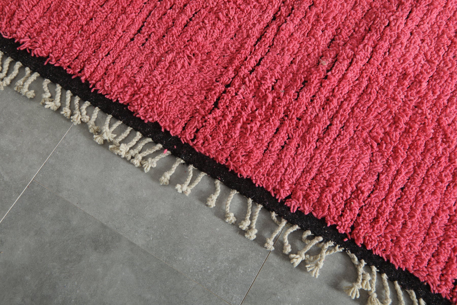 Bring a bold pop of color and sumptuous texture to your space with this hot pink & black minimalist rug. Hand-knotted from high-quality natural wool, this piece features a luxuriously high pile and a distinct, almost shag-like texture that feels incredible underfoot. The deep, vibrant pink is beautifully offset by a thin black border, offering a contemporary Moroccan style. Perfect for grounding a minimalist room or adding a cheerful, electric energy to a living area, bedroom, or studio. Its uncomplicated pattern keeps the focus squarely on its intense color and rich texture.