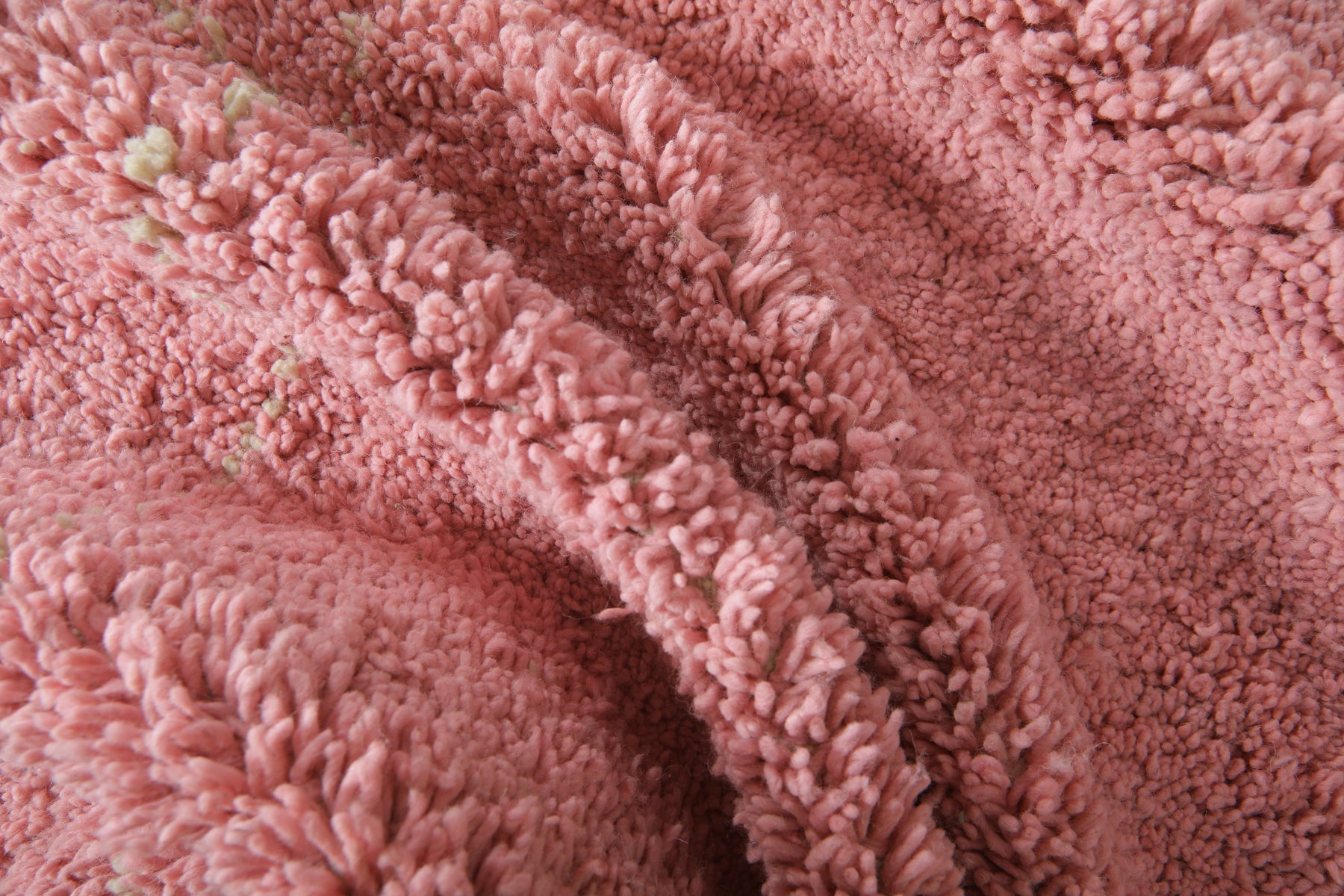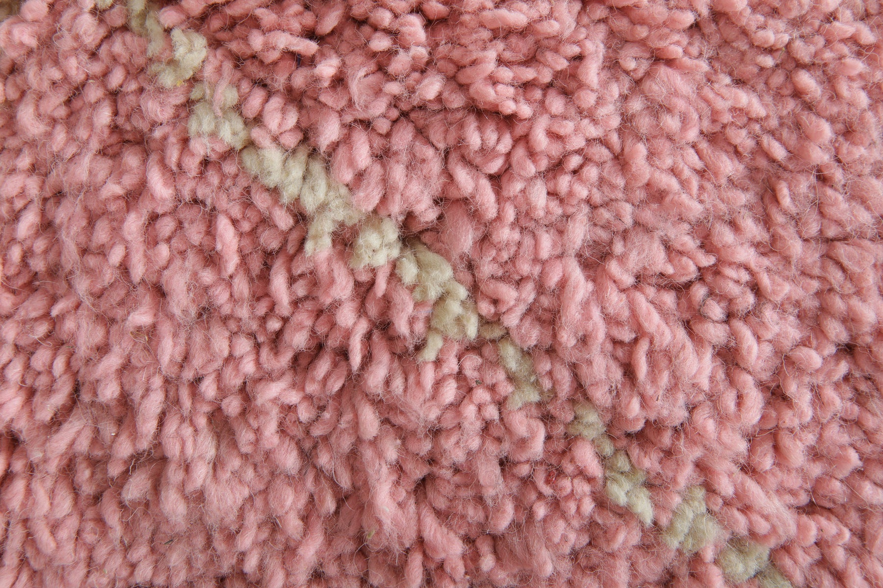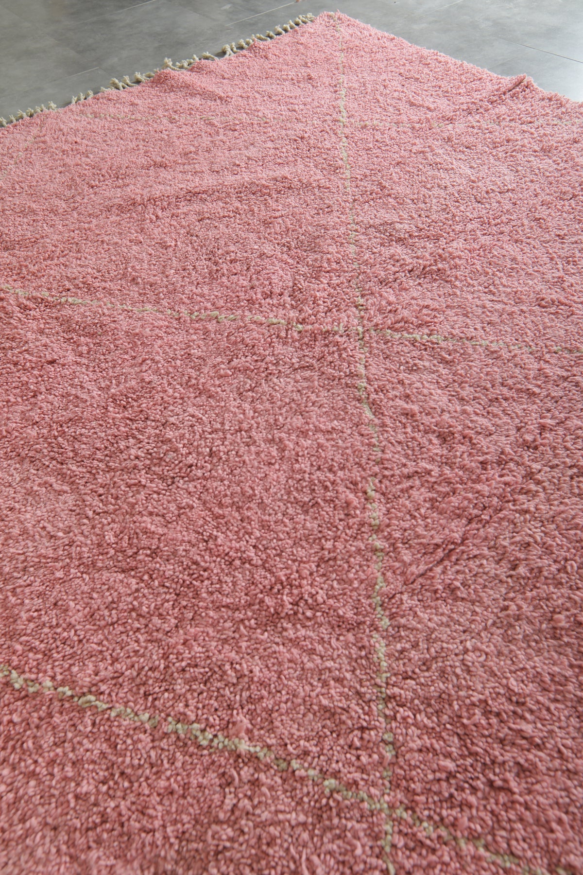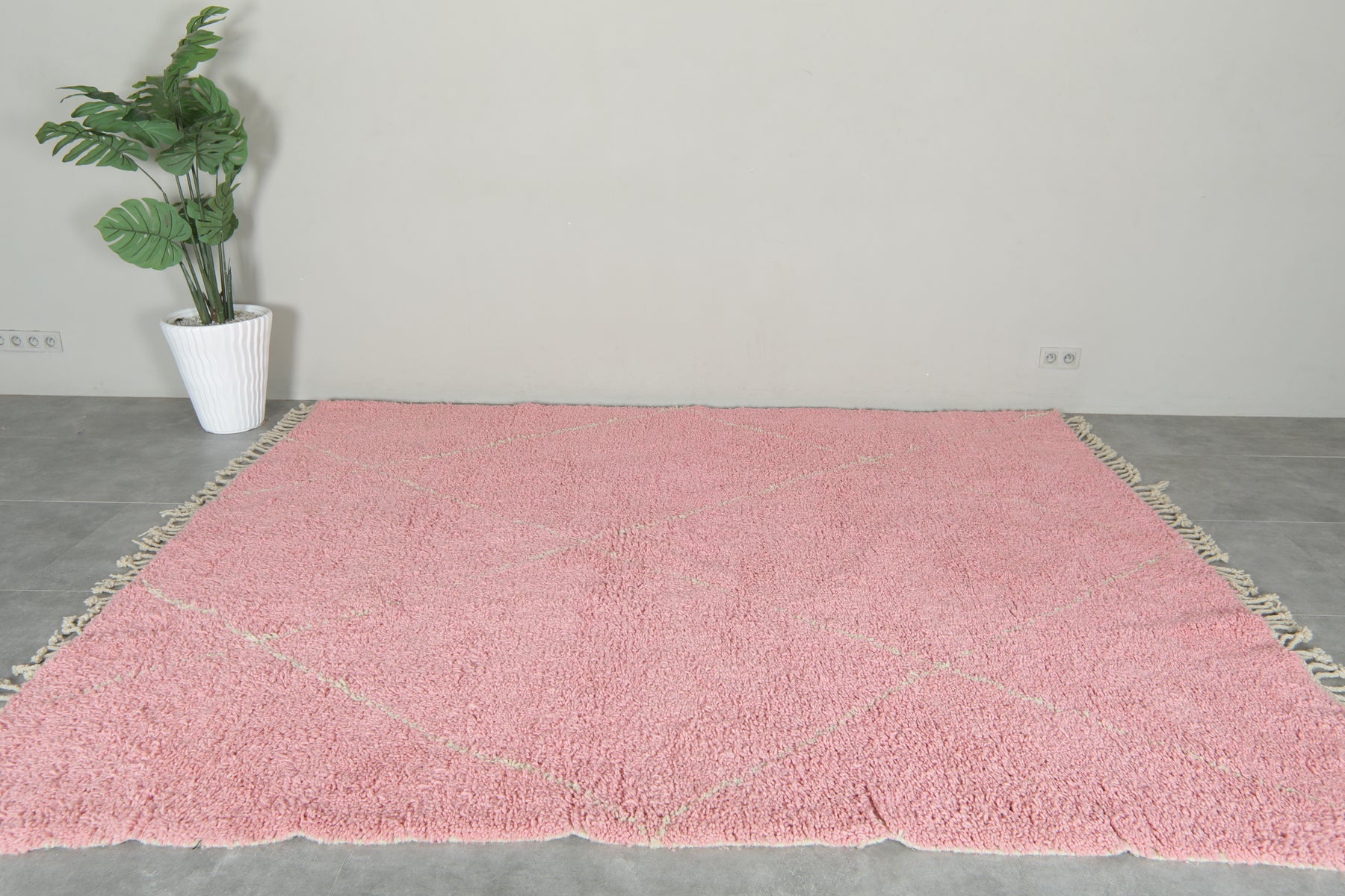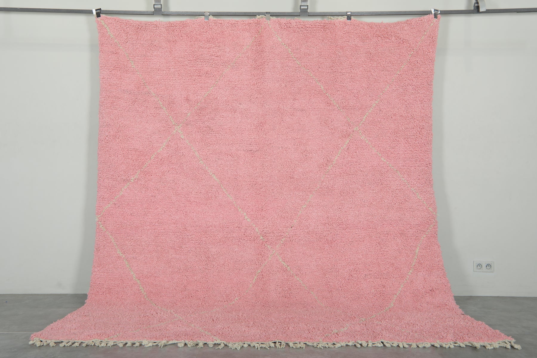 This handwoven Moroccan beni ourain rug features a generous size and a plush wool texture in a soft, dusty pink base. A delicate beige diamond pattern in lighter tones adds quiet elegance and visual depth without overwhelming the space. Finished with a fringe detail along the bottom edge, this piece blends traditional Berber craftsmanship with a modern, romantic palette. Ideal for bedrooms, living rooms, or creative studios seeking warmth and softness.