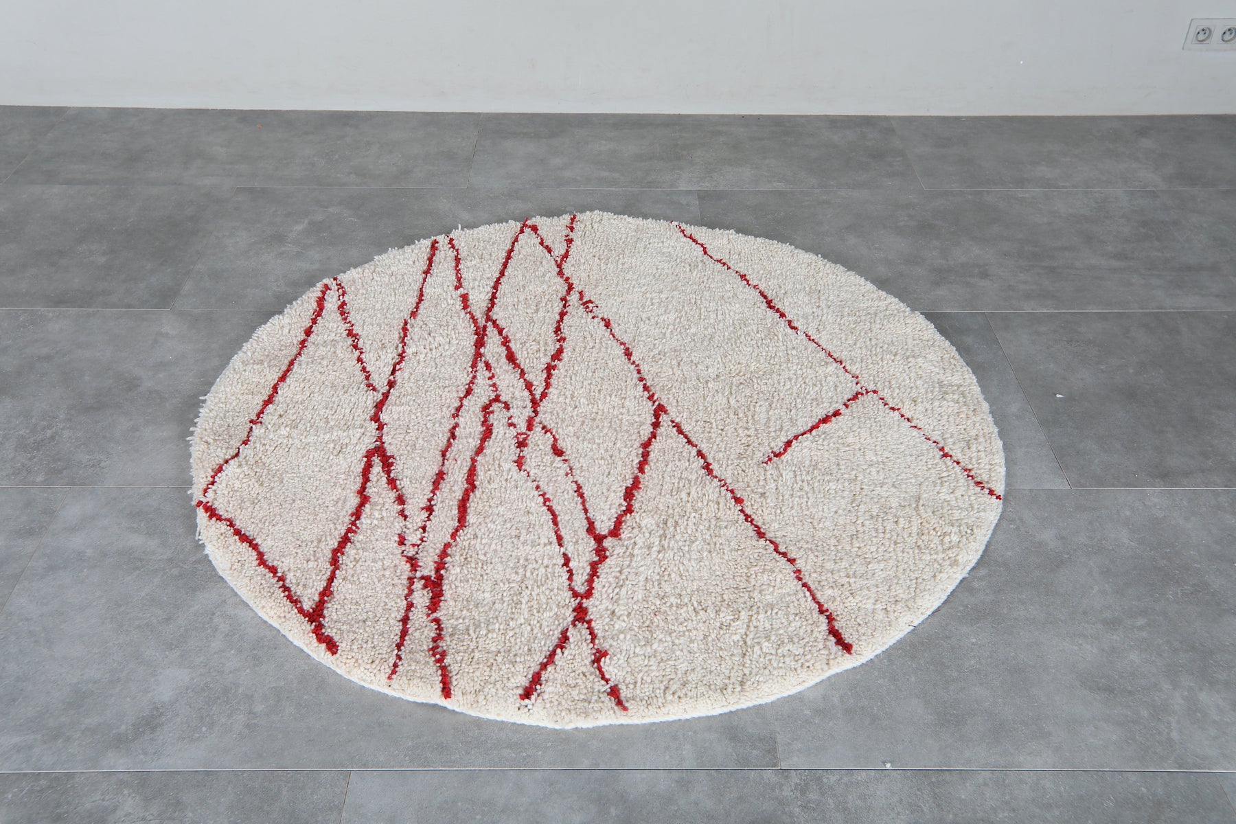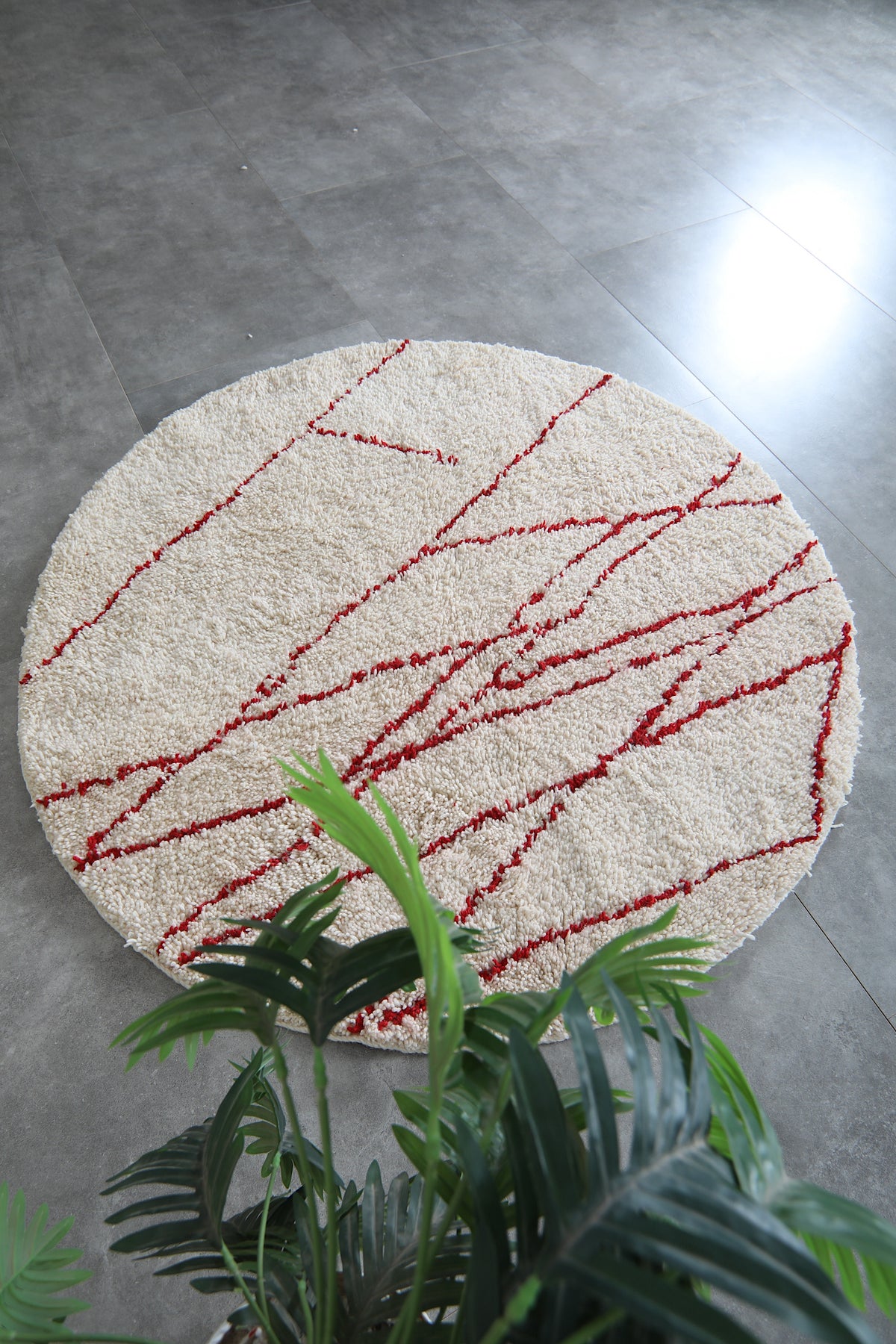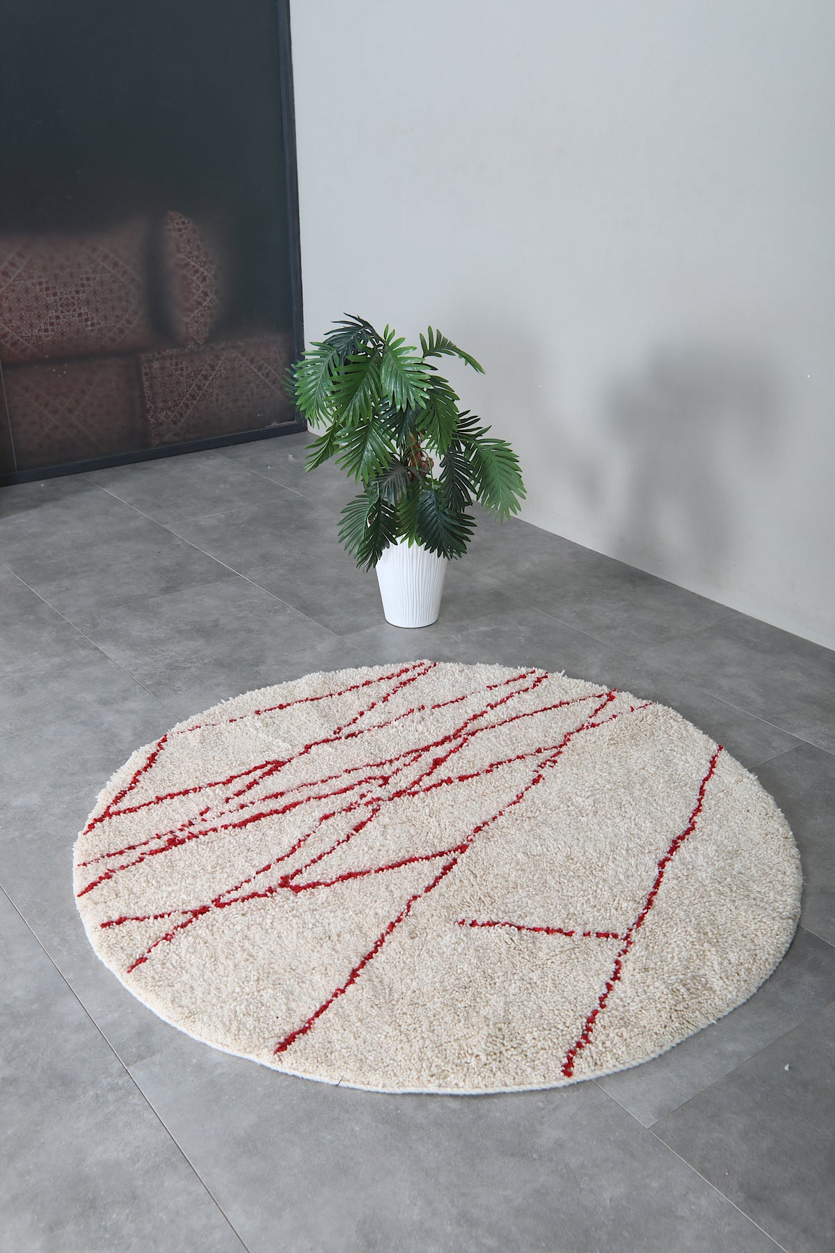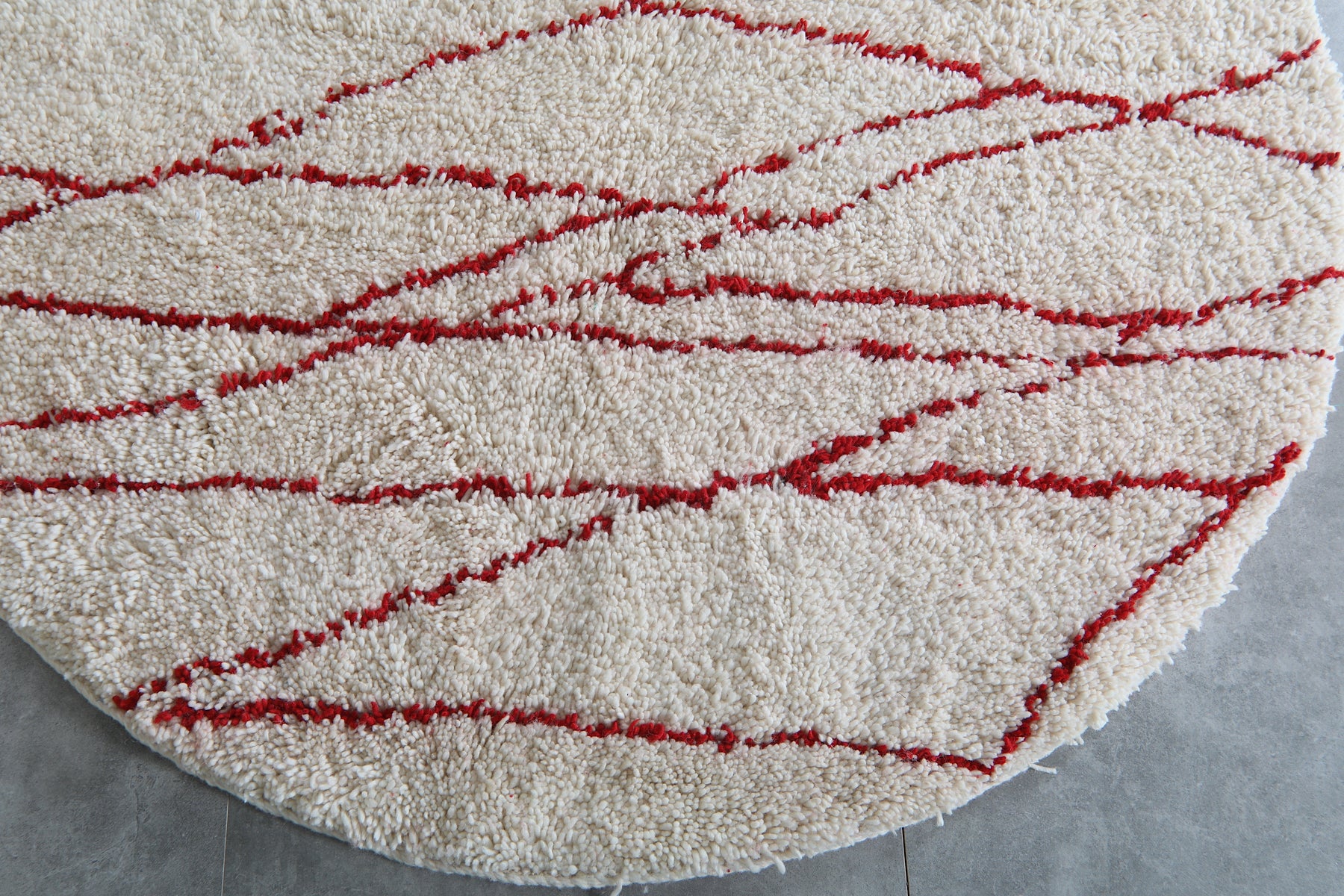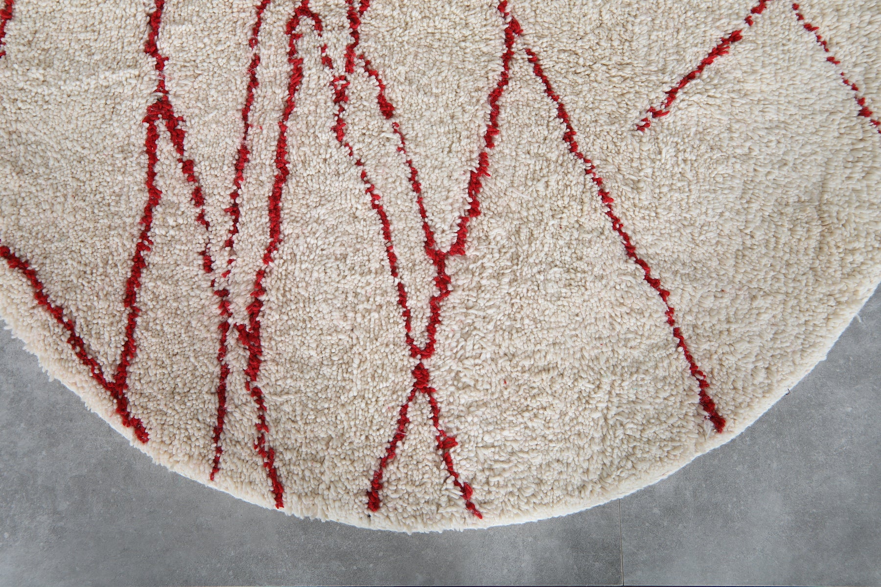 Handcrafted in Morocco, this striking round rug showcases authentic Berber weaving traditions with a contemporary edge. The bold red and cream palette creates visual impact while the abstract linear design brings modern sophistication to any space. Constructed from premium wool, this piece offers durability and natural warmth underfoot. Each rug is individually made, ensuring unique character and quality craftsmanship. Perfect for defining living areas, bedrooms, or creative spaces seeking artisanal authenticity with refined aesthetics.