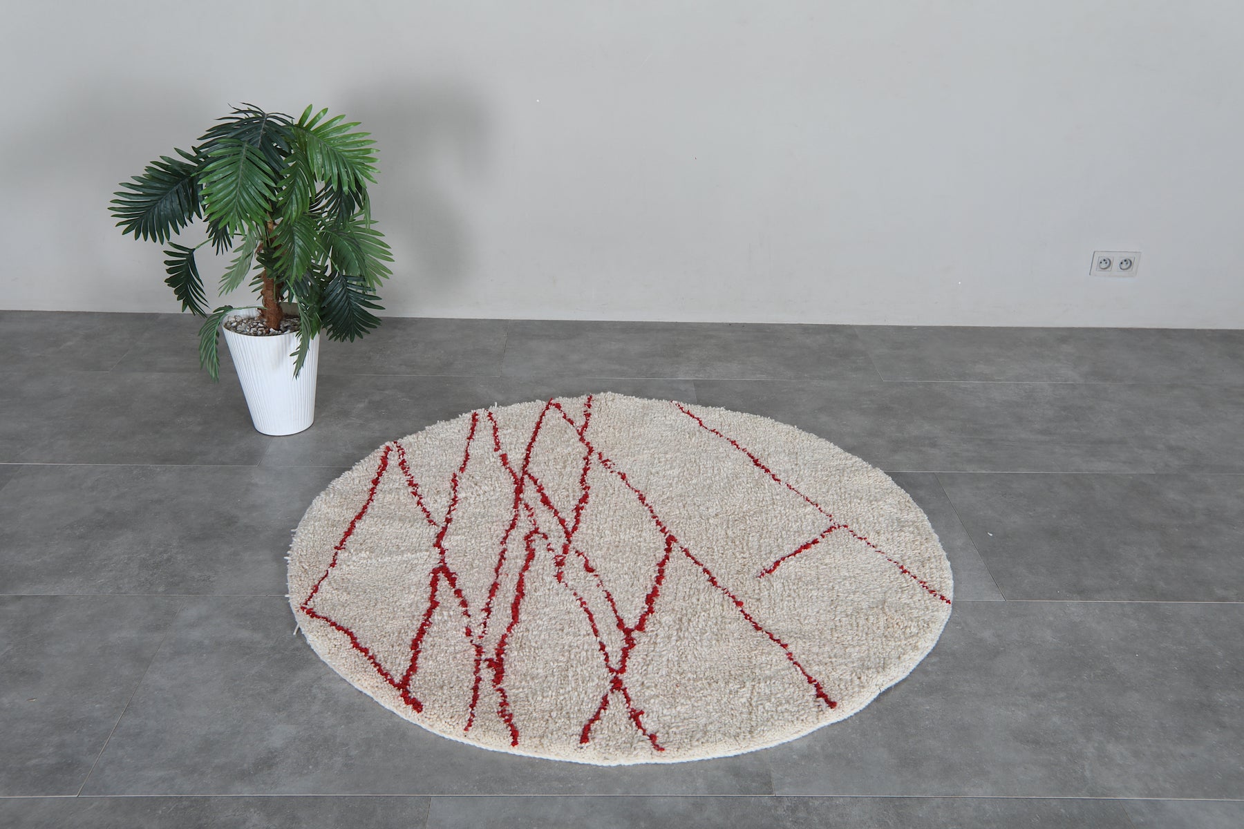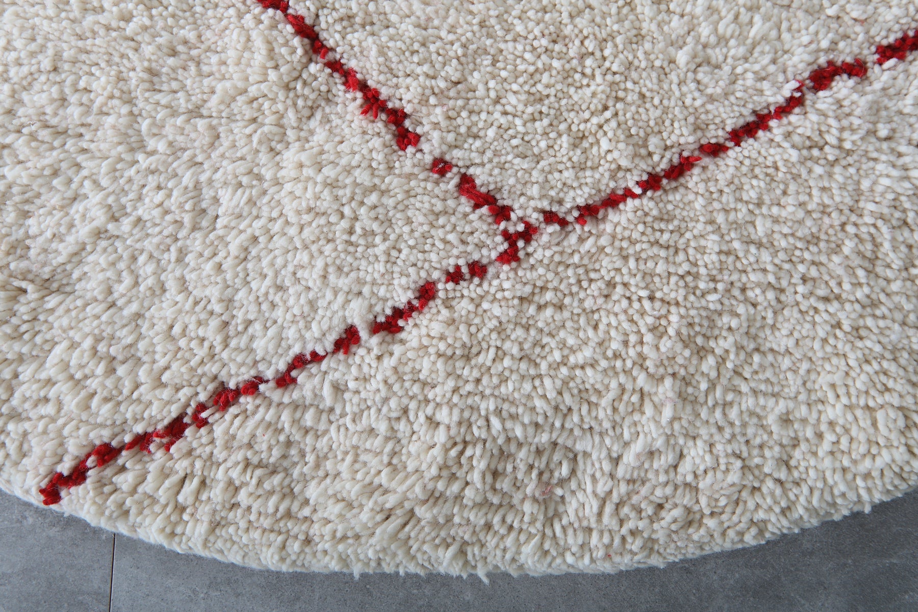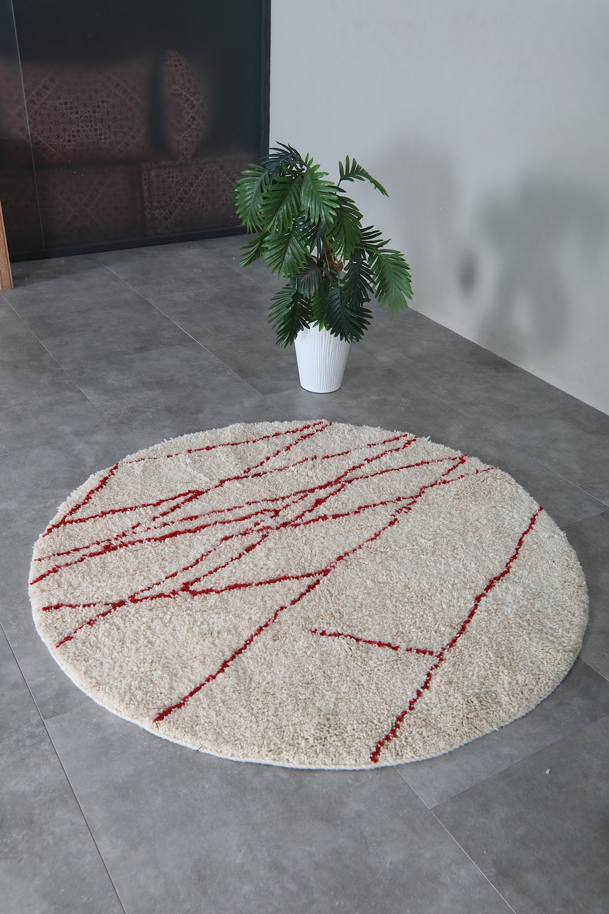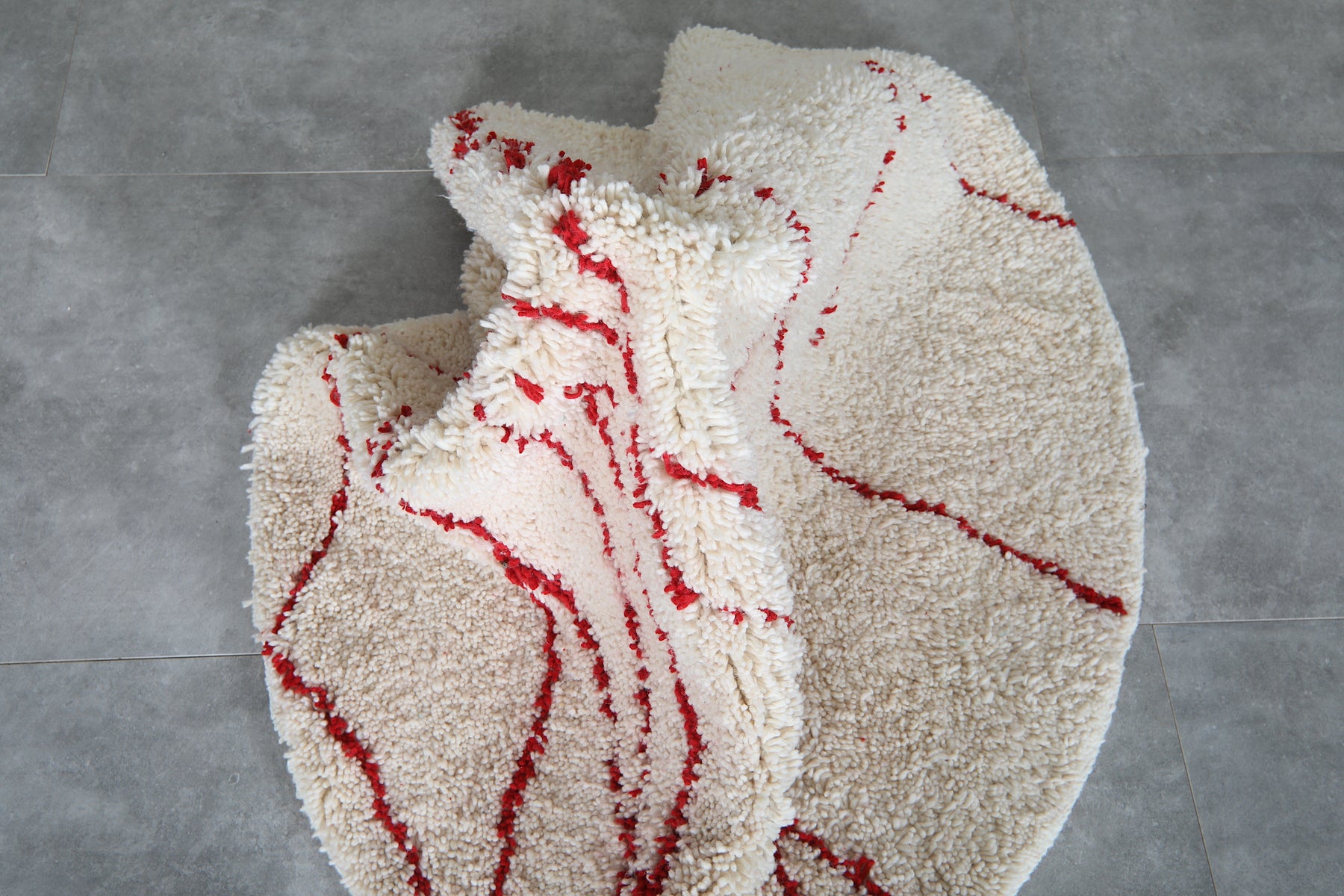 Handcrafted in Morocco, this striking round rug showcases authentic Berber weaving traditions with a contemporary edge. The bold red and cream palette creates visual impact while the abstract linear design brings modern sophistication to any space. Constructed from premium wool, this piece offers durability and natural warmth underfoot. Each rug is individually made, ensuring unique character and quality craftsmanship. Perfect for defining living areas, bedrooms, or creative spaces seeking artisanal authenticity with refined aesthetics.