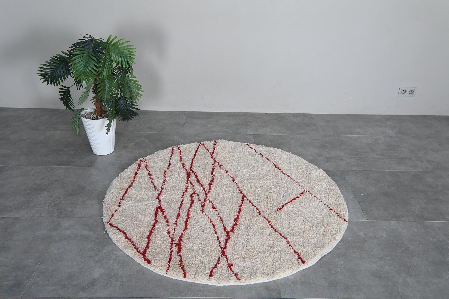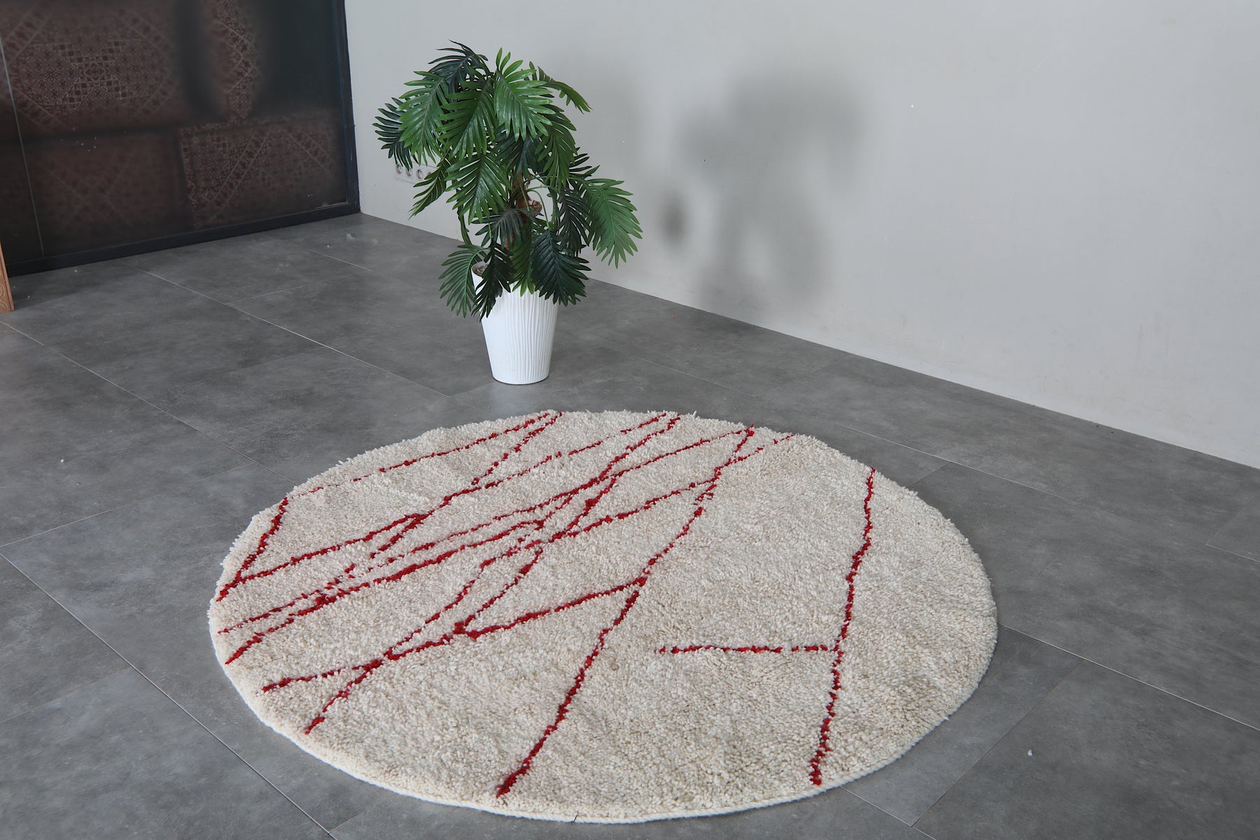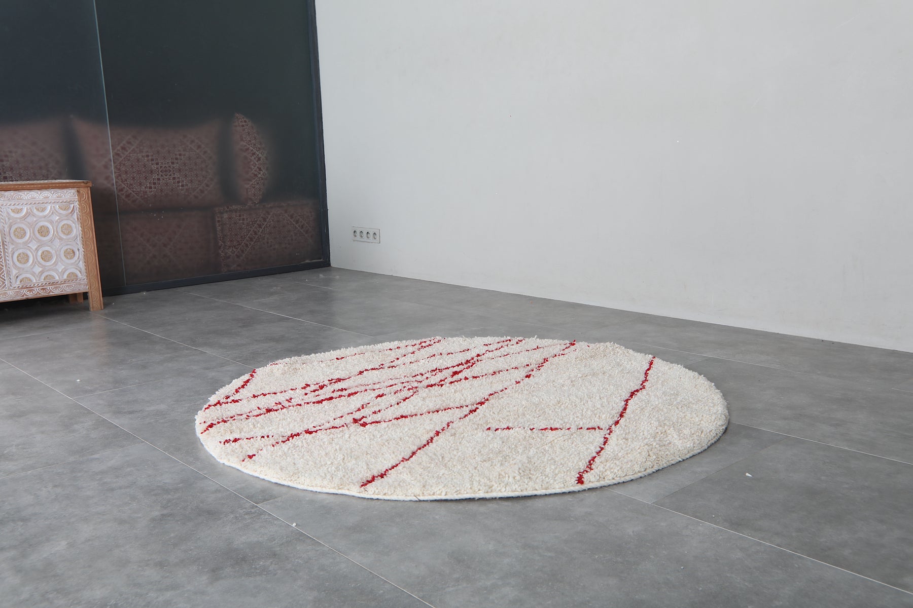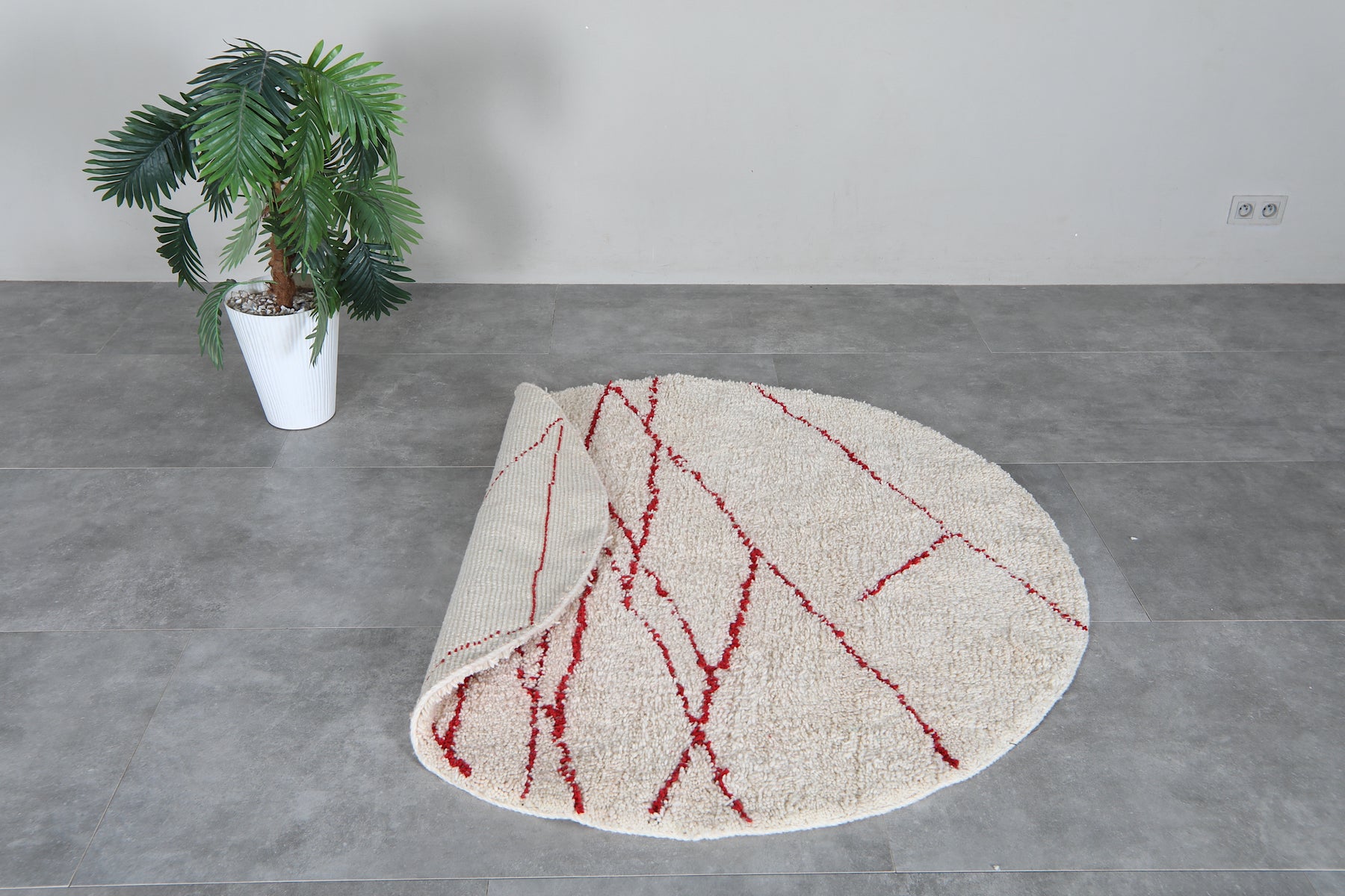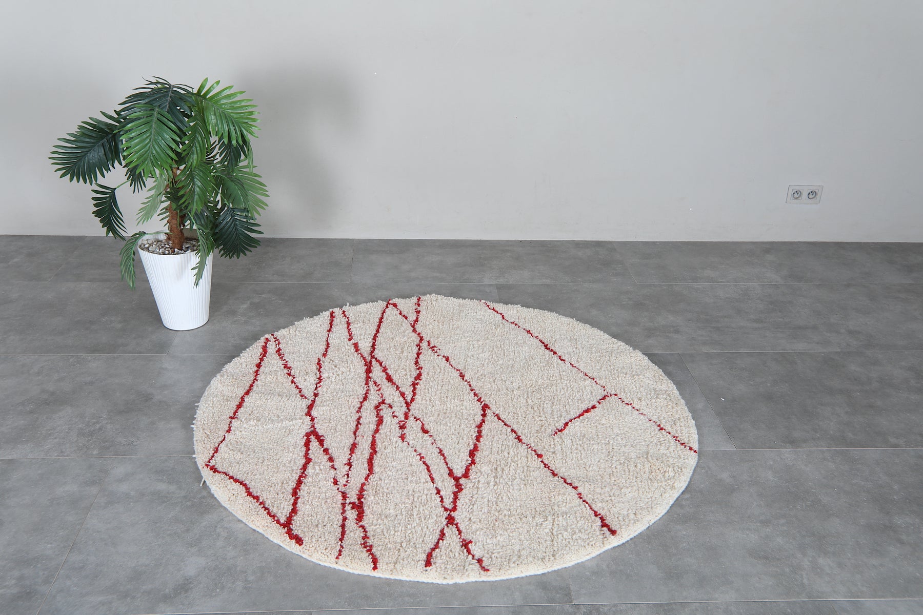 Handcrafted in Morocco, this striking round rug showcases authentic Berber weaving traditions with a contemporary edge. The bold red and cream palette creates visual impact while the abstract linear design brings modern sophistication to any space. Constructed from premium wool, this piece offers durability and natural warmth underfoot. Each rug is individually made, ensuring unique character and quality craftsmanship. Perfect for defining living areas, bedrooms, or creative spaces seeking artisanal authenticity with refined aesthetics.
