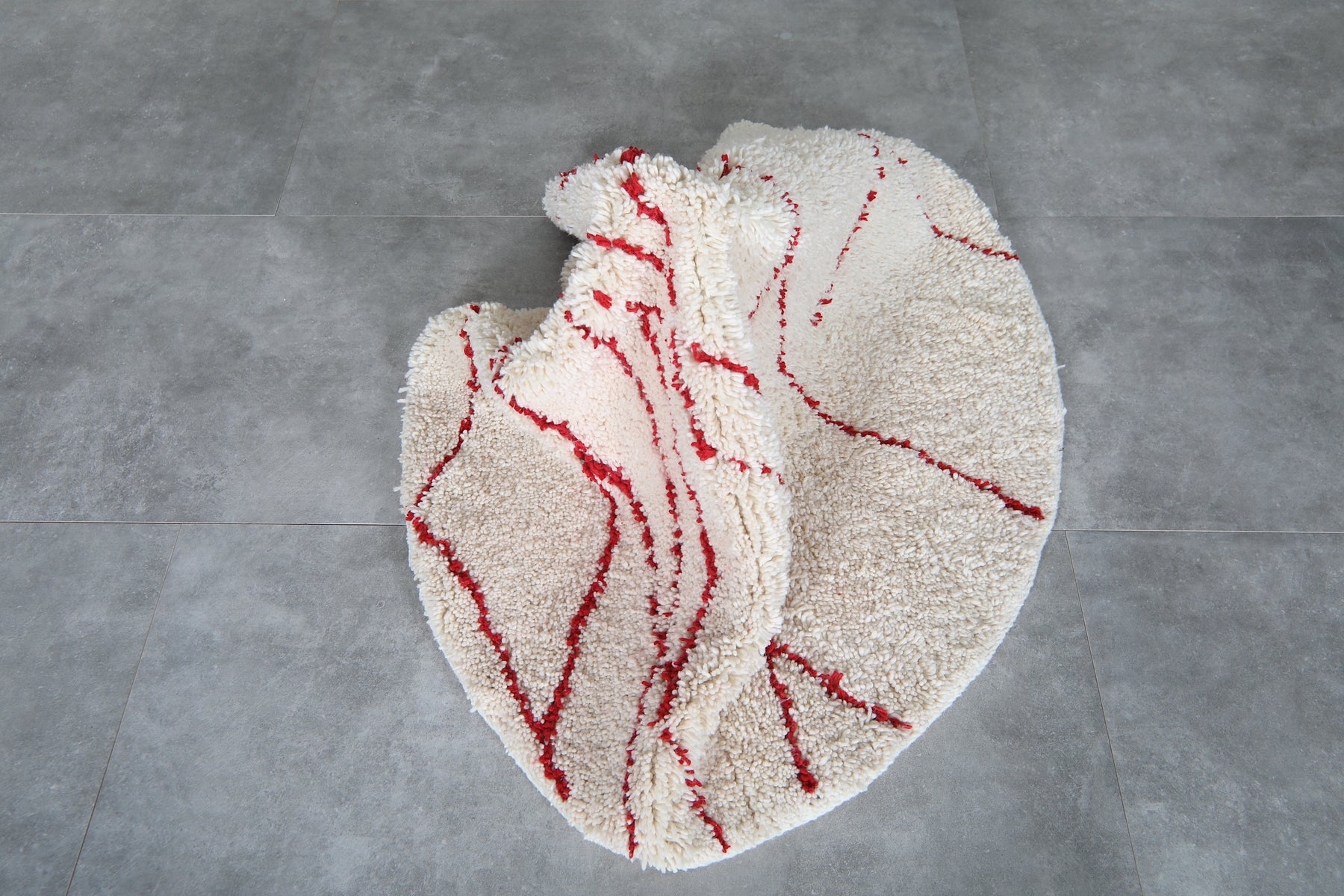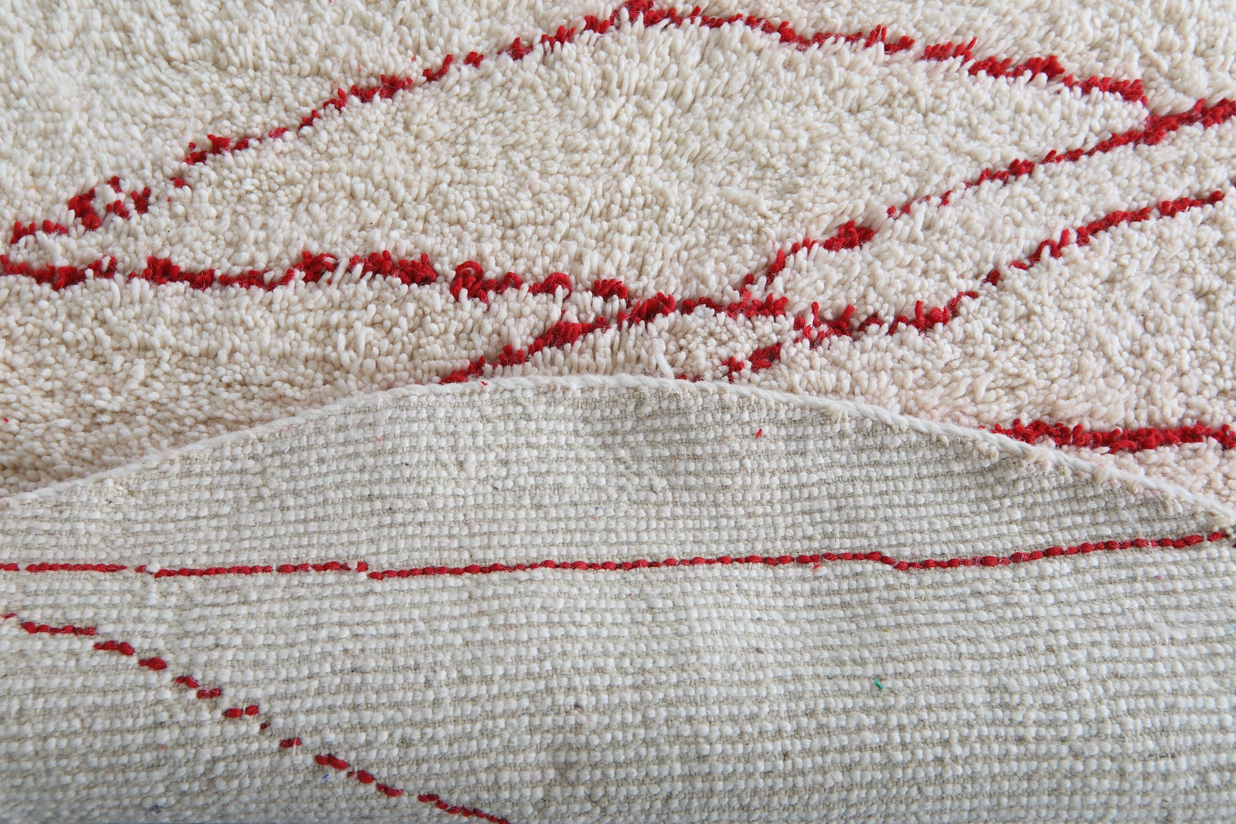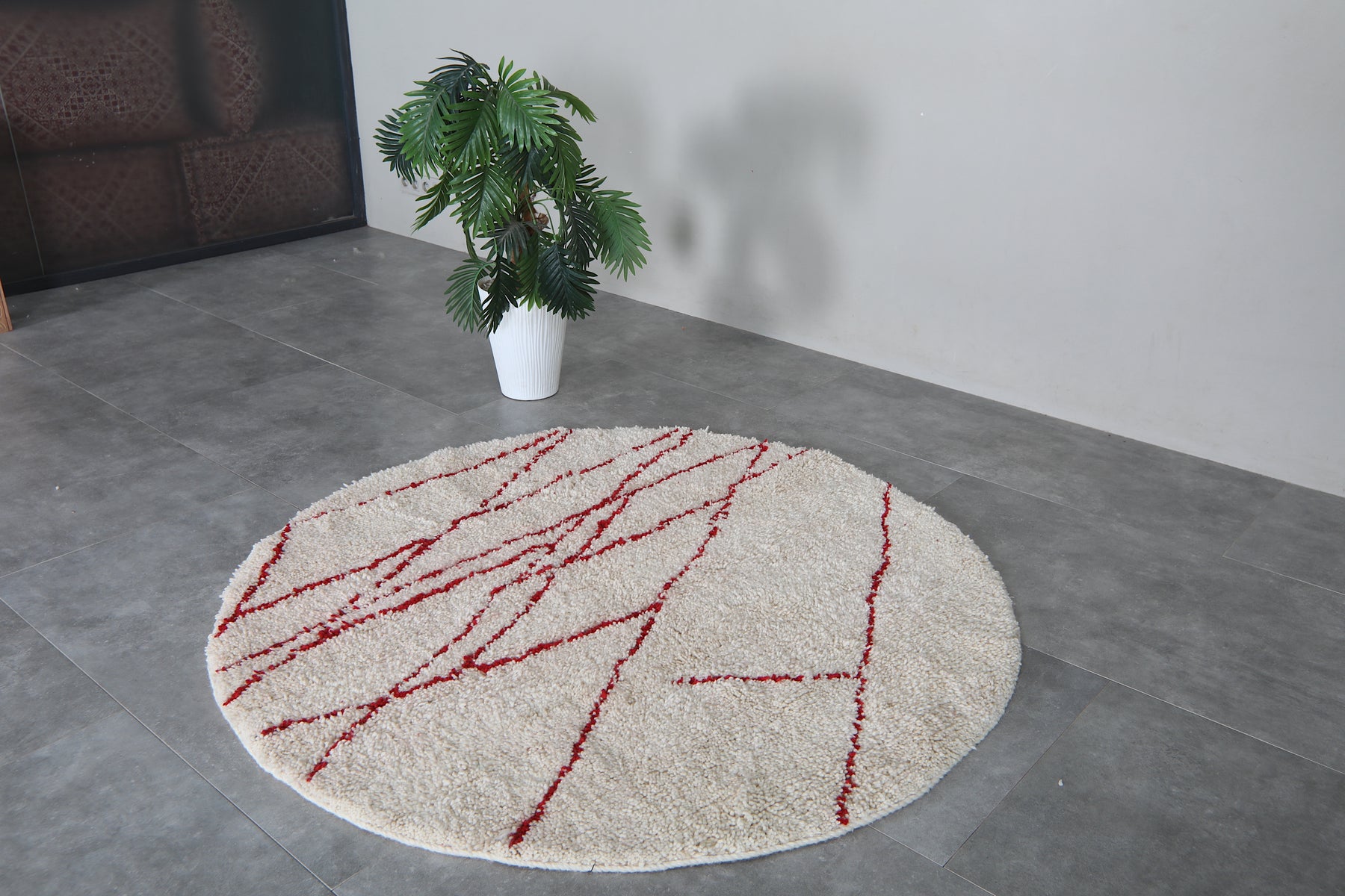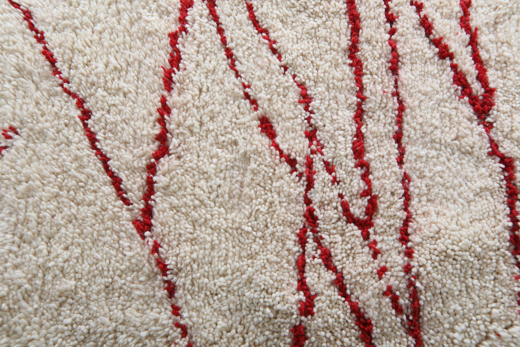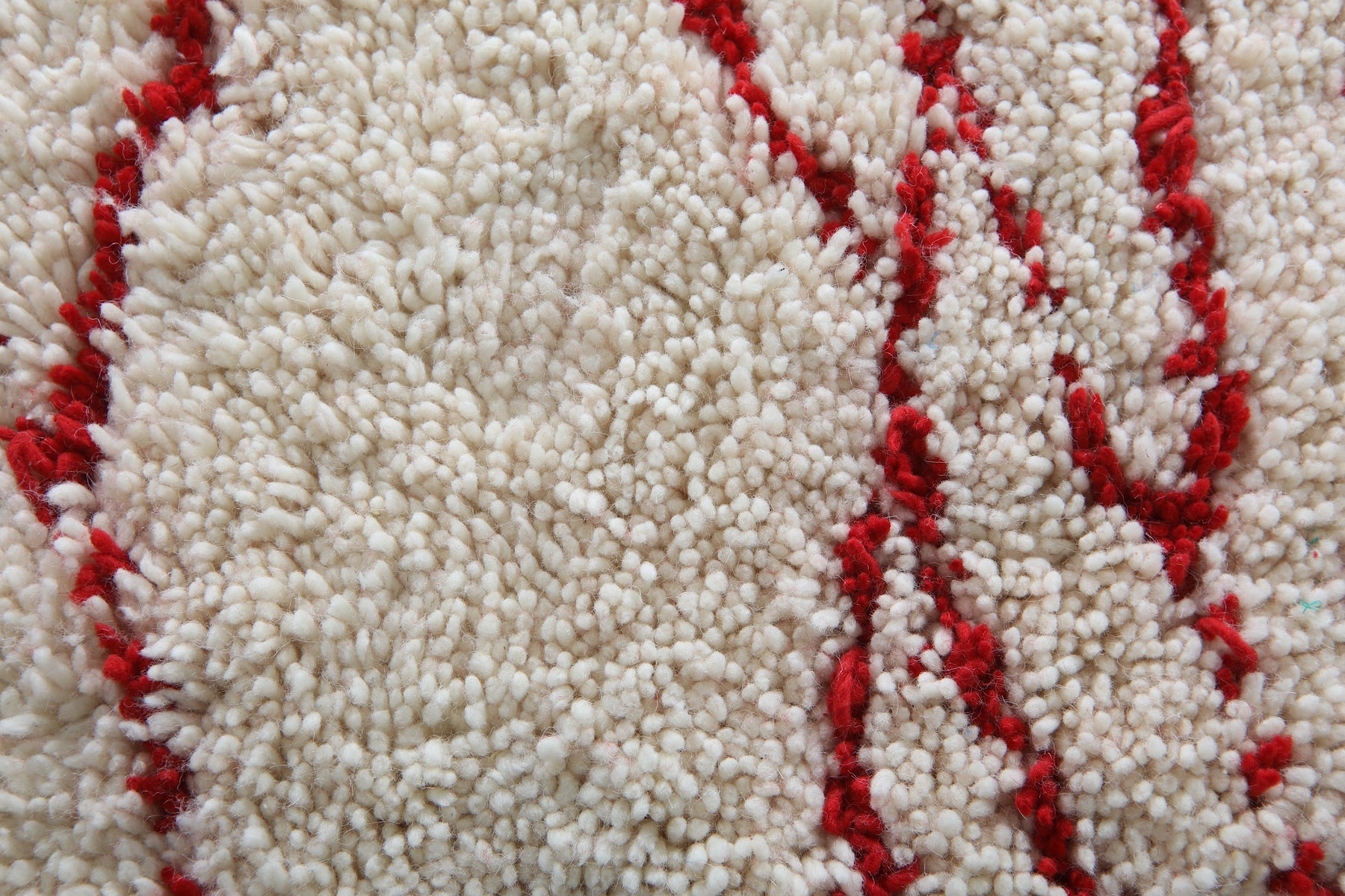 Handcrafted in Morocco, this striking round rug showcases authentic Berber weaving traditions with a contemporary edge. The bold red and cream palette creates visual impact while the abstract linear design brings modern sophistication to any space. Constructed from premium wool, this piece offers durability and natural warmth underfoot. Each rug is individually made, ensuring unique character and quality craftsmanship. Perfect for defining living areas, bedrooms, or creative spaces seeking artisanal authenticity with refined aesthetics.