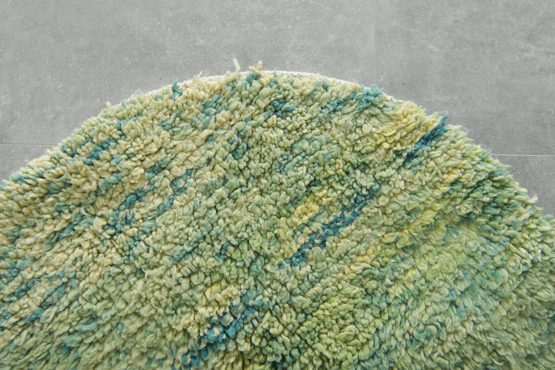 Bring the expressive folk art of Morocco into your home with this unique round Boucherouite rug. Unlike traditional monochromatic rugs, this piece celebrates color with a stunning, highly textured pile blending various shades of green, and yellow, accented by unexpected pops of teal blue. This cheerful, mottled color effect ensures the rug works beautifully in both neutral and richly colored spaces, adding depth and visual interest. The plush, shaggy pile is hand-woven, offering a luxurious and cozy feel underfoot. Its durable construction and unique circular shape make it an ideal accent for a nursery, a reading nook, or as a striking bath mat, effortlessly infusing your home with authentic Eclectic and global charm.