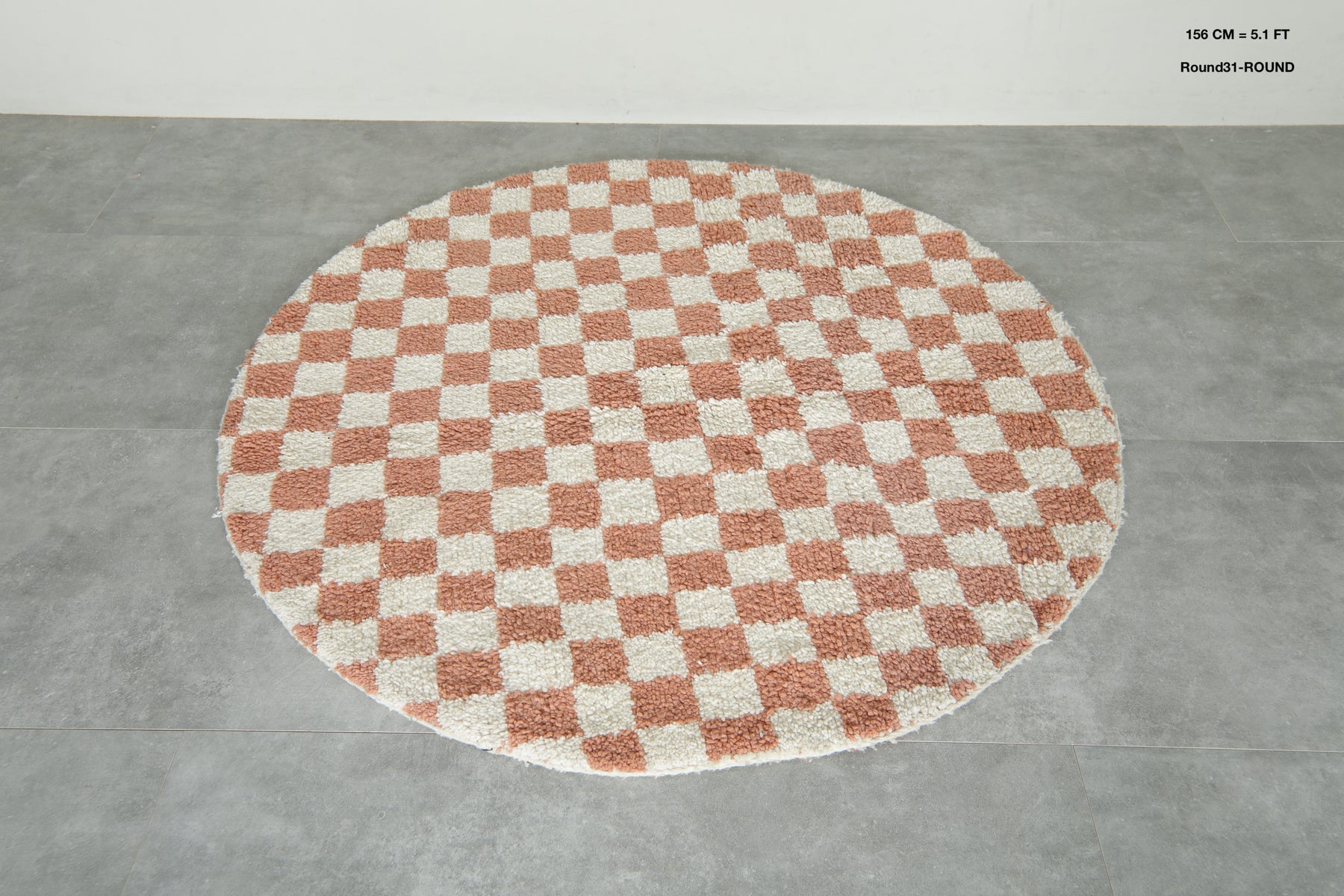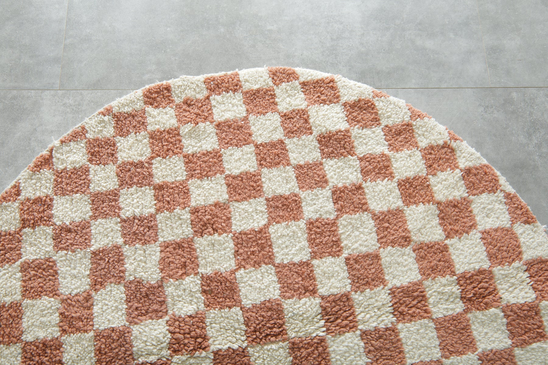 This handwoven round Moroccan rug features a plush wool texture with a bold checkered pattern in alternating white and brown squares. The soft cream adds lightness, while the earthy terracotta brings warmth and depth, creating a balanced visual rhythm. Its circular shape softens angular spaces and adds a modern twist to traditional Berber craftsmanship. Perfect for bohemian, minimalist, or eclectic interiors seeking texture and color contrast.