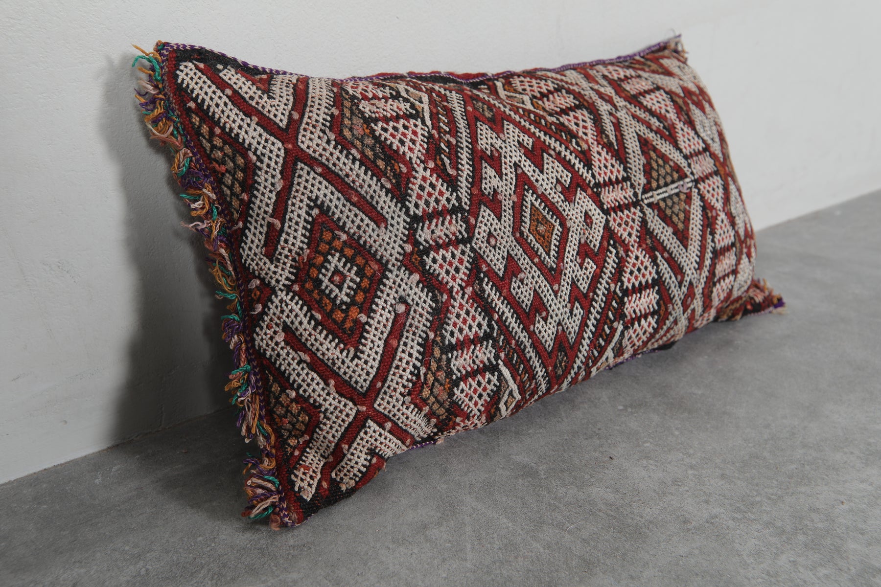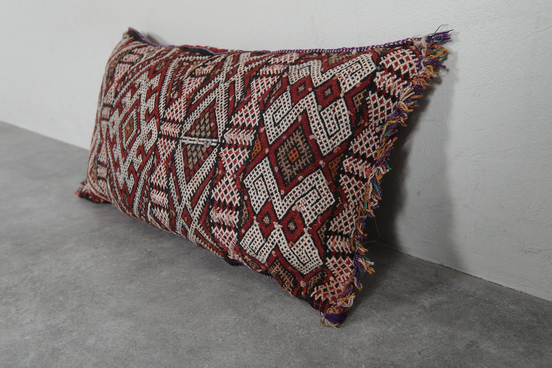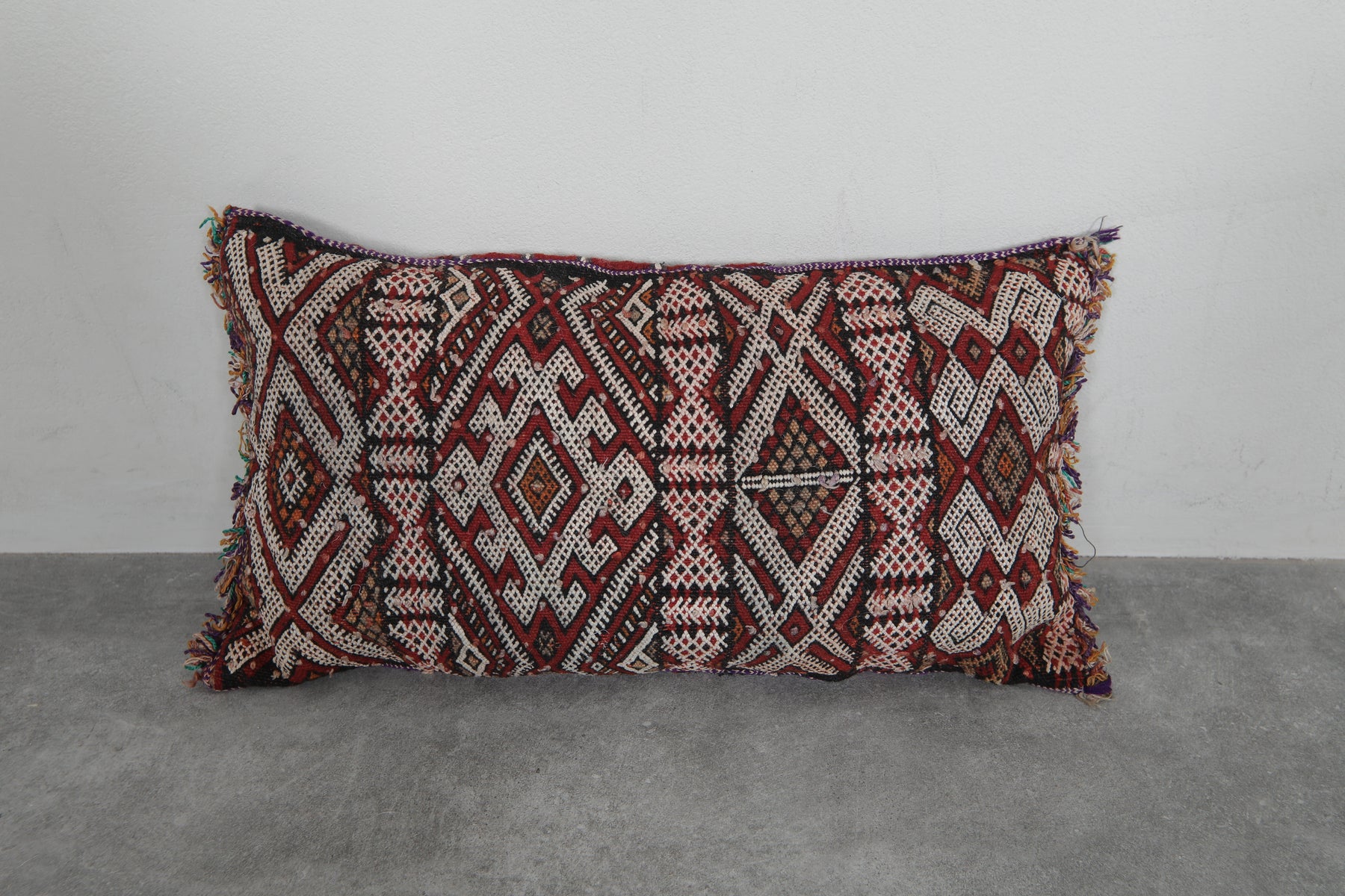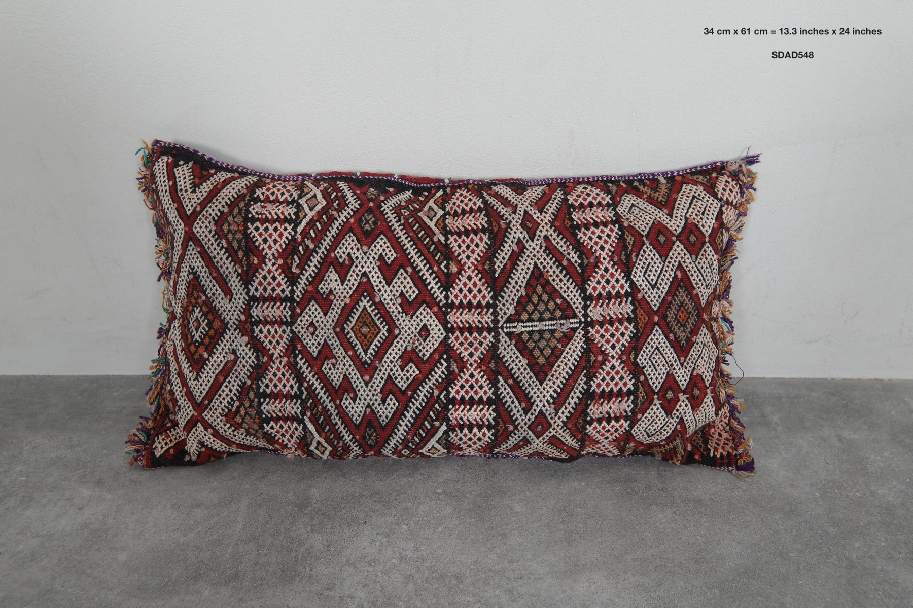 Elevate your decor with this handcrafted Moroccan pillow featuring intricate geometric patterns in earthy tones of red, cream, and black. The artisanal design and fringed edges add a touch of bohemian charm, making it a perfect accent piece for your living room or bedroom. Dimensions: 13.3 x 24 inches.