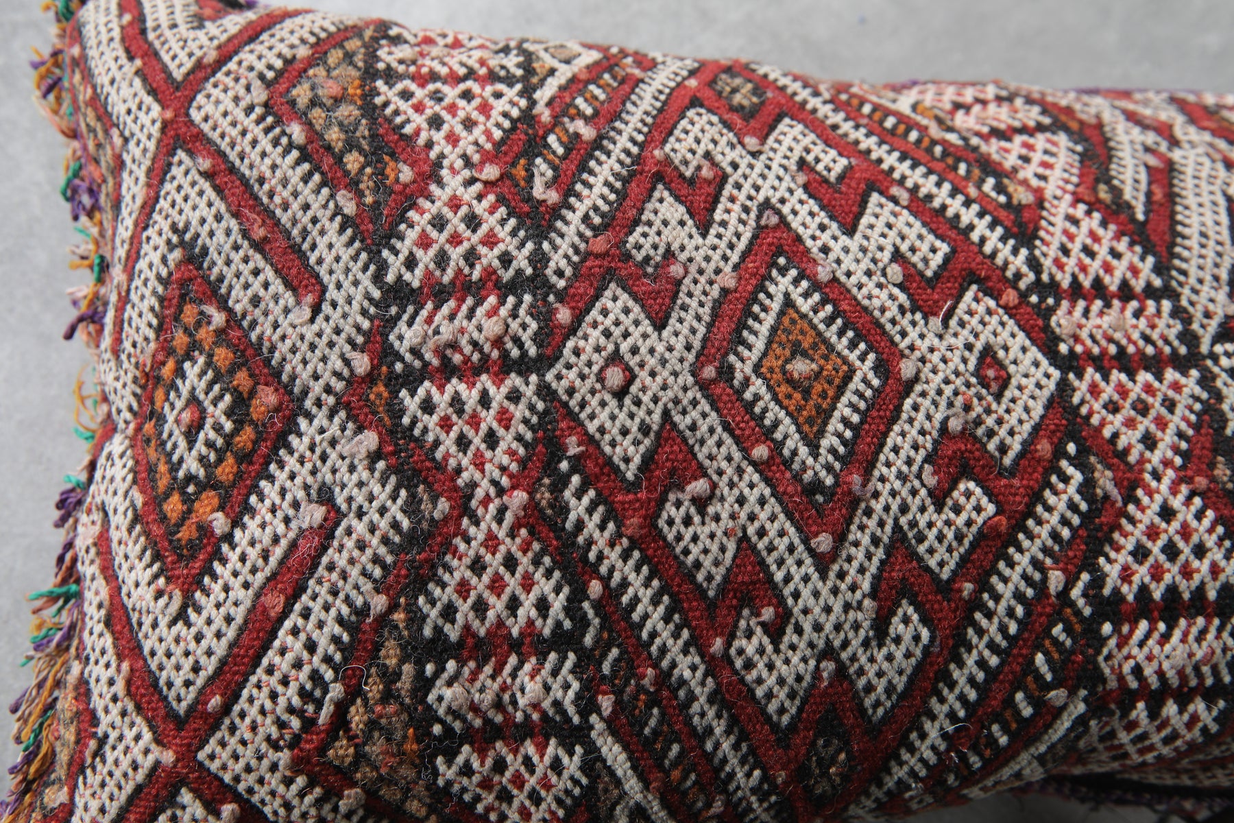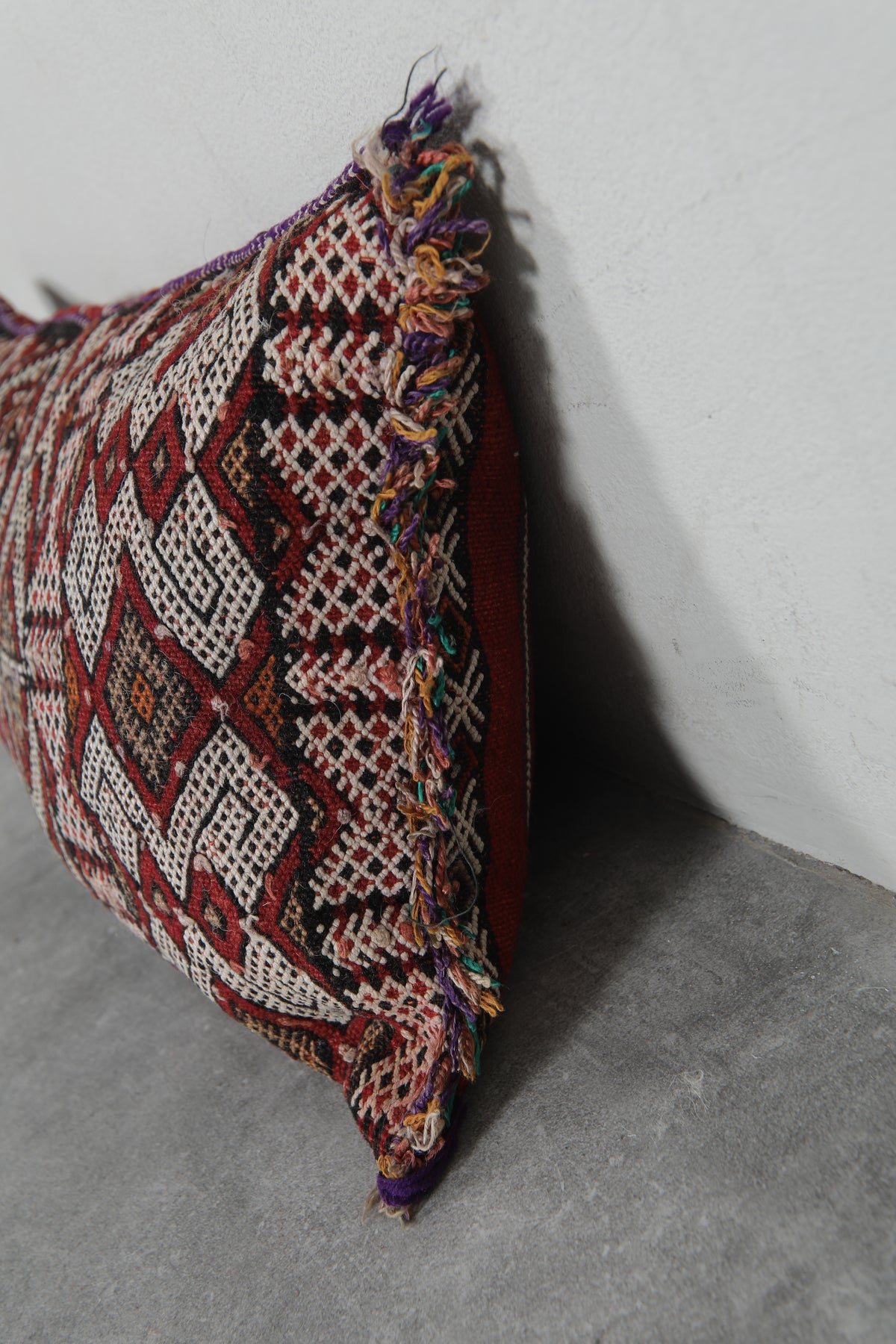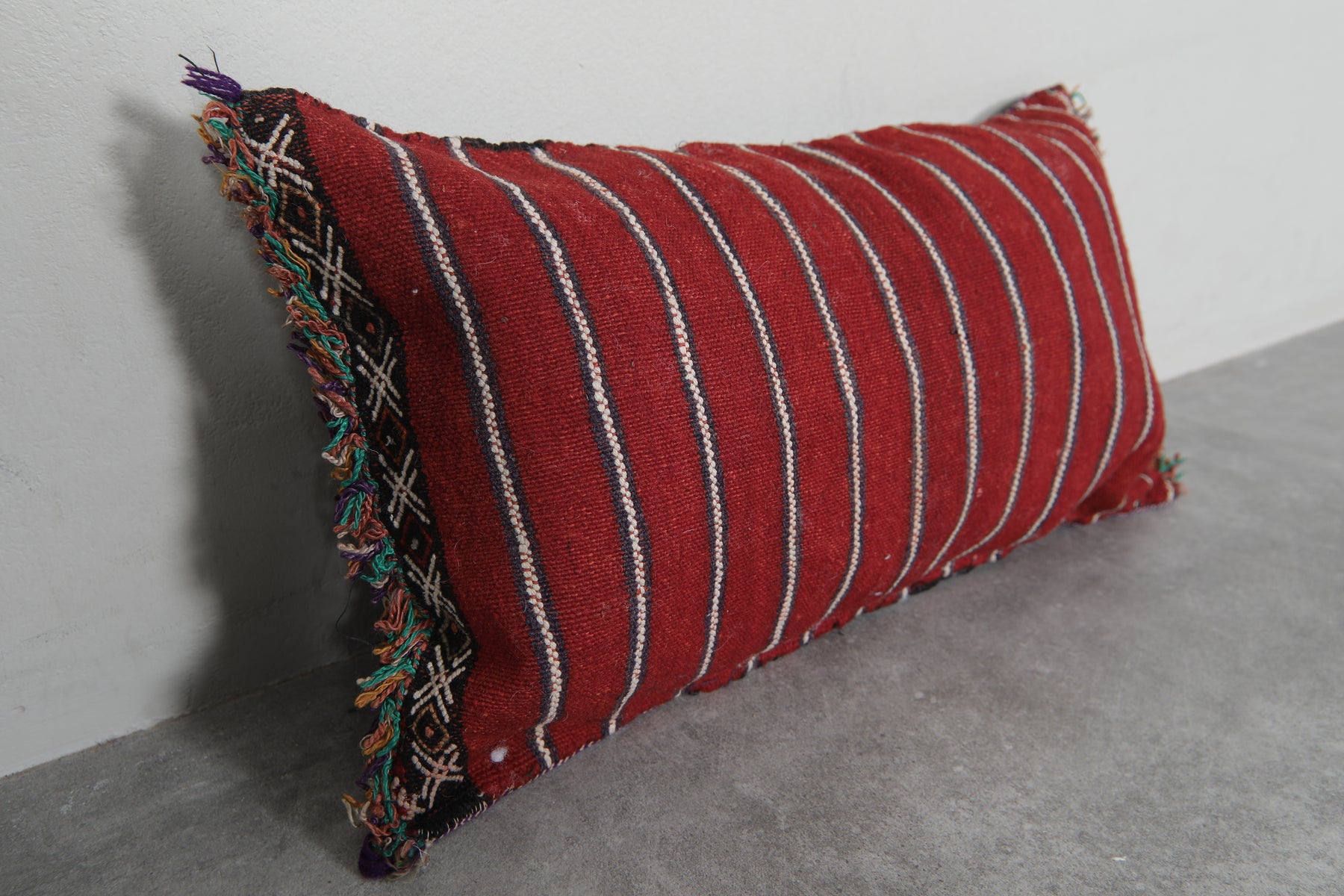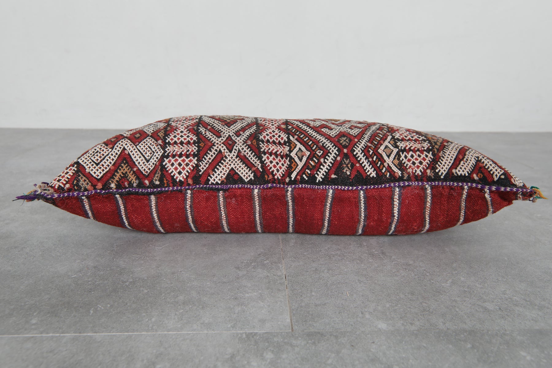 Elevate your decor with this handcrafted Moroccan pillow featuring intricate geometric patterns in earthy tones of red, cream, and black. The artisanal design and fringed edges add a touch of bohemian charm, making it a perfect accent piece for your living room or bedroom. Dimensions: 13.3 x 24 inches.