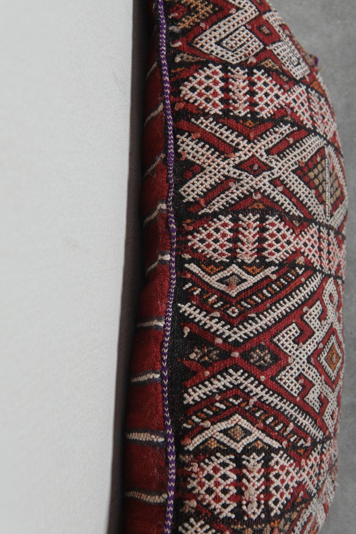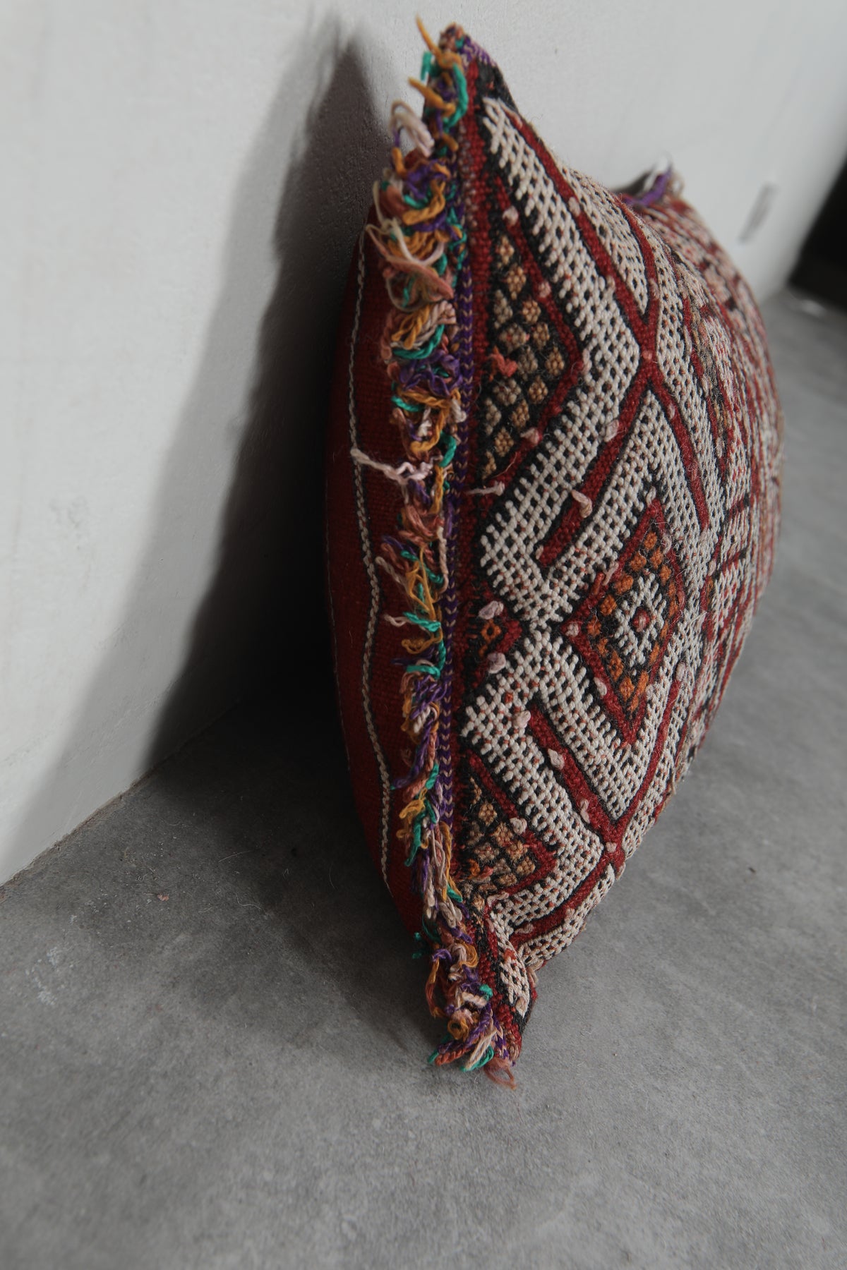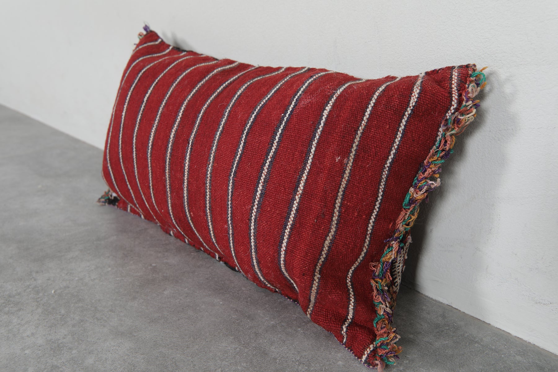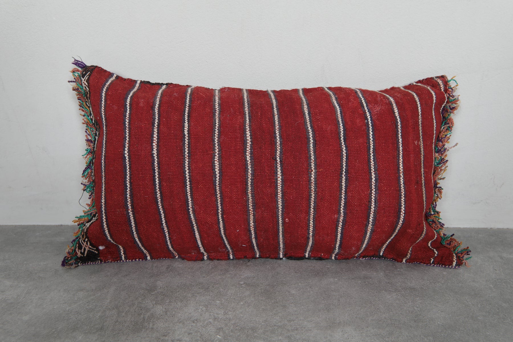Elevate your decor with this handcrafted Moroccan pillow featuring intricate geometric patterns in earthy tones of red, cream, and black. The artisanal design and fringed edges add a touch of bohemian charm, making it a perfect accent piece for your living room or bedroom. Dimensions: 13.3 x 24 inches.