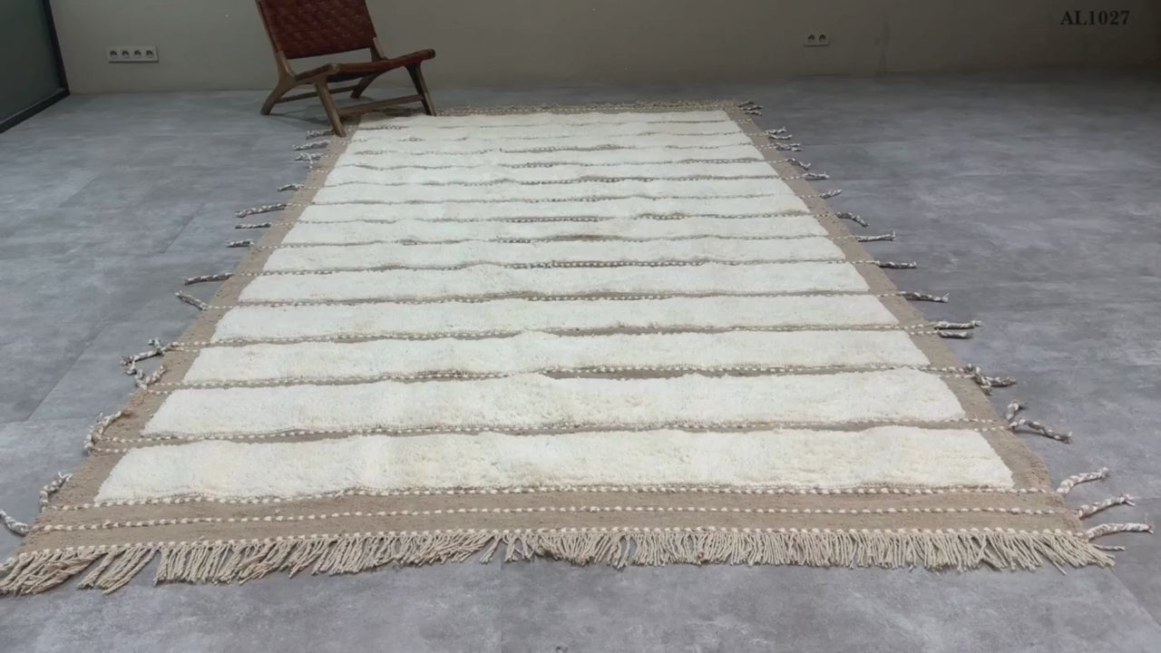 Step into warmth and sophistication with this handwoven Moroccan Berber rug, meticulously crafted by skilled artisans using centuries-old techniques. Featuring neutral cream and beige tones, this rug exudes a soft, calming aesthetic that blends effortlessly with any modern, bohemian, or minimalist space. The textured stripe design and delicate fringe details add an artisanal touch, making it both a statement piece and a cozy essential.