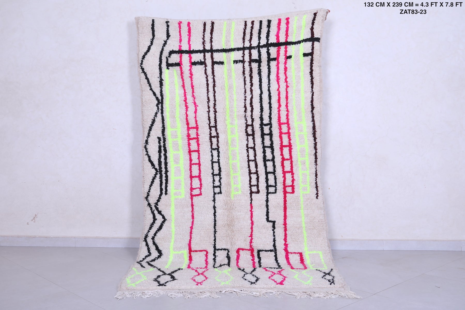 Enhance your space with this Handmade Berber Azilal Rug, sized at 4.3 x 7.8 feet (132 CM x 239 CM). Featuring a vibrant mix of yellow, pink, and black on a soft cream background, this rug brings Moroccan artistry into modern interiors.