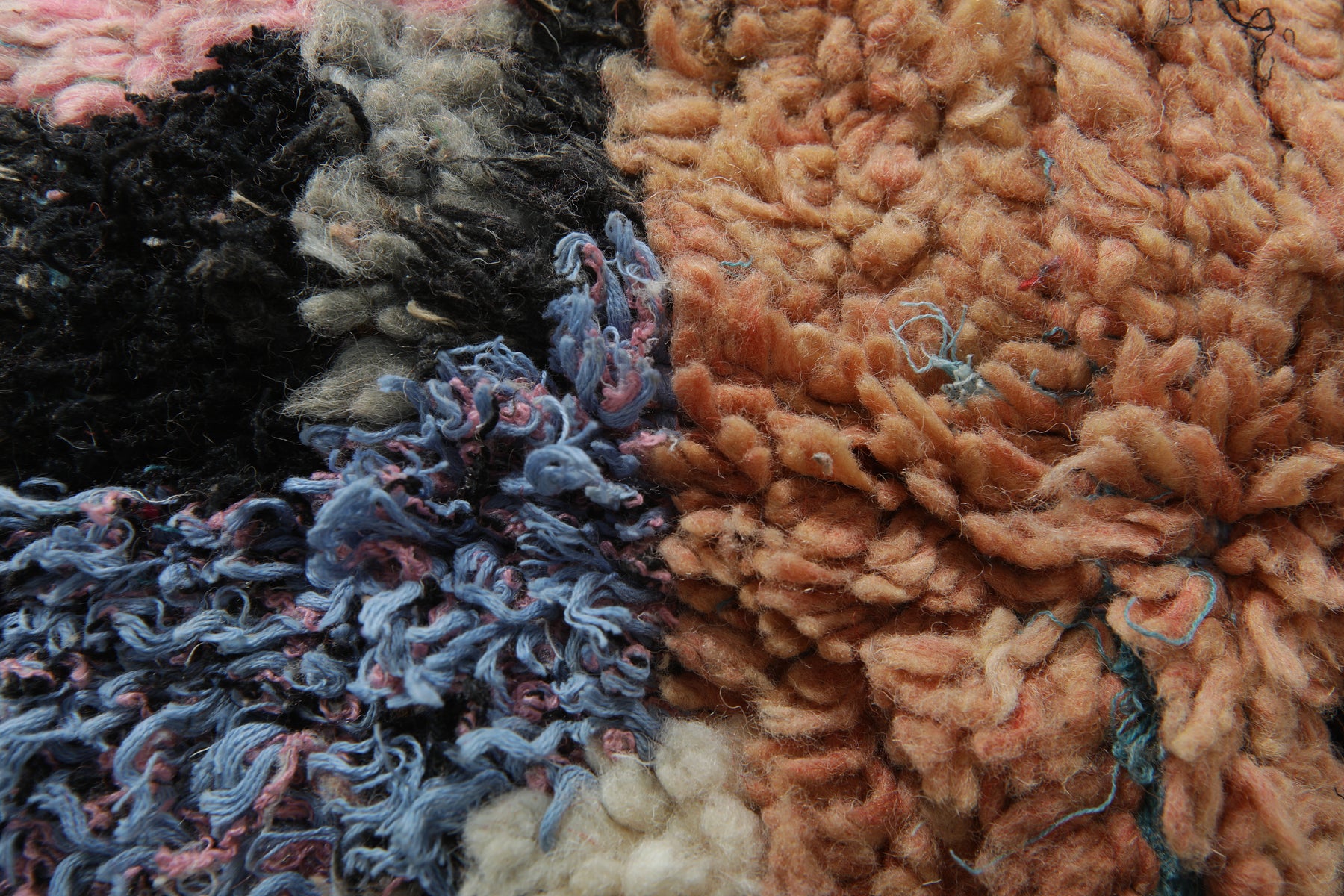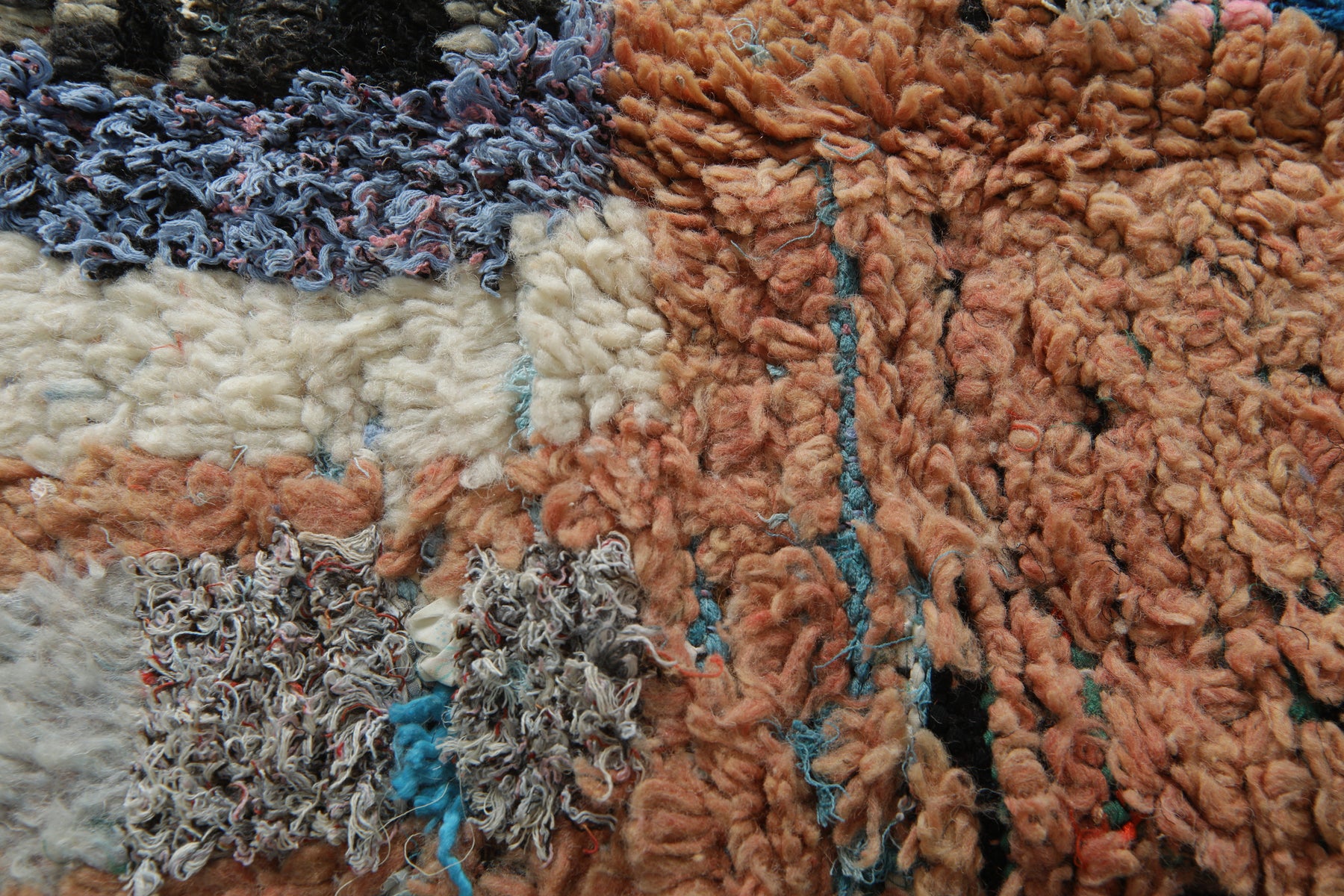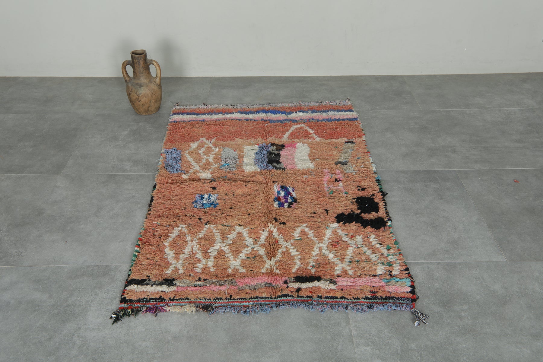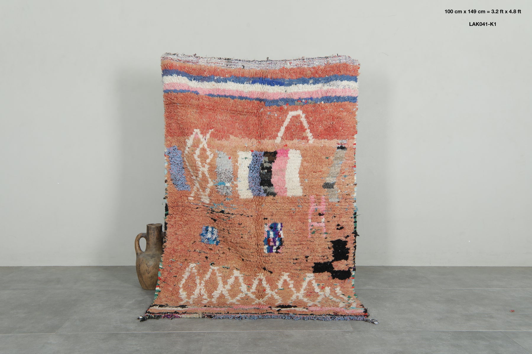 Infuse warmth and artistry into your space with this handmade Moroccan Berber rug, featuring a orange base and vibrant abstract patterns. Expertly crafted from natural wool, this one-of-a-kind vintage rug blends earthy tones with pops of pink, blue, black, and ivory, creating a bold yet cozy statement. Perfect for boho, eclectic, or modern interiors, this vintage Moroccan rug adds texture and cultural charm to any room.