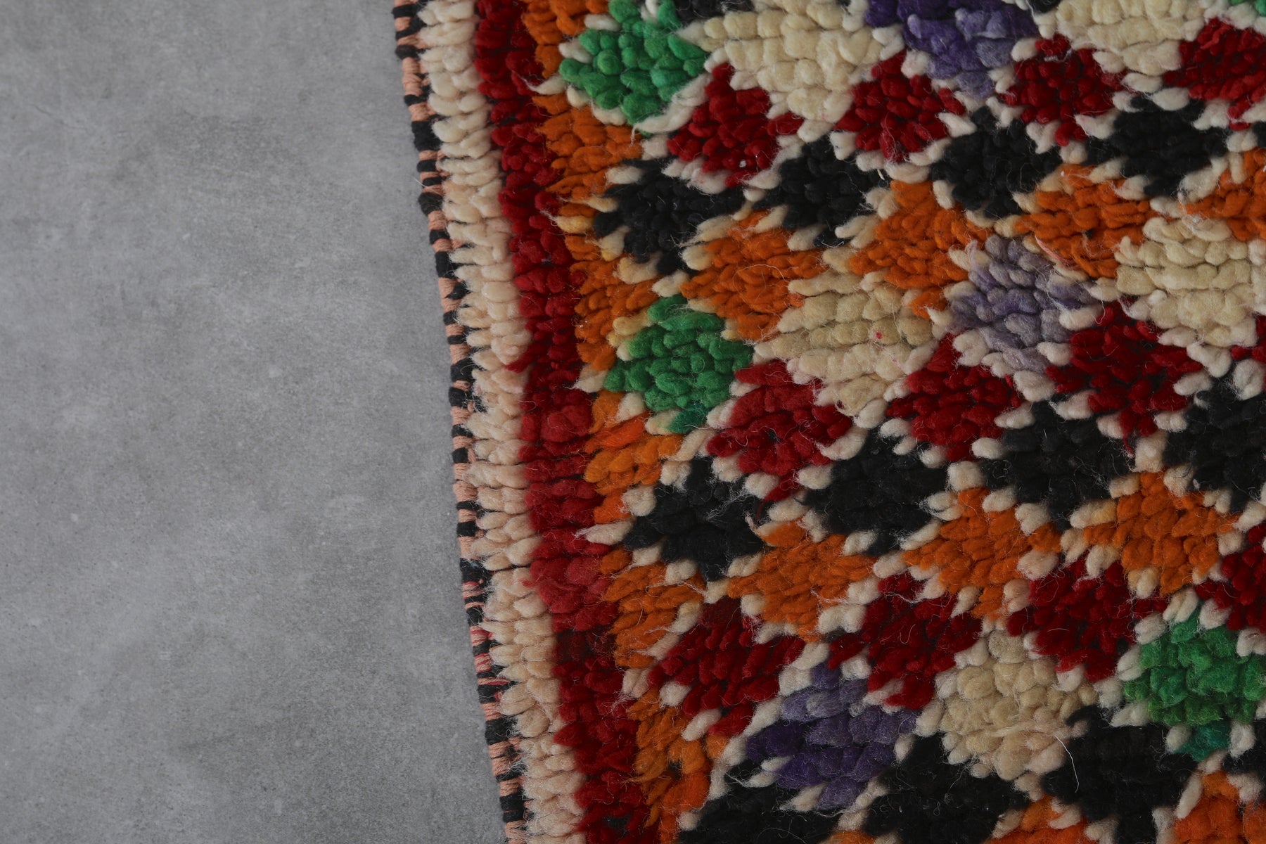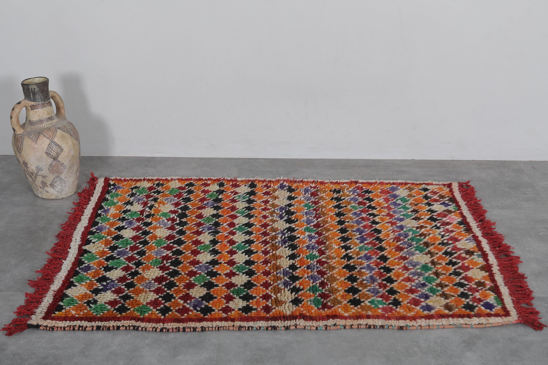 Transform your space with this handmade Moroccan rug, measuring 3.4 x 4.7 ft. This exquisite rug features a colorful diamond pattern, expertly crafted by skilled Berber artisans using traditional weaving techniques. Made with high-quality wool, it offers a soft texture and remarkable durability, making it ideal for high-traffic areas like living rooms, bedrooms, or entryways. Its vibrant color palette adds a lively touch to any decor, while its compact size fits seamlessly into small or large spaces. Enhance your home with this one-of-a-kind cultural masterpiece that blends art and functionality.