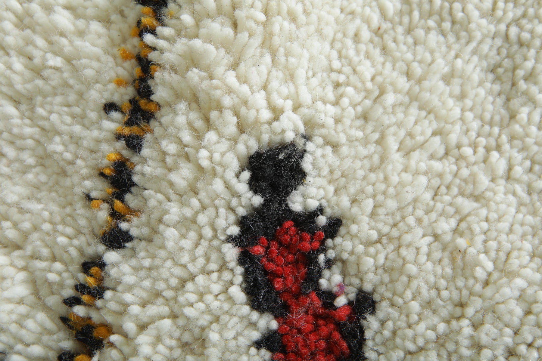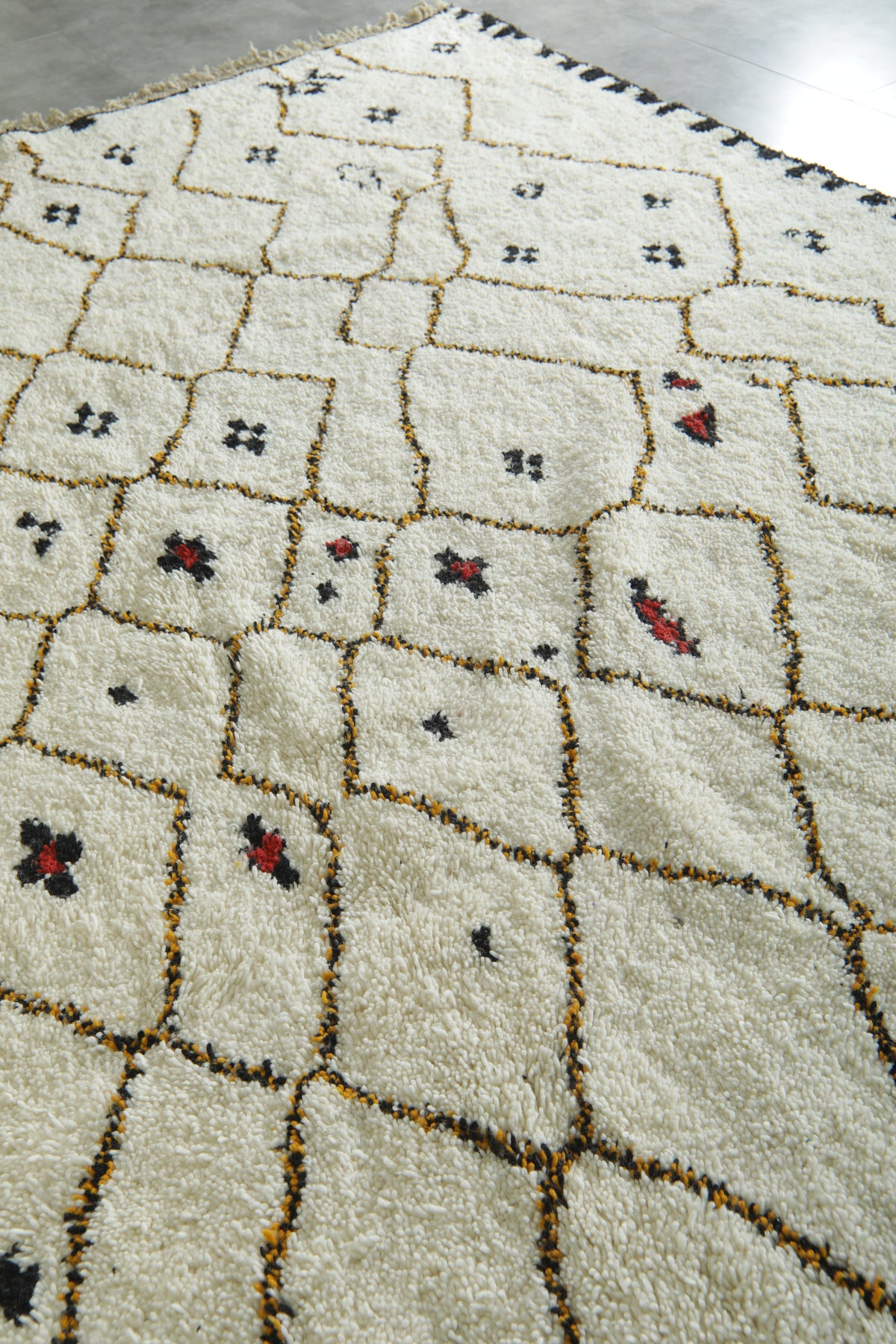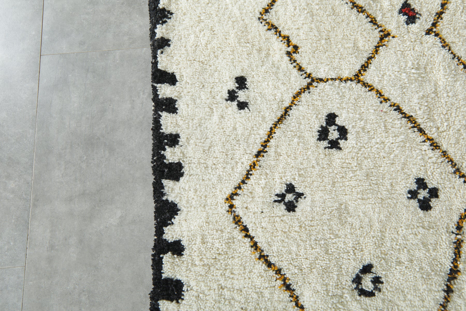 This expressive Azilal rug is handwoven in Morocco from natural wool, featuring a creamy white base adorned with irregular brown-gold diamond outlines. Scattered black and red tribal motifs add depth and character, while the bold black side borders frame the composition with graphic contrast. Finished with hand-knotted white fringe, this piece blends traditional Berber symbolism with a modern, gallery-worthy aesthetic—perfect for eclectic, bohemian, or contemporary interiors seeking a one-of-a-kind statement.