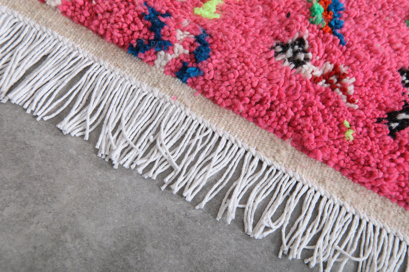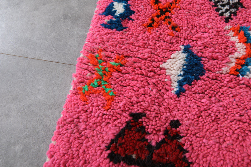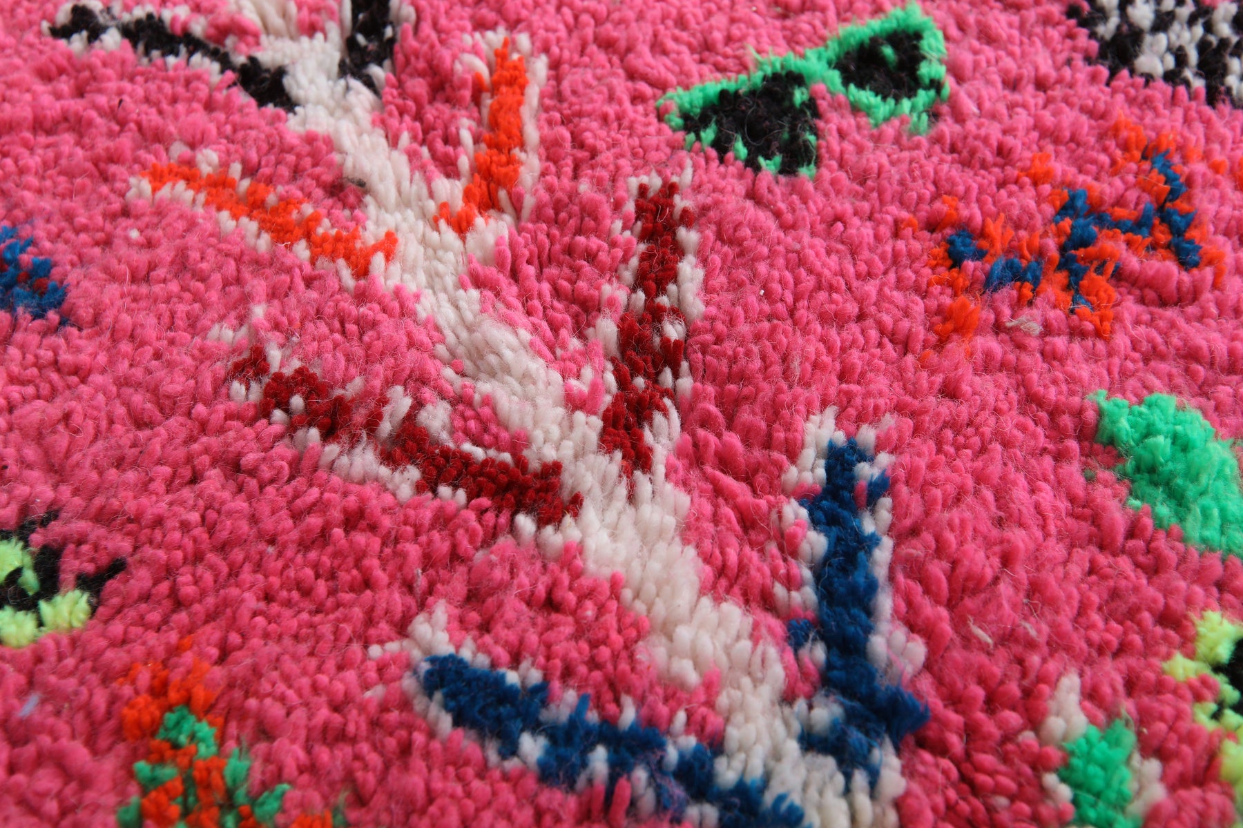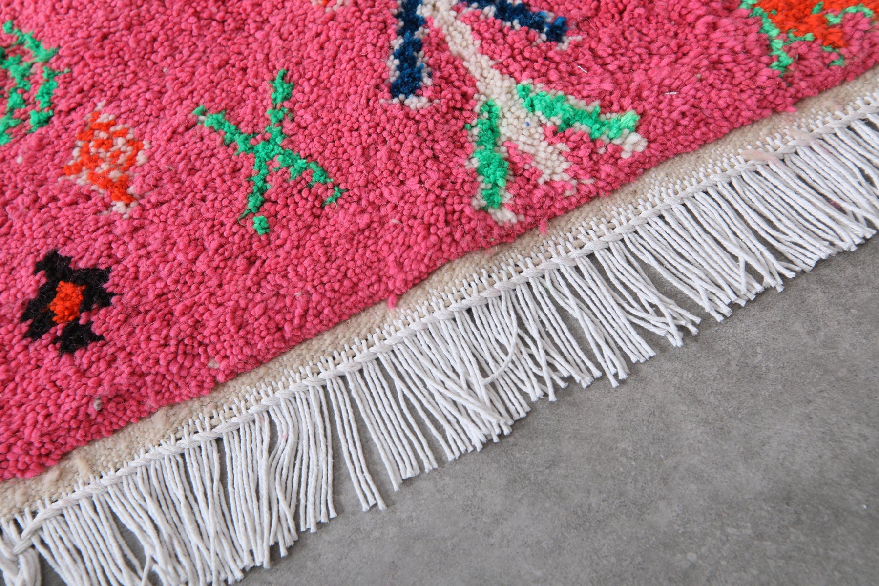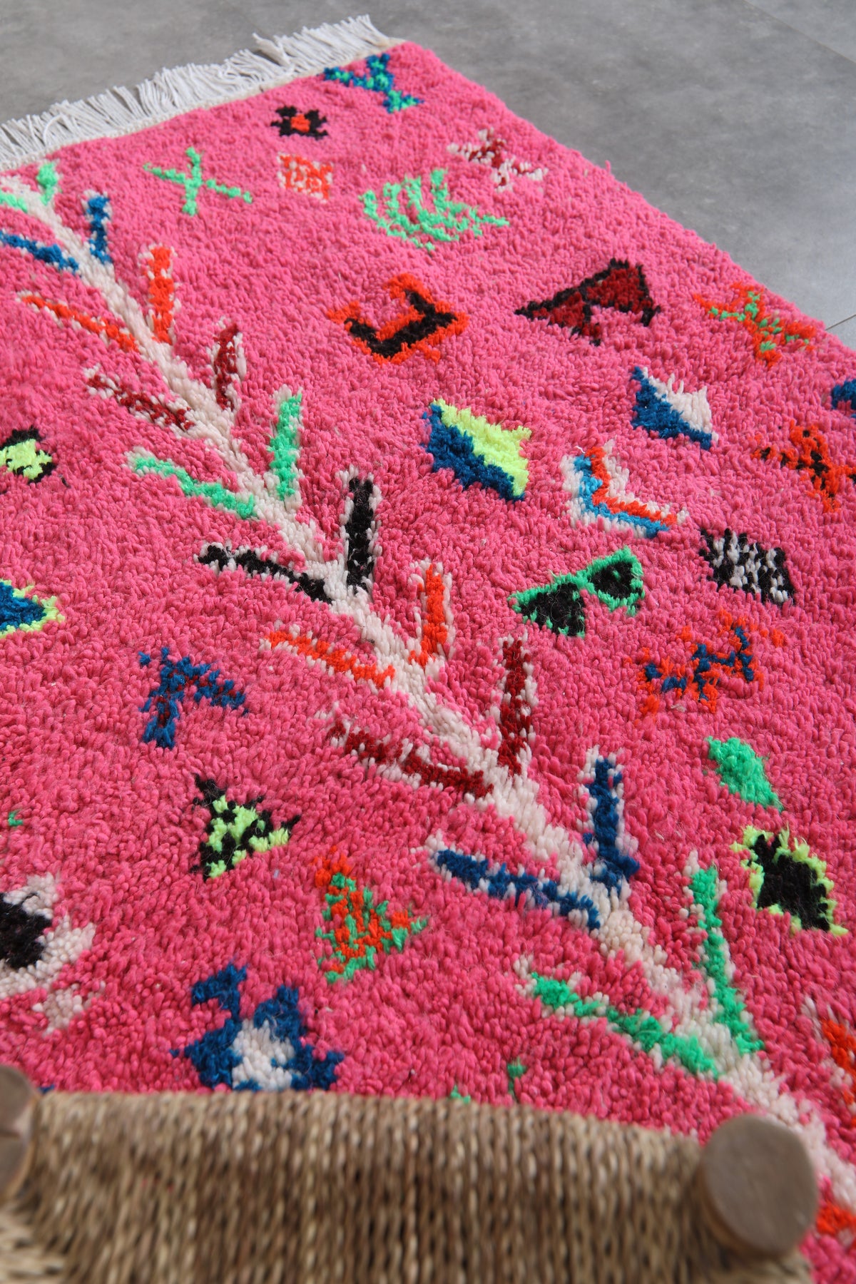 Add a splash of color to your space with this Pink Moroccan Rug, sized at 3.8 x 5.1 feet (116 CM x 157 CM). Featuring vibrant geometric patterns and tribal-inspired symbols, this handmade rug is perfect for creating a lively bohemian vibe.
