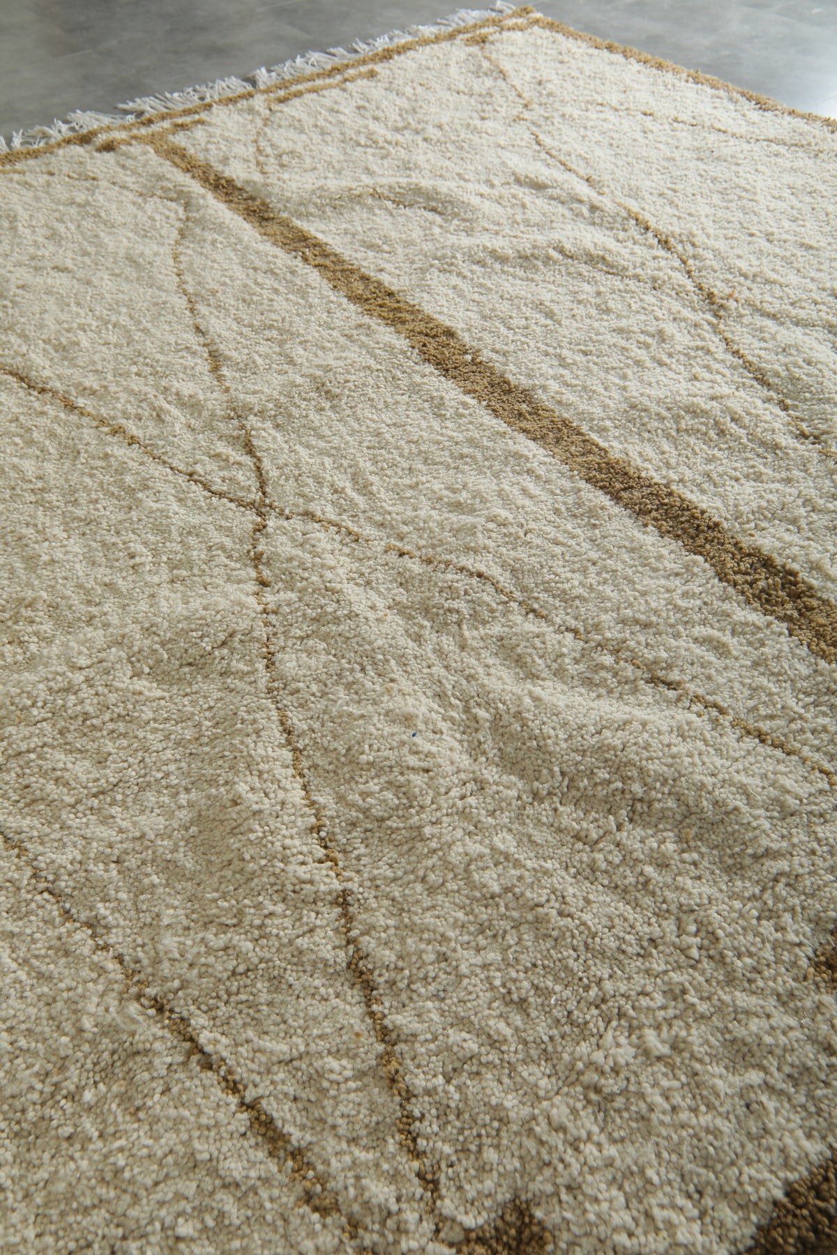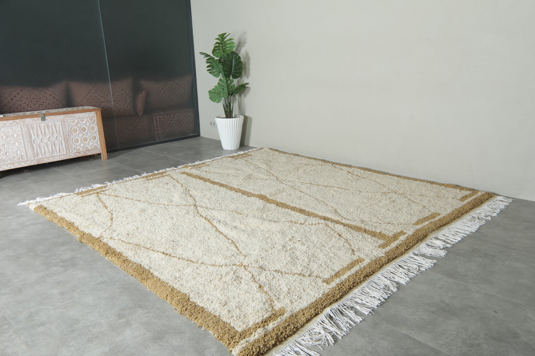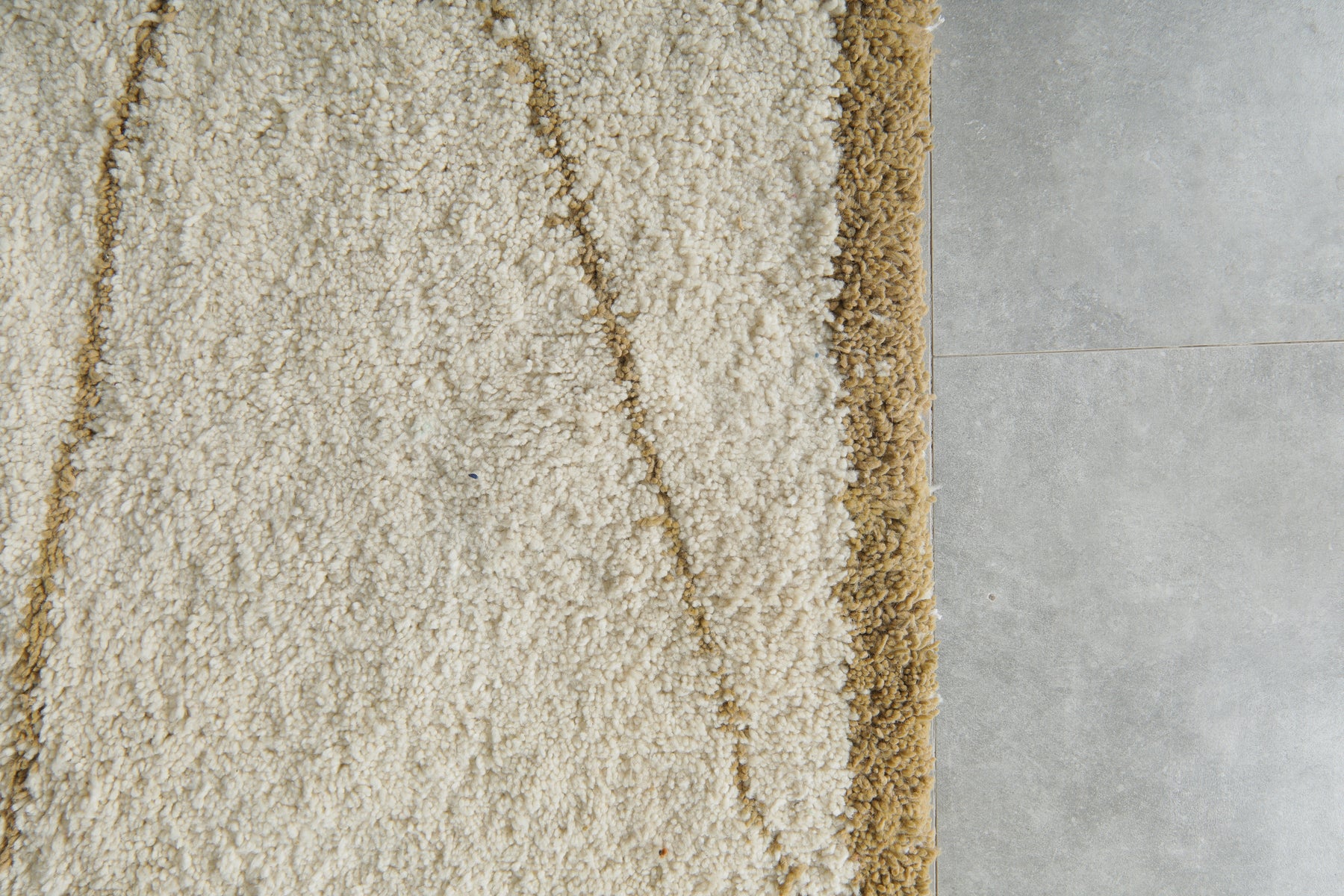 Discover the charm of this Moroccan-style rug featuring a soft white background paired with warm mustard yellow geometric lines for a clean, minimalist look. Handcrafted with care, this rug brings texture and subtle color to your space, making it a perfect choice for neutral, bohemian, or contemporary interiors. The symmetrical pattern adds visual interest without overwhelming, while the thick pile offers plush comfort. Finished with classic white fringe detailing, this rug is ideal for living rooms, bedrooms, or entryways needing a cozy yet stylish touch.