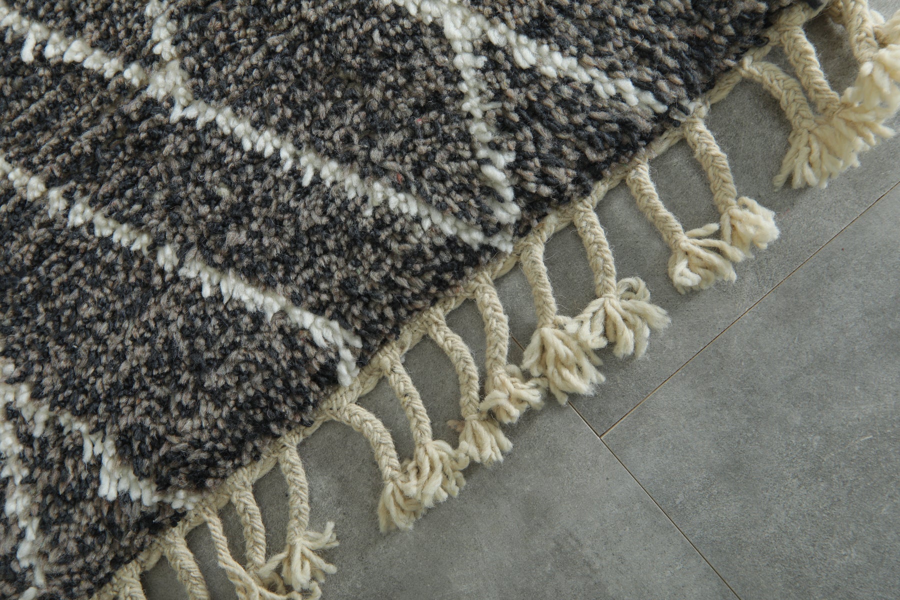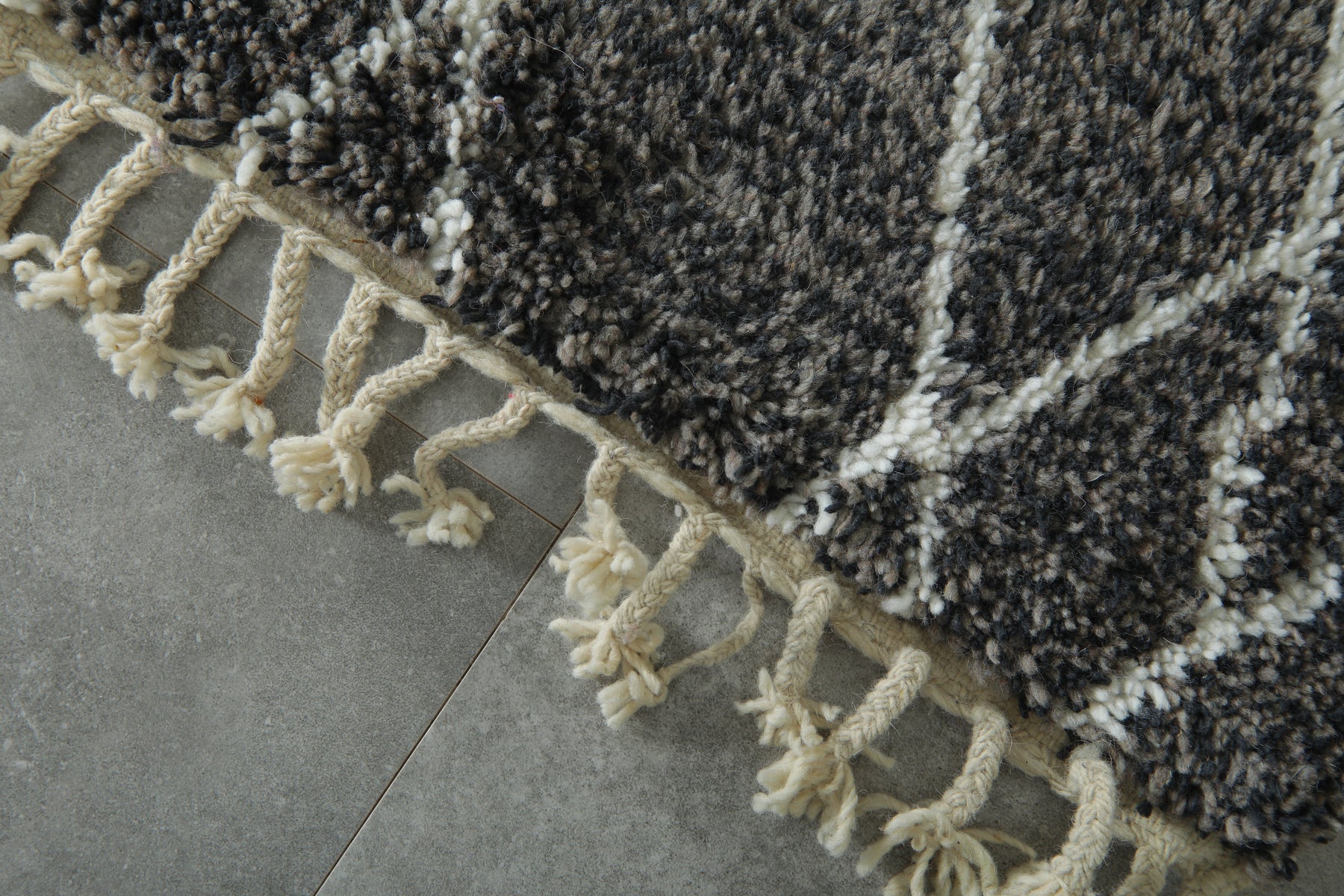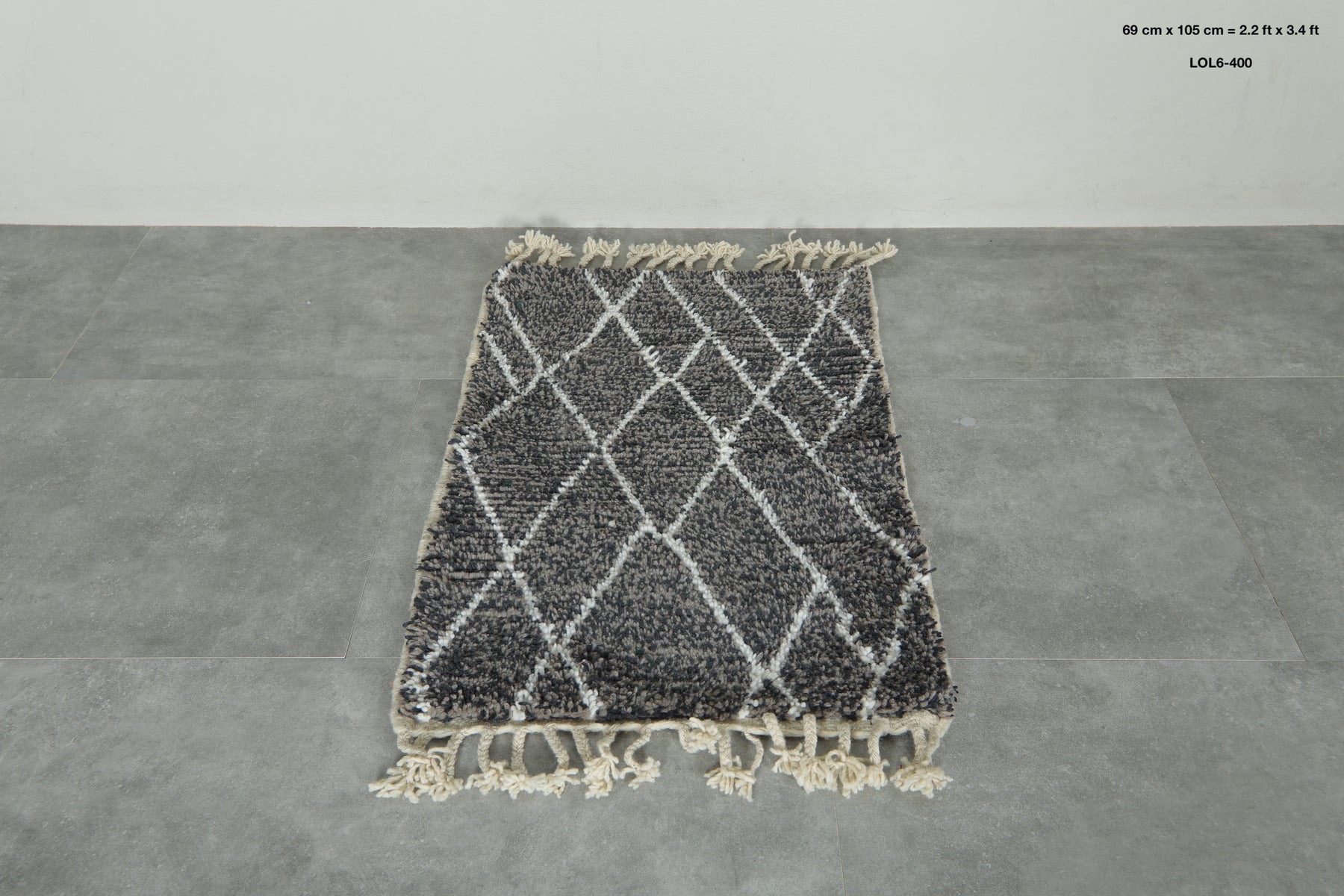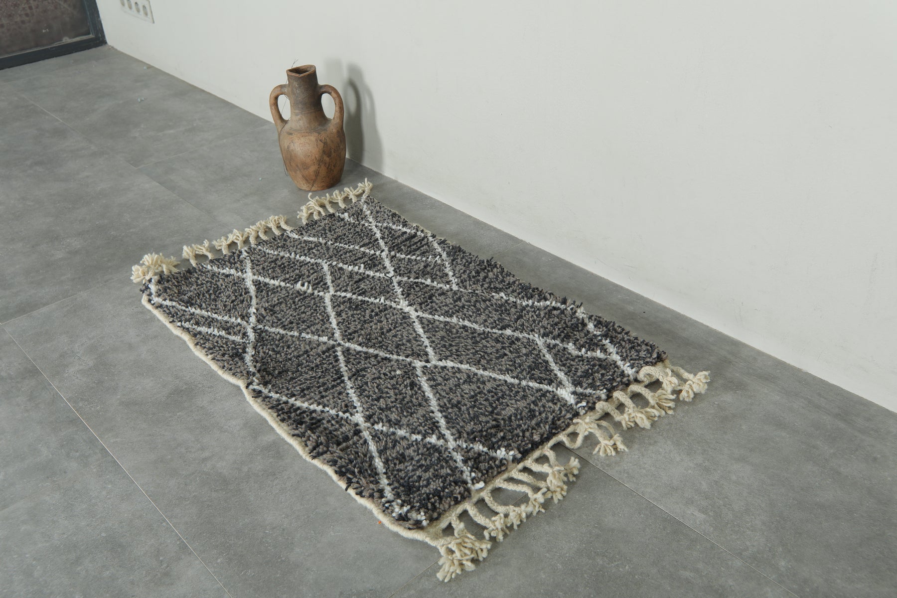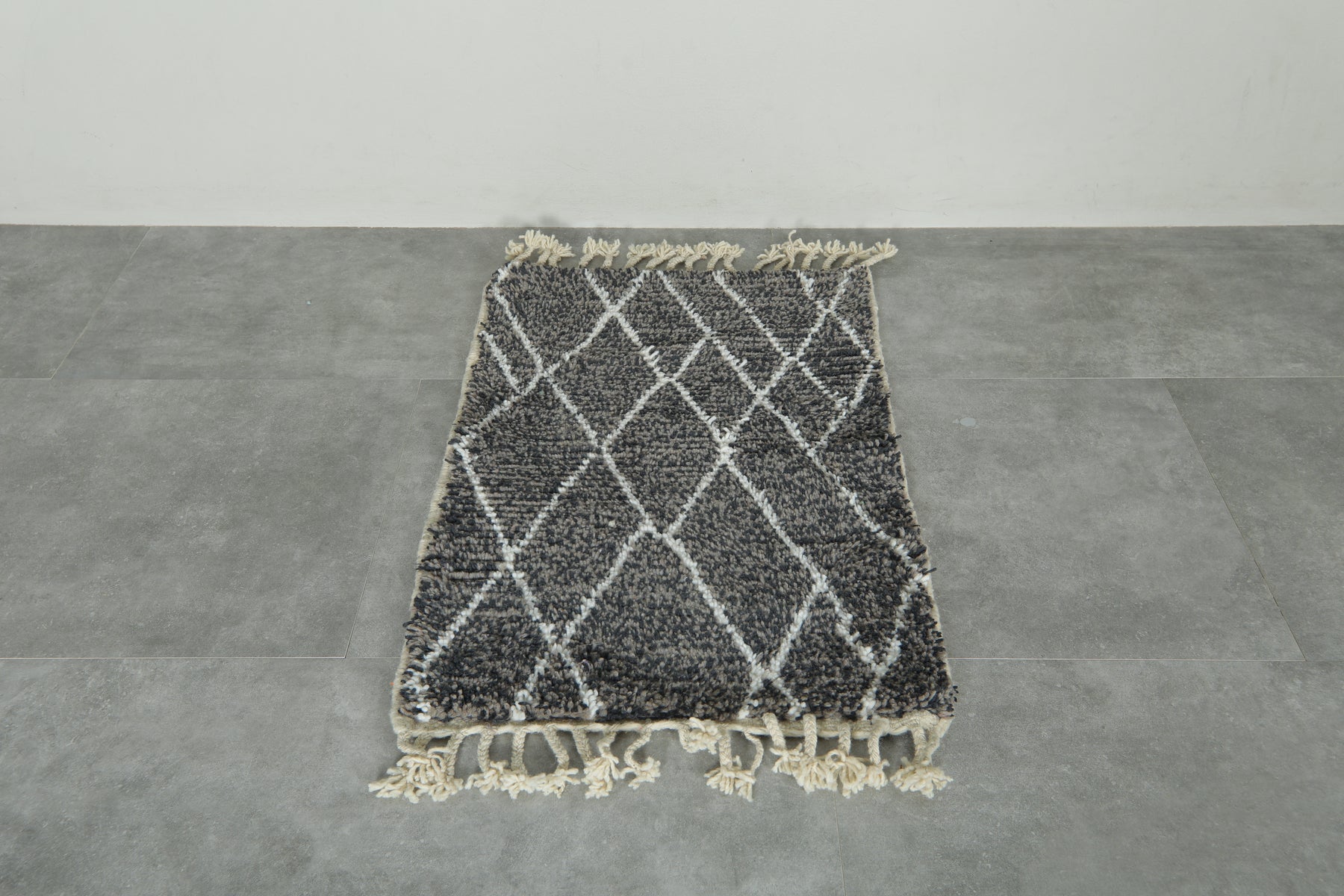 Elevate your interior with this handcrafted small Beni Ourain rug, featuring a striking blend of grey, black, and white tones in a classic diamond lattice pattern. Woven from premium wool by skilled Moroccan artisans, this cozy mini rug is perfect for entryways, bedside areas, or layering with larger pieces. Its soft texture, neutral color palette, and timeless Berber design make it a versatile addition to both modern and bohemian decor. Finished with traditional fringes, this authentic Moroccan rug brings warmth, charm, and heritage into any space.