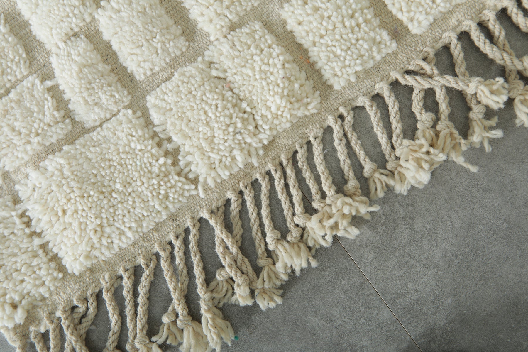 Add a touch of elegance with this handmade small white Moroccan wool rug, featuring a soft, checkered pattern with texture. Ideal for small spaces, entryways, or even as an accent, this rug features minimalism with artisanal appeal. Made from the finest natural wool, it is soft underfoot while the subtle geometric grid adds modernity. The neutral tones of white will blend with any style, from bohemian to Scandinavian. A timeless, beautiful item to add warmth and elegance to your home.