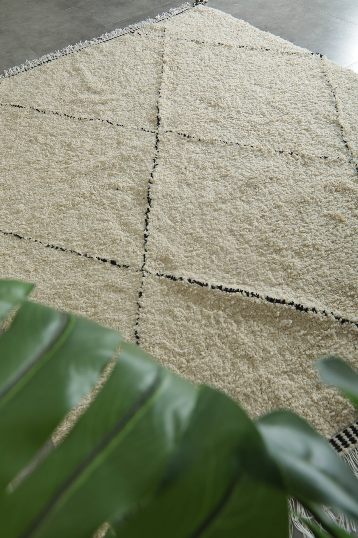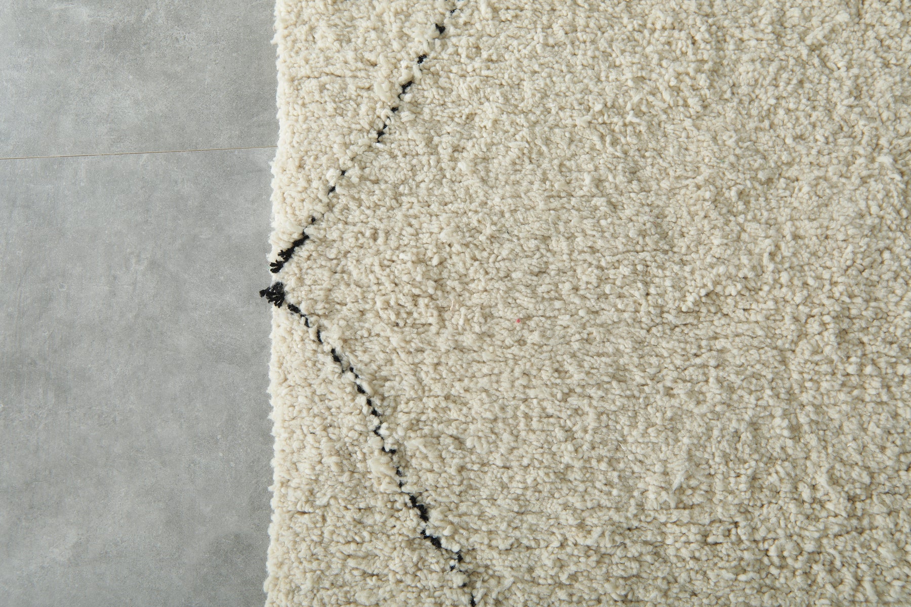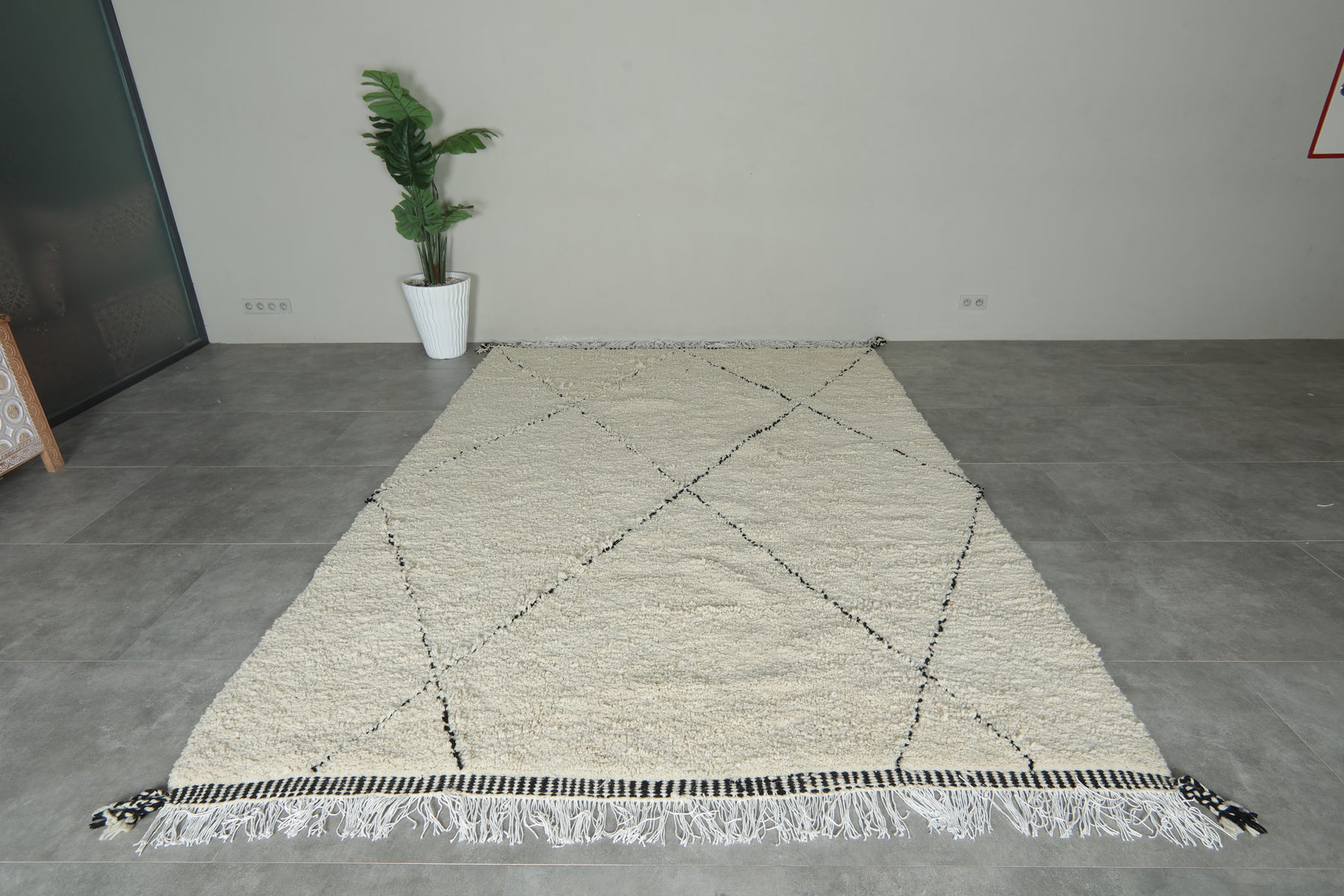 Bring timeless elegance into your space with this handcrafted White Beni Ourain Moroccan Rug featuring subtle black diamond stripes. Made from premium natural wool by skilled Berber artisans, this rug showcases the traditional Beni Ourain design in a minimalist black-on-white palette. Its plush texture and geometric lines make it perfect for modern, boho, or Scandinavian interiors. Ideal for bedrooms, living rooms, or cozy reading nooks, this Moroccan wool rug adds warmth, character, and a touch of culture to any home.