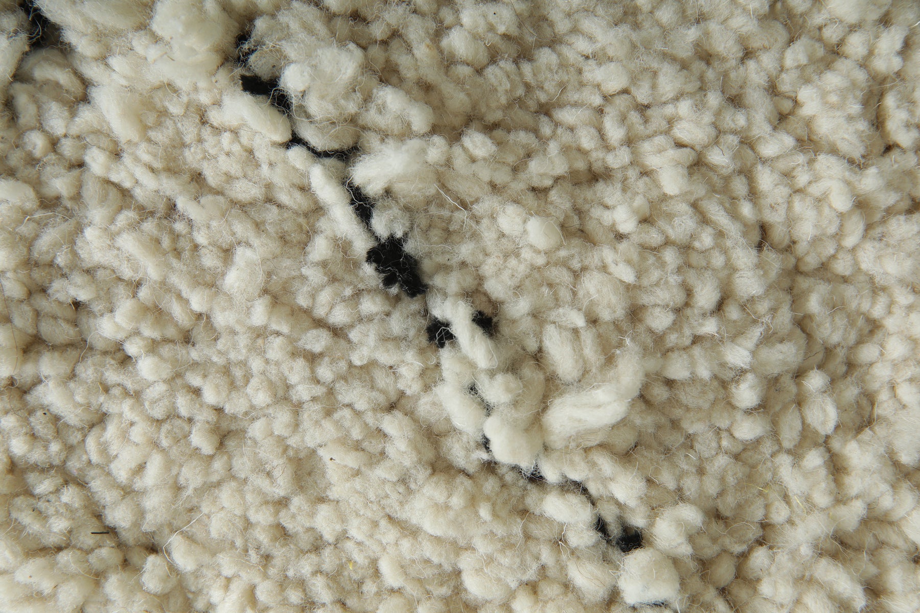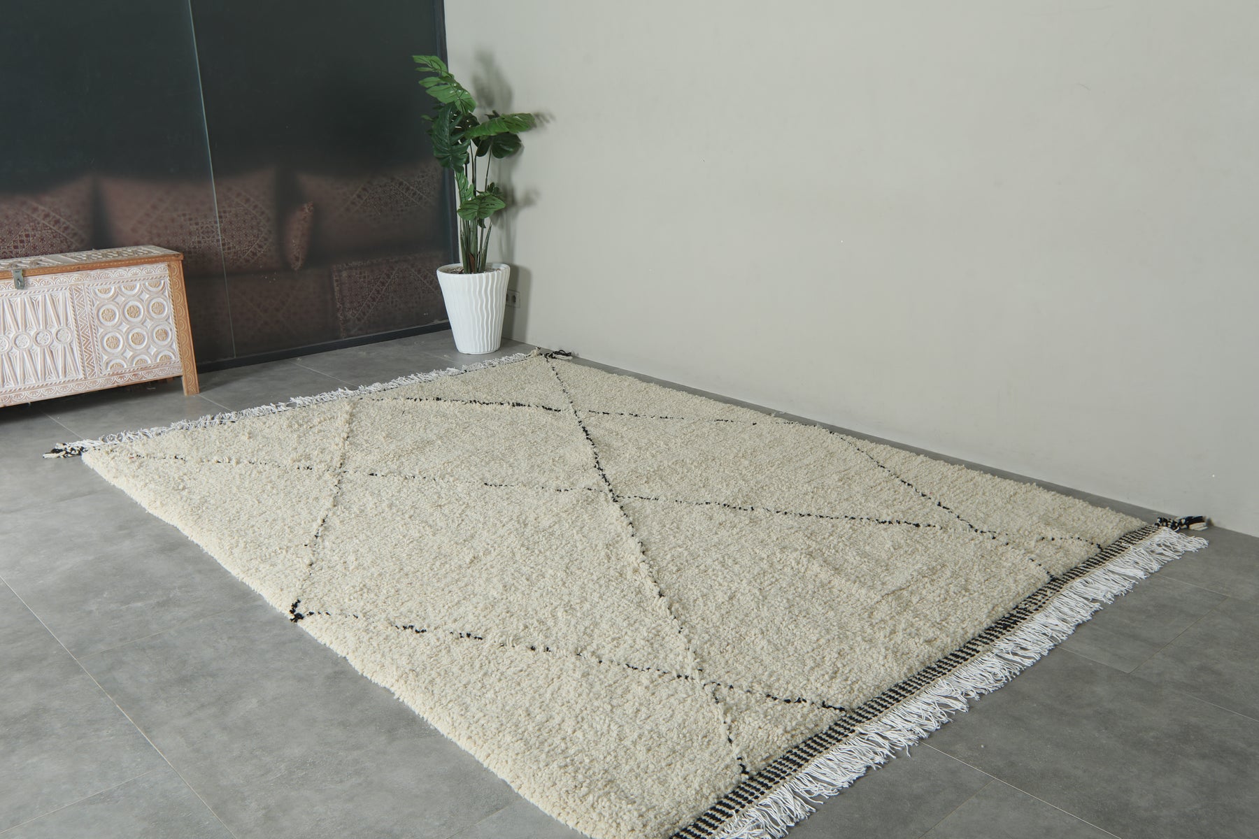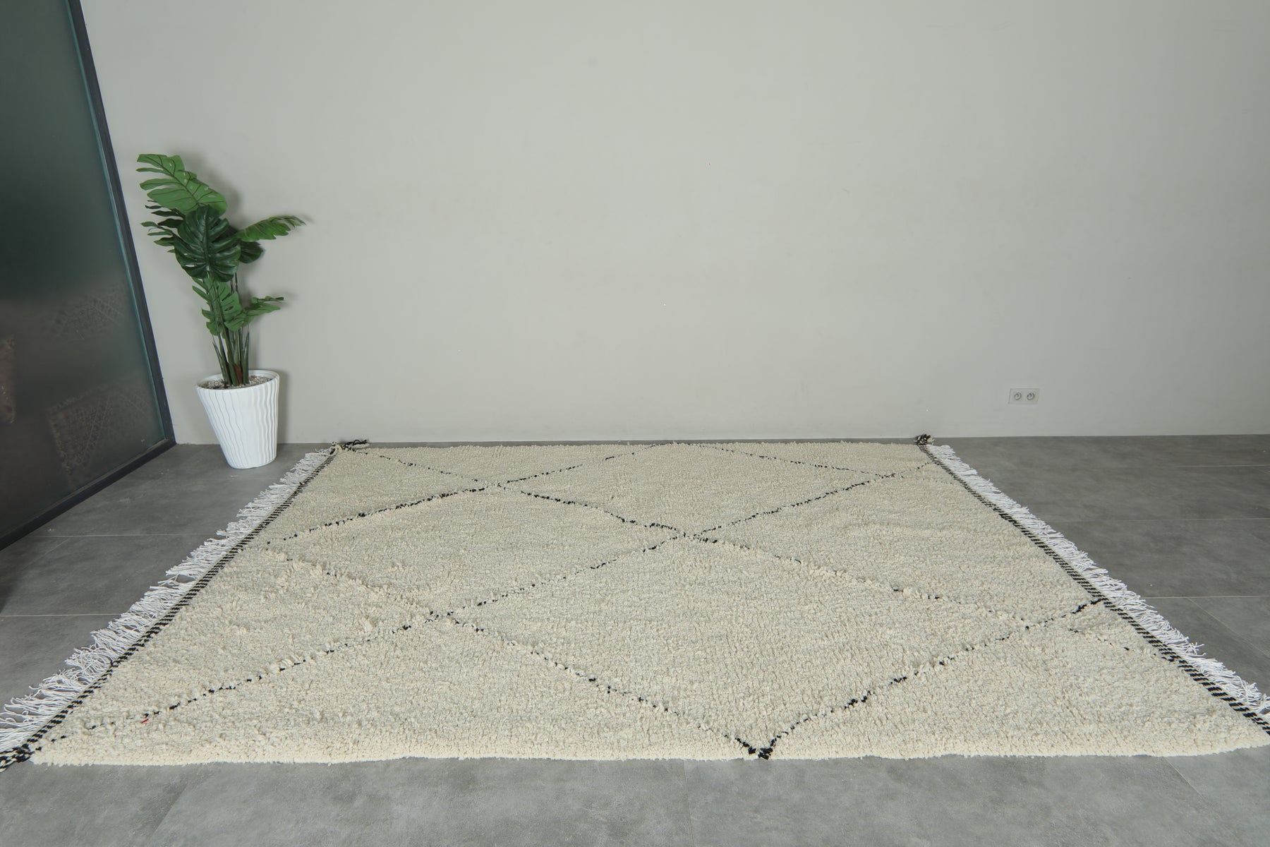 Bring timeless elegance into your space with this handcrafted White Beni Ourain Moroccan Rug featuring subtle black diamond stripes. Made from premium natural wool by skilled Berber artisans, this rug showcases the traditional Beni Ourain design in a minimalist black-on-white palette. Its plush texture and geometric lines make it perfect for modern, boho, or Scandinavian interiors. Ideal for bedrooms, living rooms, or cozy reading nooks, this Moroccan wool rug adds warmth, character, and a touch of culture to any home.