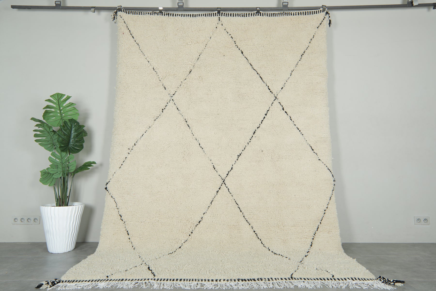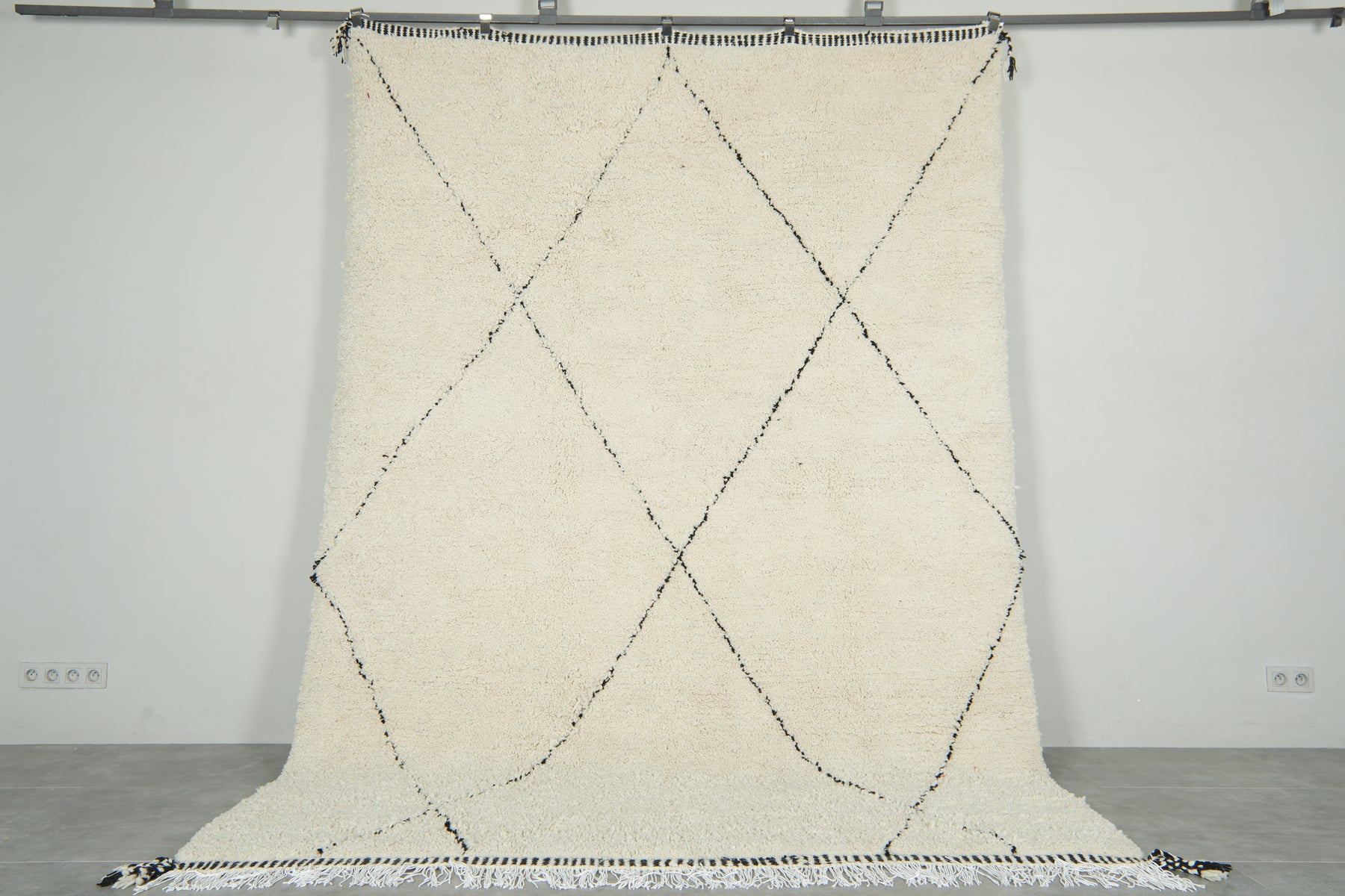 White Moroccan beni ourain rug with black diamond stripes - 7.4 FT X 10.5 FT