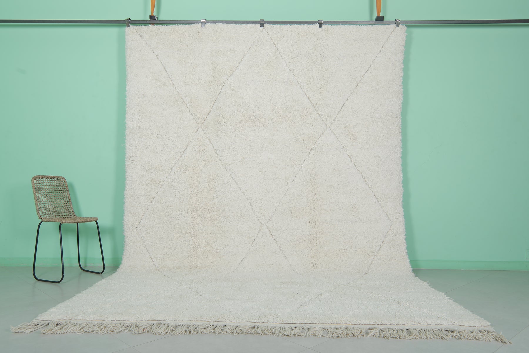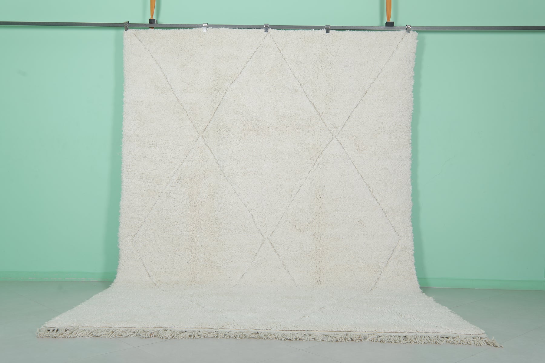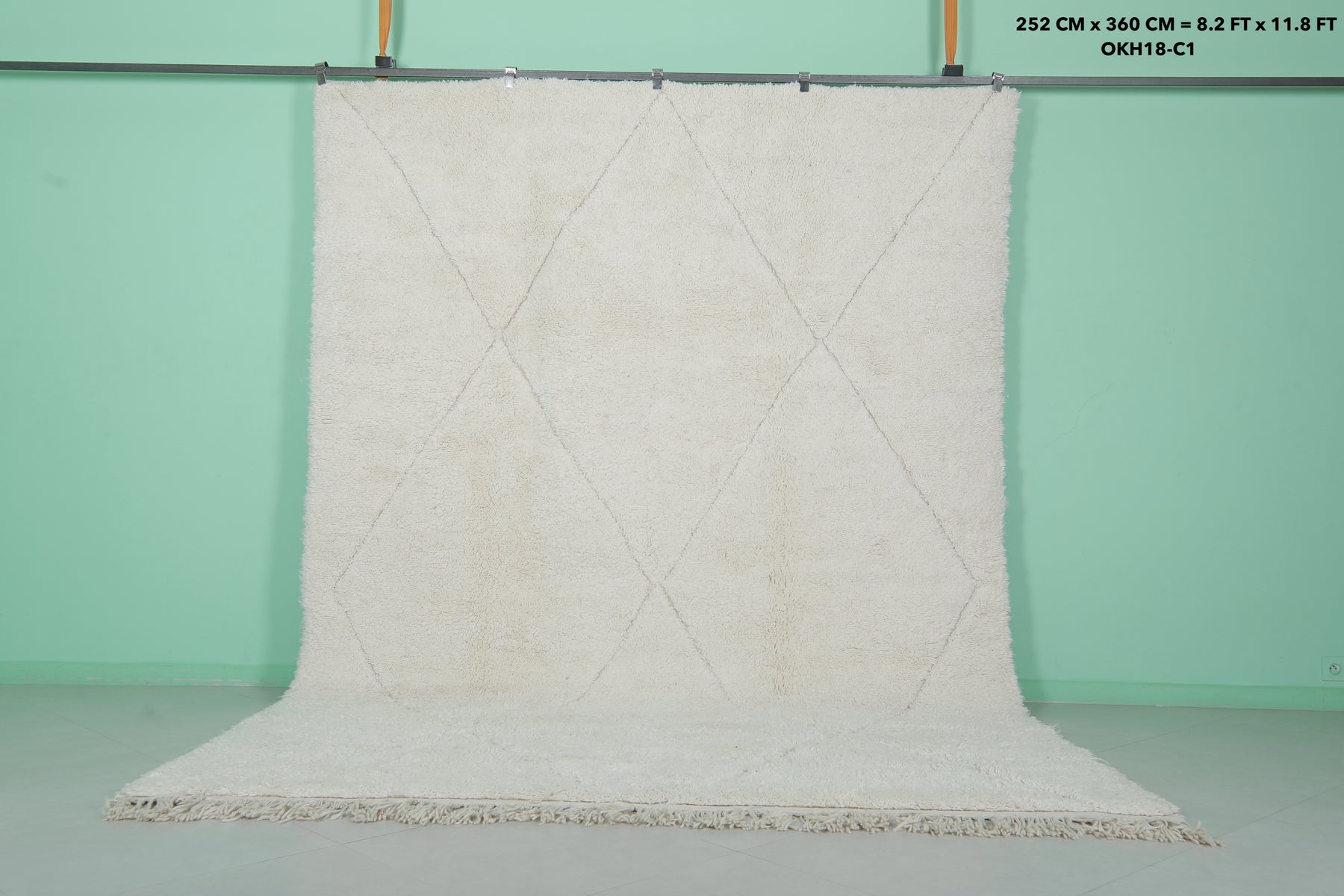 Enhance your space with this expansive Beni Ourain Moroccan Wool Rug 8.2 x 11.8 ft, featuring a classic diamond design in a soft ivory tone. Handwoven by skilled Moroccan artisans, this rug blends timeless elegance with superior craftsmanship.