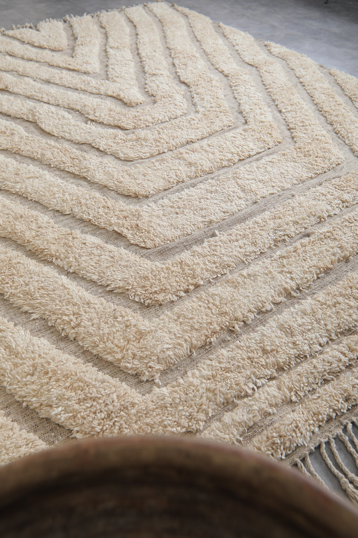 Its contemporary concentric pattern in soft ivory and beige tones creates a visual statement that is both bold and understated — making it the perfect centerpiece for modern, bohemian, or minimalist spaces. The thick, plush pile ensures ultimate comfort, while the hand-knotted fringe adds an extra touch of authenticity.