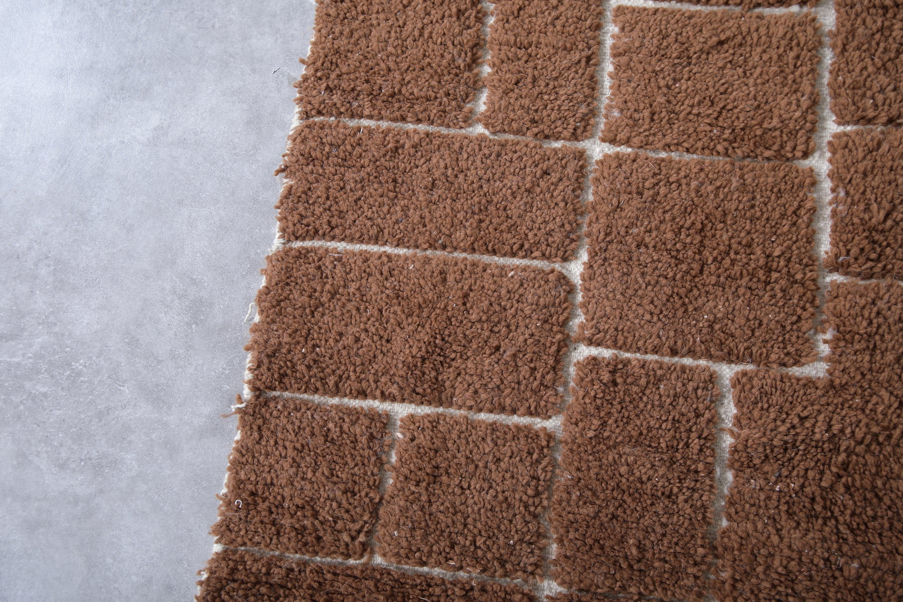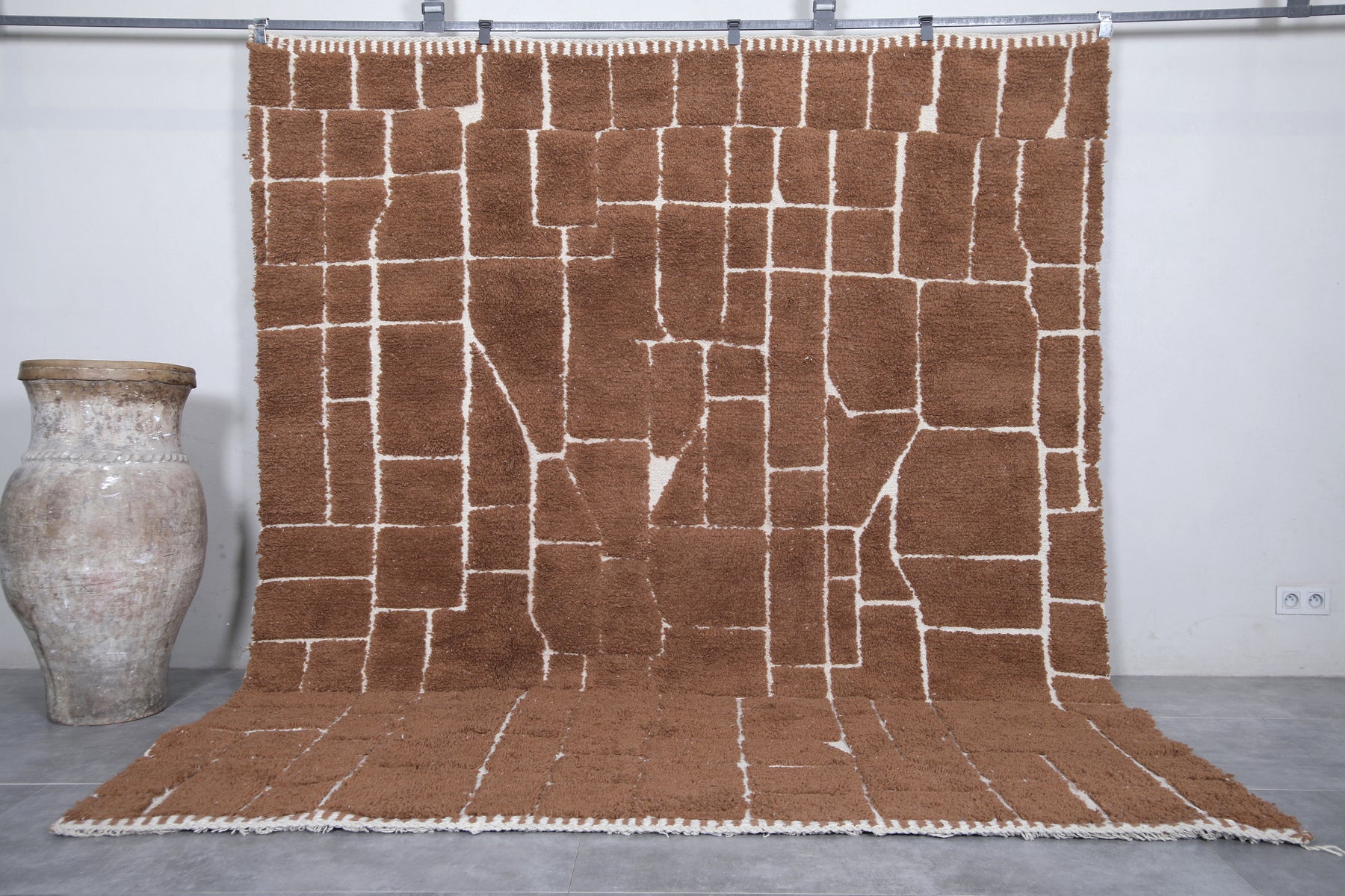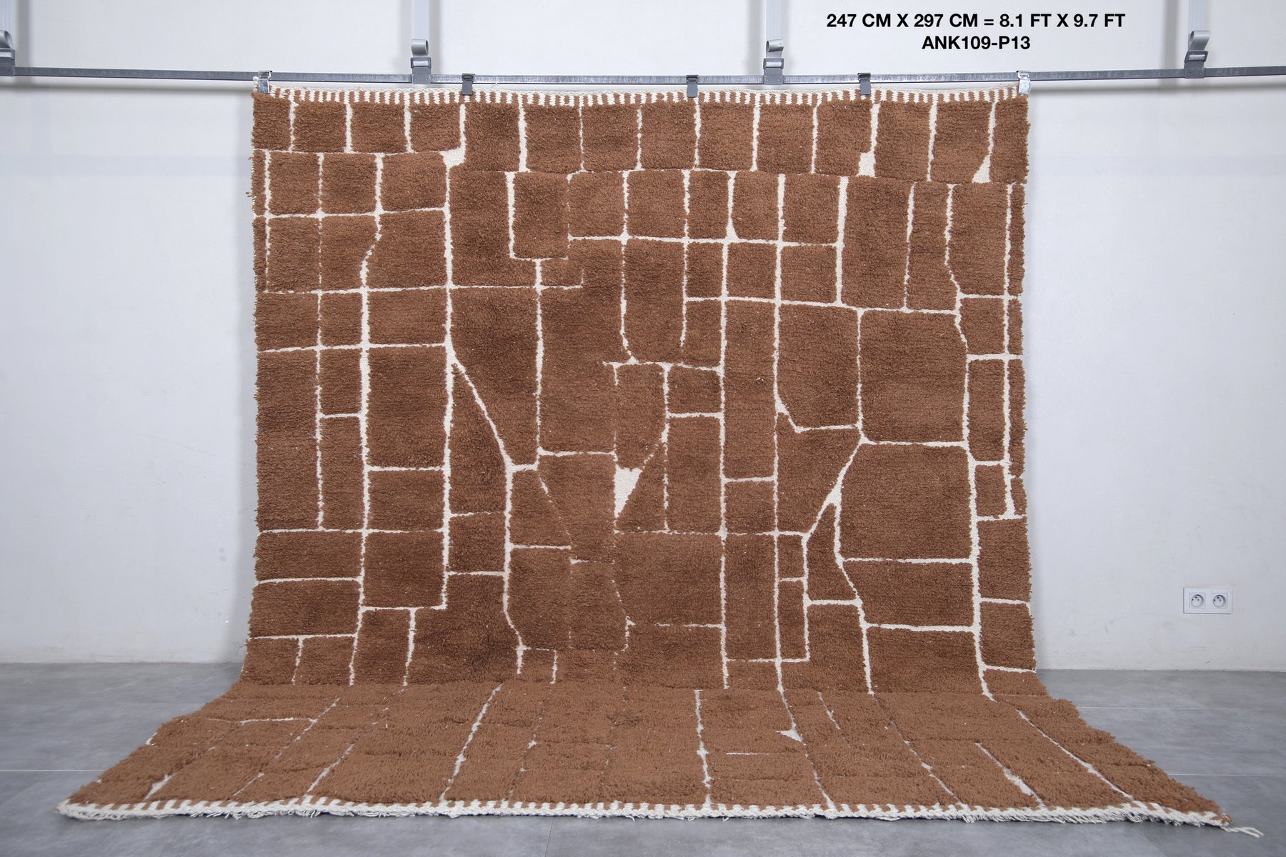 Enhance your home with this striking Moroccan Beni Ourain Rug, handwoven from premium natural wool. Measuring 8.1 x 9.7 feet (247 CM x 297 CM), this rug features a bold geometric pattern in a warm brown hue, accented with ivory lines that create a unique, modern grid design. Its plush texture provides comfort and warmth, while the high-quality craftsmanship ensures long-lasting durability. Perfect for large living spaces, bedrooms, or offices, this handmade rug brings a harmonious blend of traditional Moroccan art and contemporary style. Shop now to elevate your interior decor!