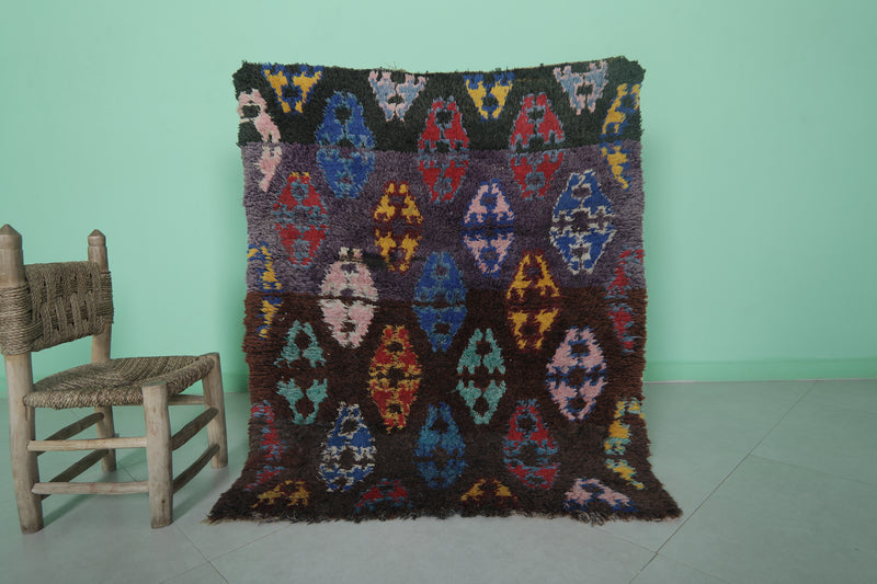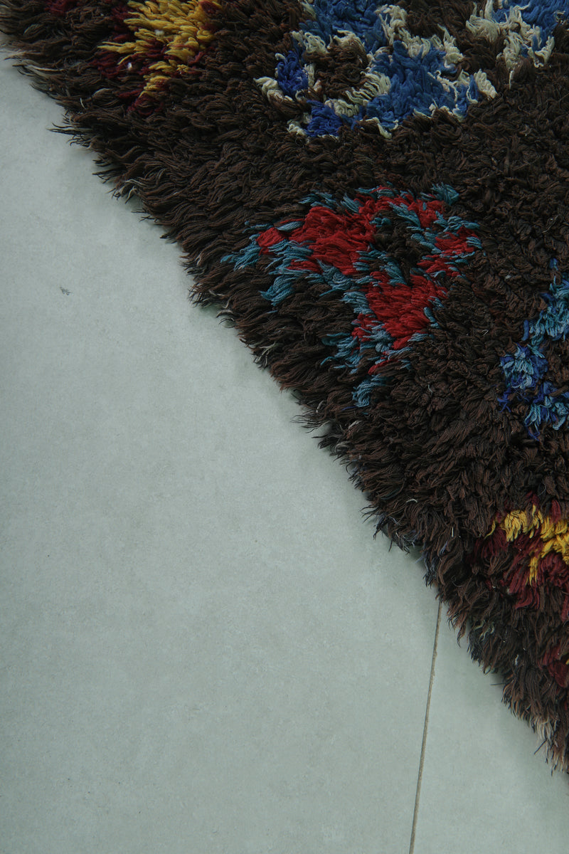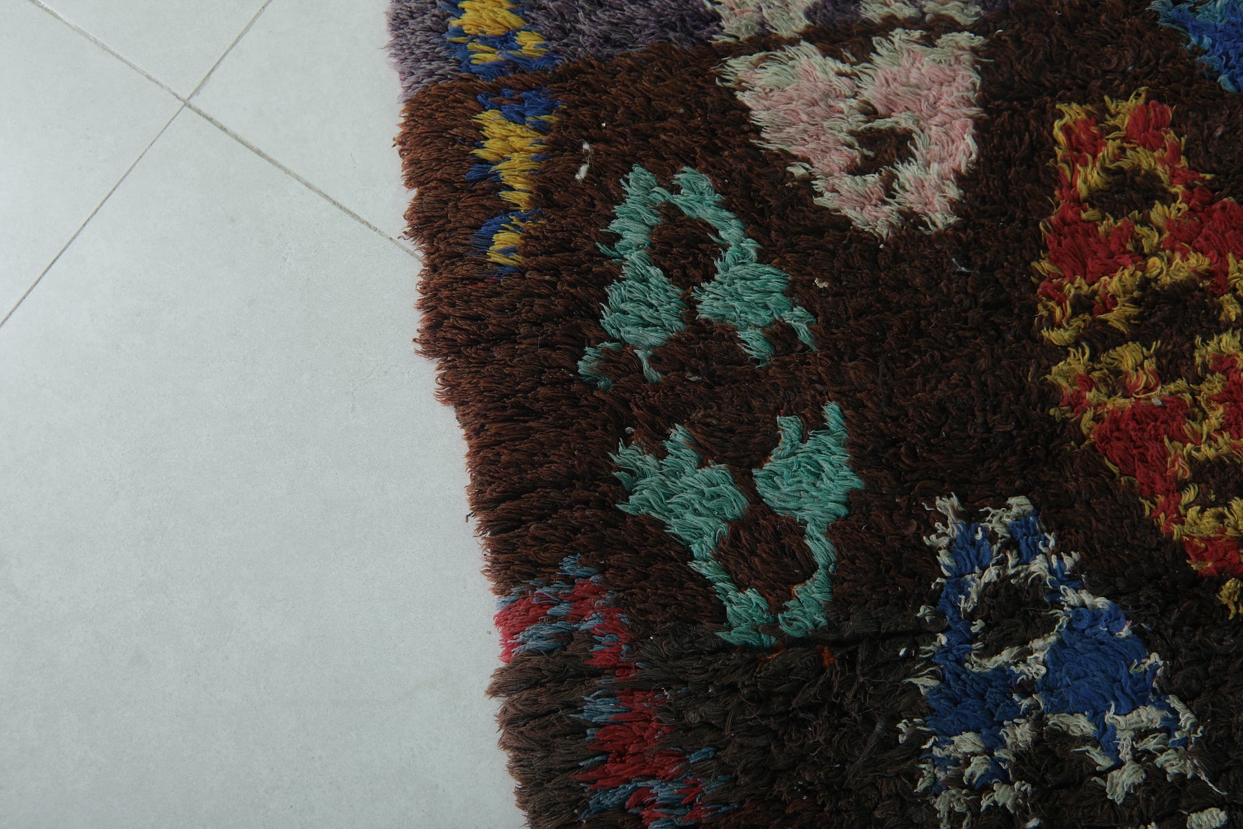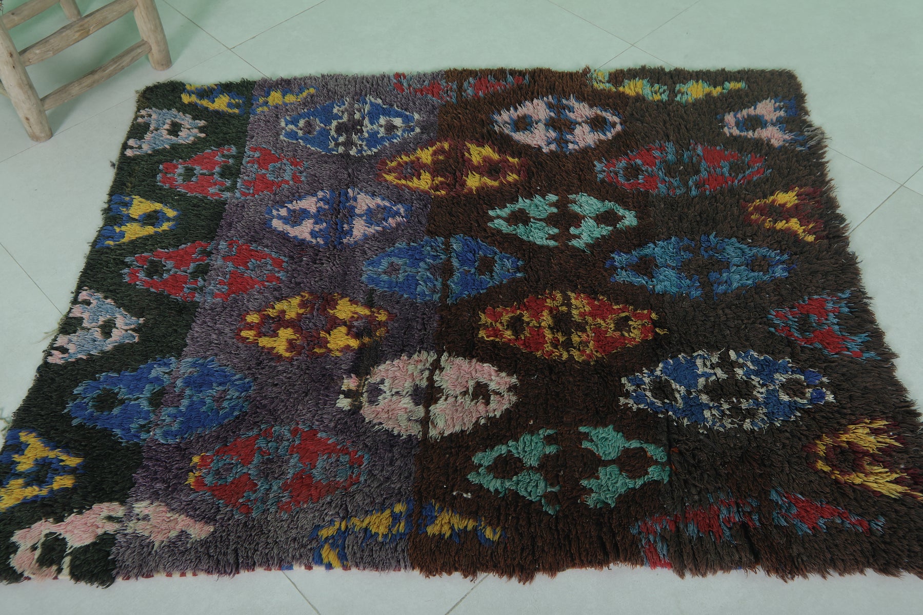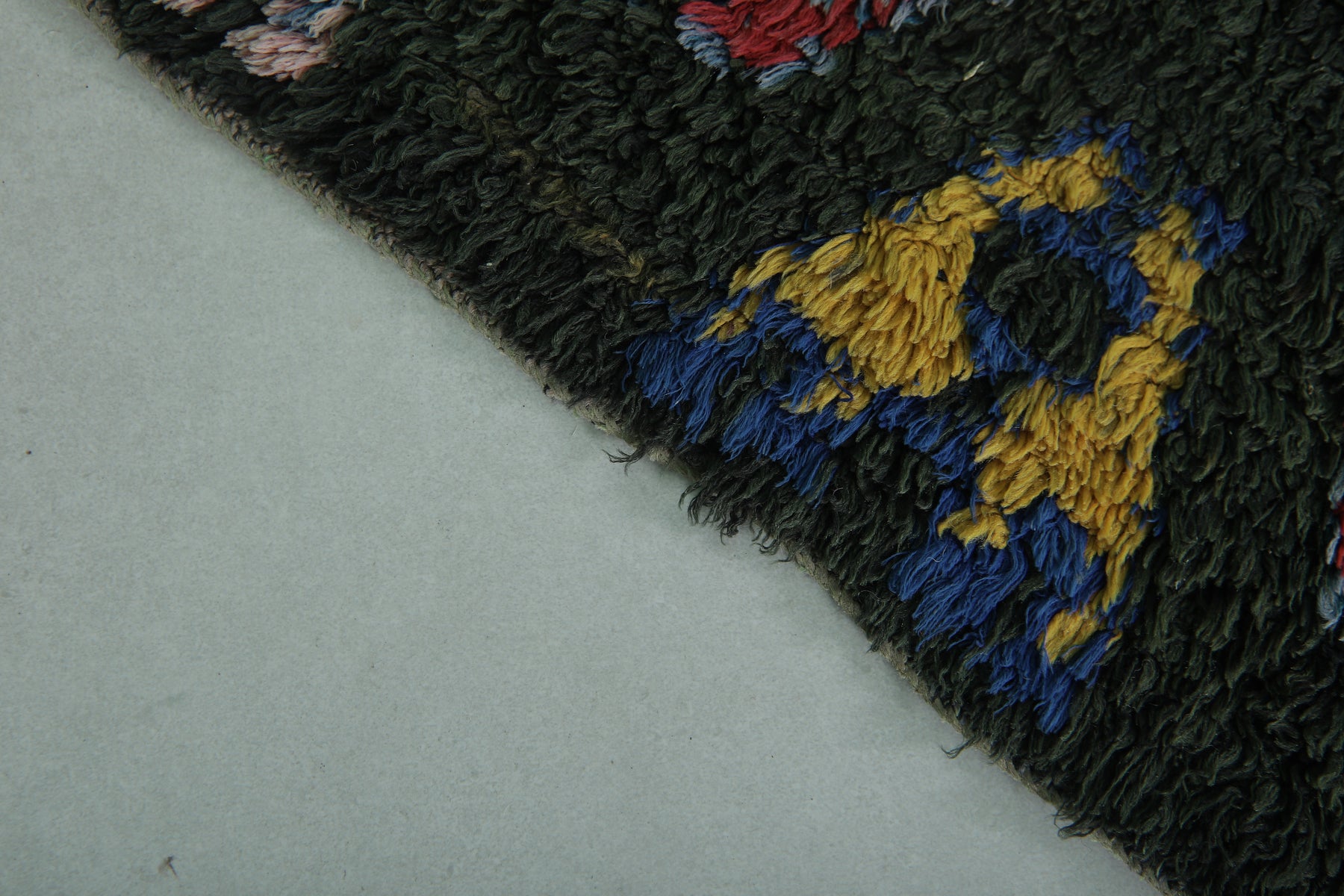 Elevate your space with this authentic Moroccan Berber rug, handwoven by skilled artisans. Featuring a bold mix of geometric tribal patterns in deep hues of blue, red, pink, and yellow against a rich black backdrop, this rug brings warmth and cultural charm to any setting. Its plush texture and compact size make it an excellent choice for adding depth to hallways, entryways, or cozy nooks. Made from high-quality wool, this vintage piece embodies timeless craftsmanship, making it both a decorative and functional statement.