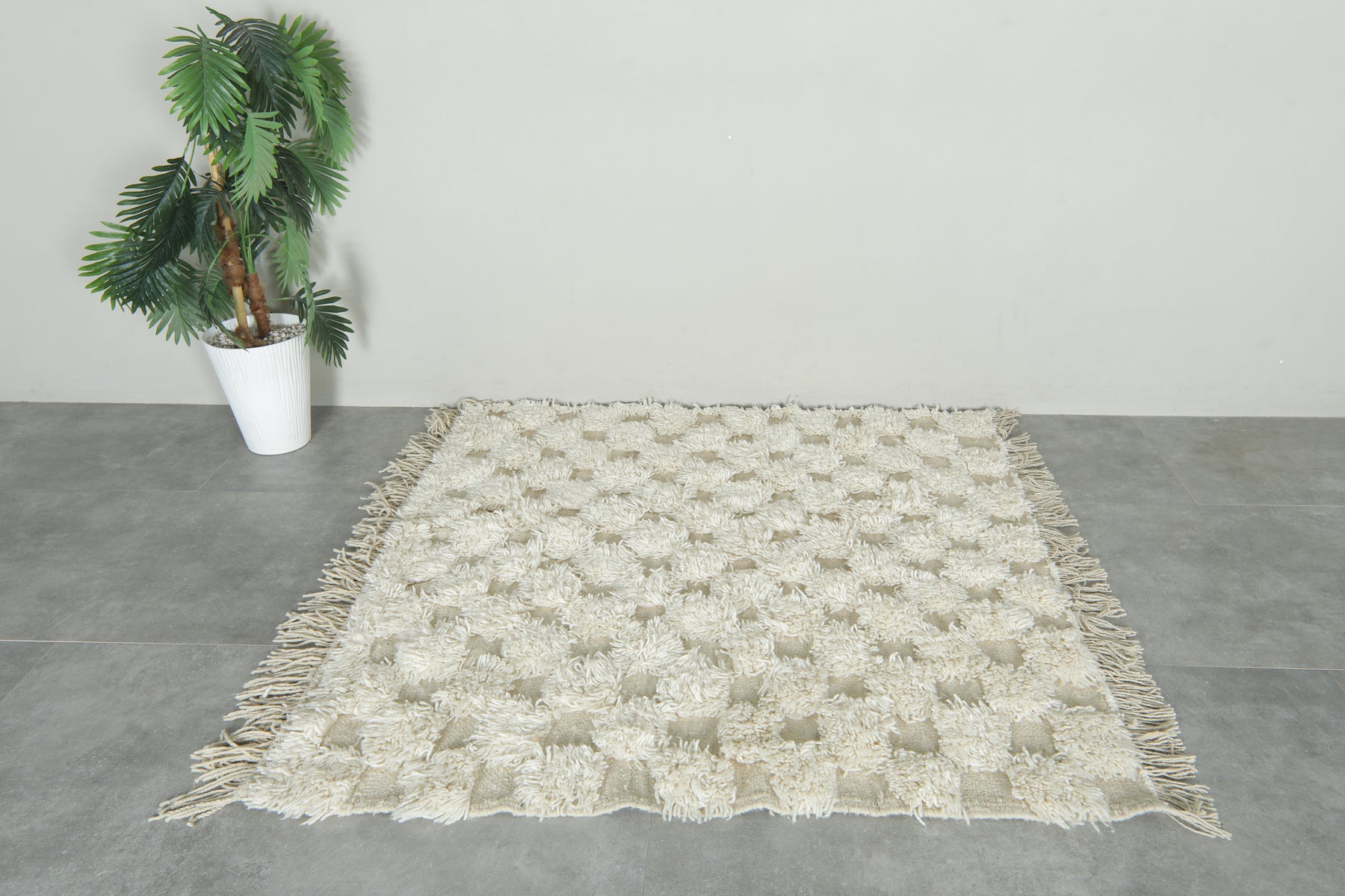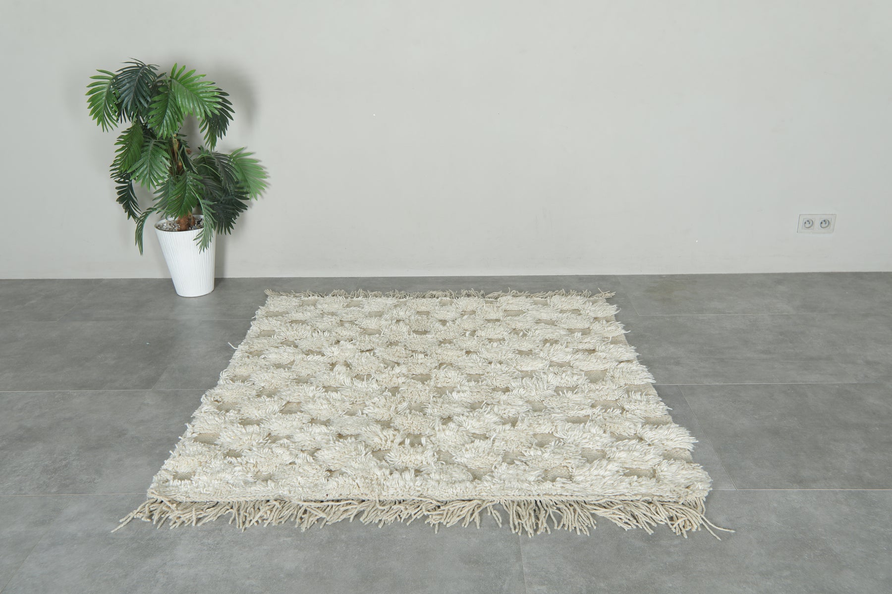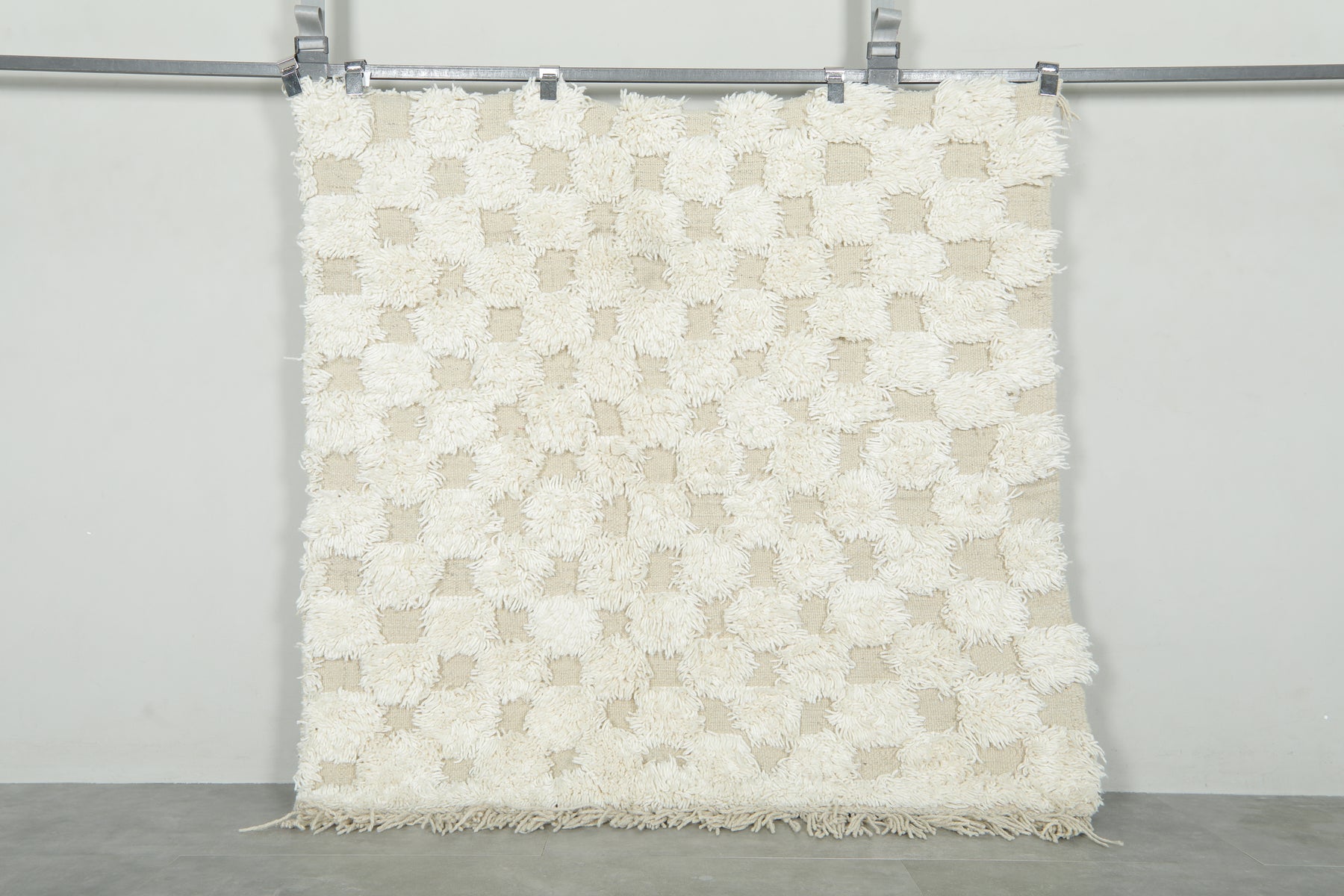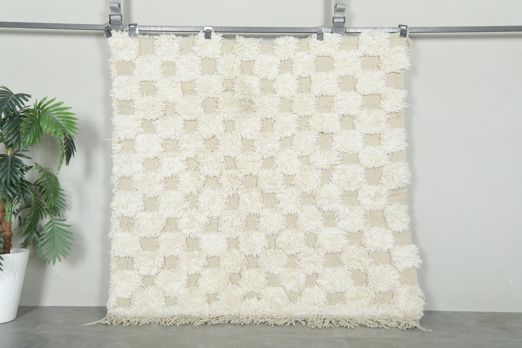 Elevate your space with this handcrafted square Moroccan checkered rug, featuring a stunning blend of soft white and warm beige tones. Expertly woven by Berber artisans, this plush wool rug showcases a modern checkerboard design with a cozy, textured finish—perfect for adding depth and warmth to living rooms, bedrooms, or entryways. Its square shape (approx. 4.8 ft x 4.7 ft) makes it a versatile accent for both classic and contemporary interiors. Made from 100% natural wool, this rug offers lasting comfort and timeless elegance.