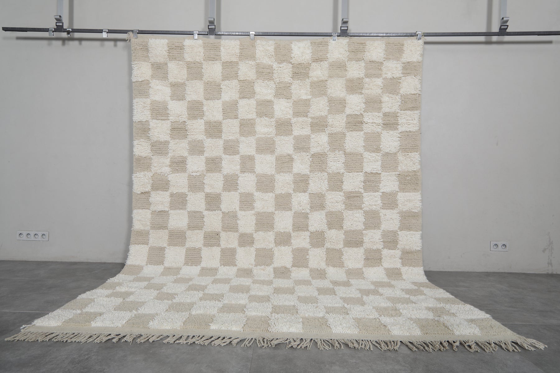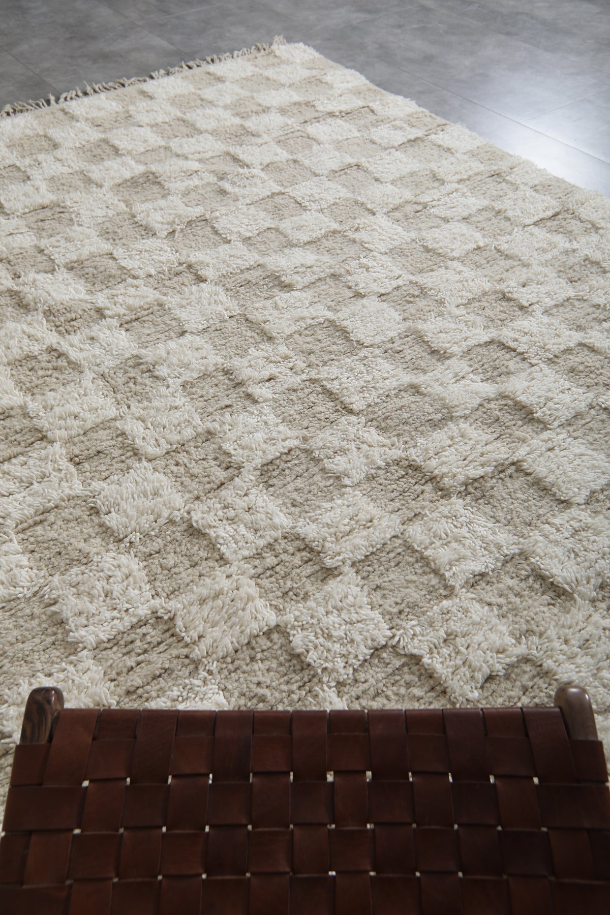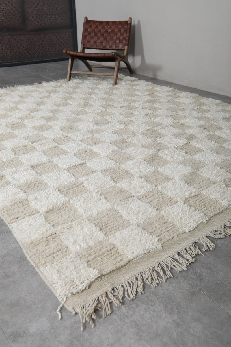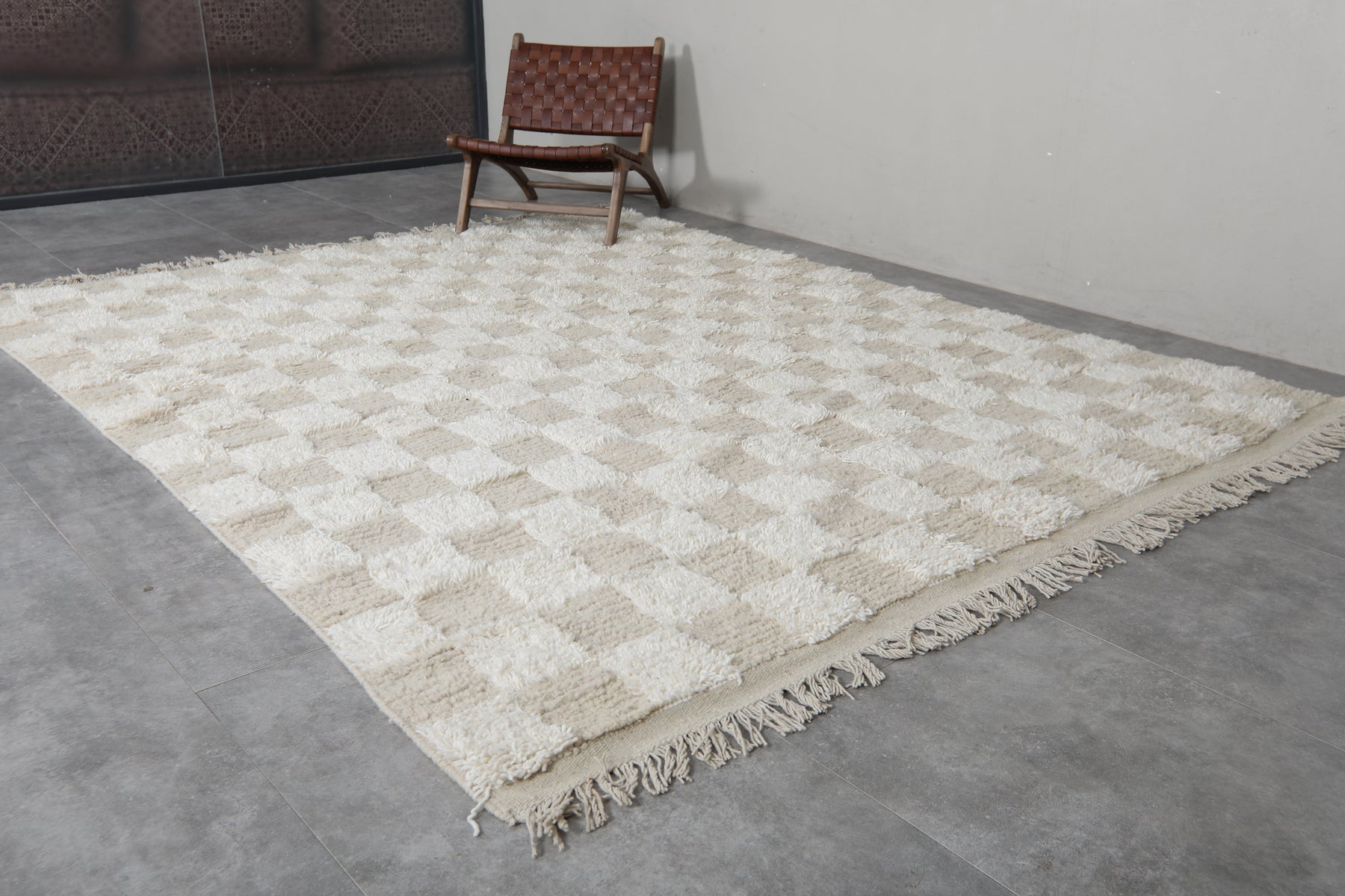 Bring refined elegance to your space with this handwoven Beige and White Moroccan Rug, featuring a soft checkered pattern and generous 7.9 x 9.8 feet dimensions. The neutral palette and shaggy texture create a serene, cozy atmosphere, perfect for living rooms, bedrooms, or reading nooks. This timeless piece blends traditional Moroccan craftsmanship with a modern minimalist vibe, making it an ideal fit for a range of interior styles—from Scandinavian to bohemian.