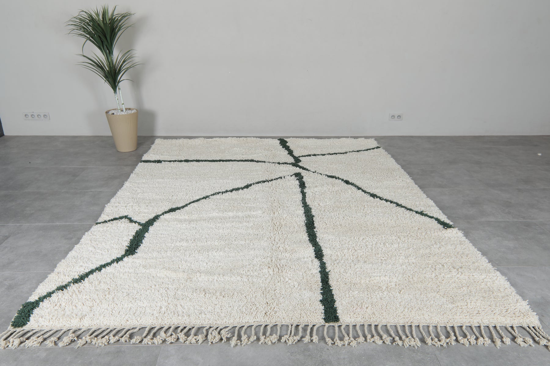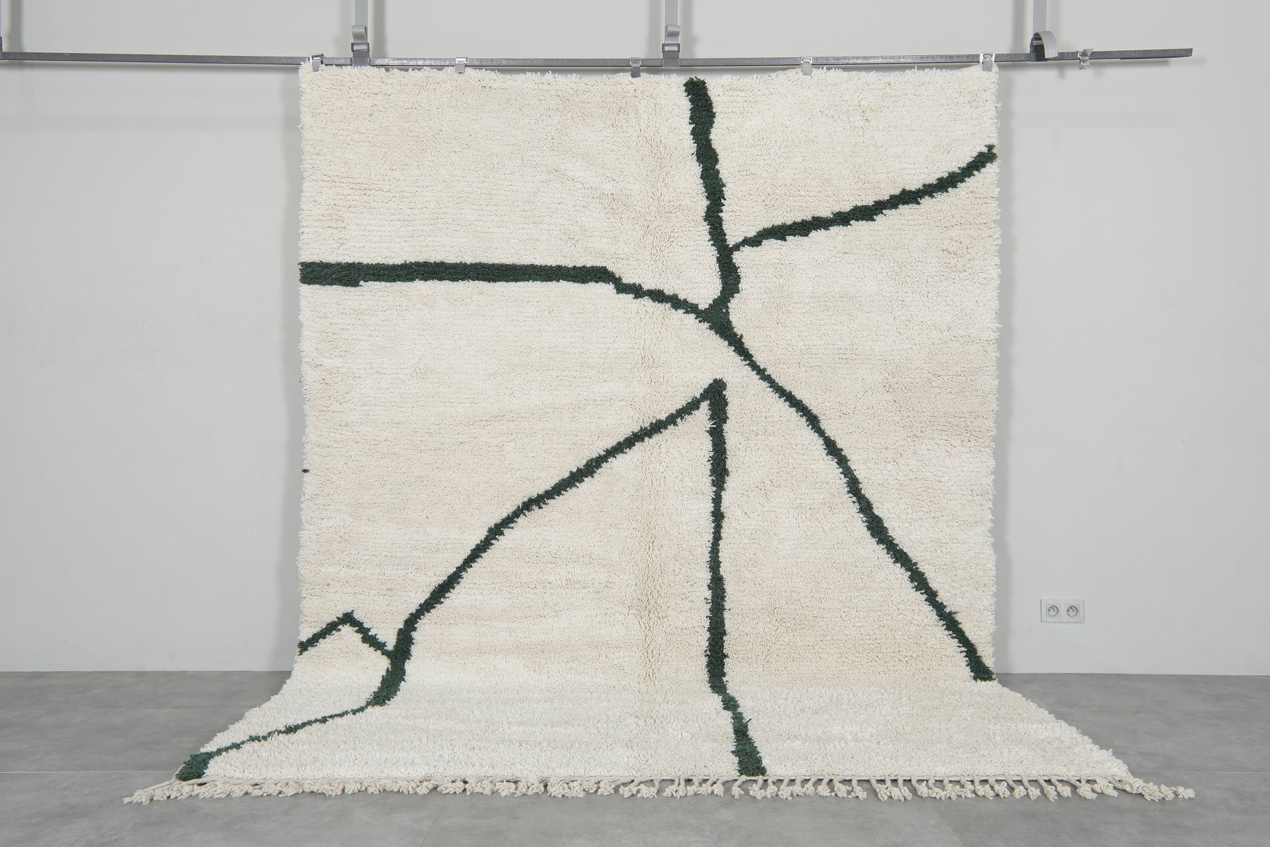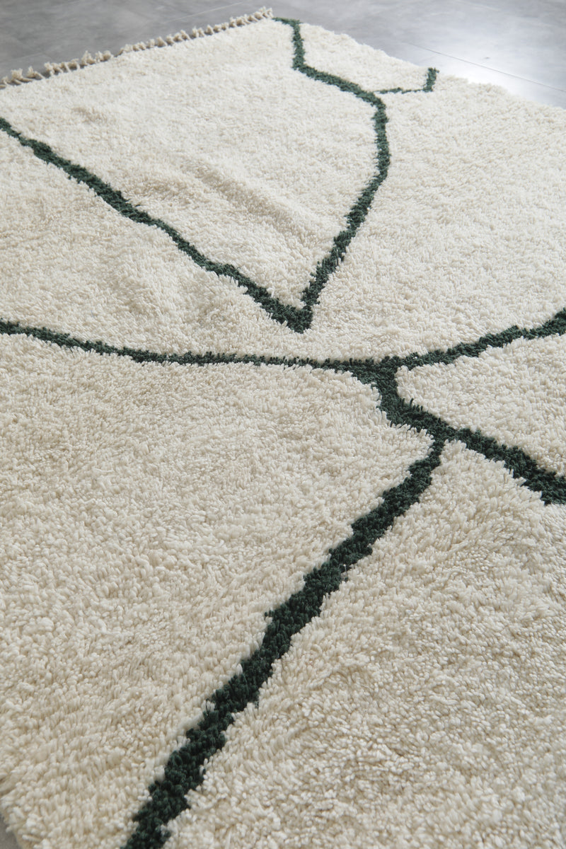 Enhance your home with this stunning handwoven Moroccan rug, crafted from luxurious wool and featuring an artistic abstract pattern in deep green on a soft cream base. Designed to complement modern interiors, this rug seamlessly blends traditional craftsmanship with a contemporary aesthetic for a truly unique statement piece.