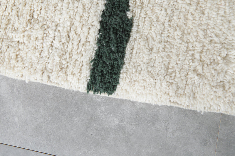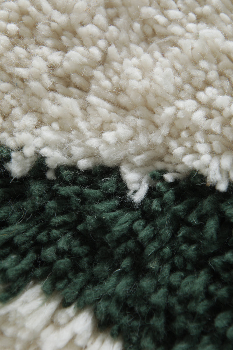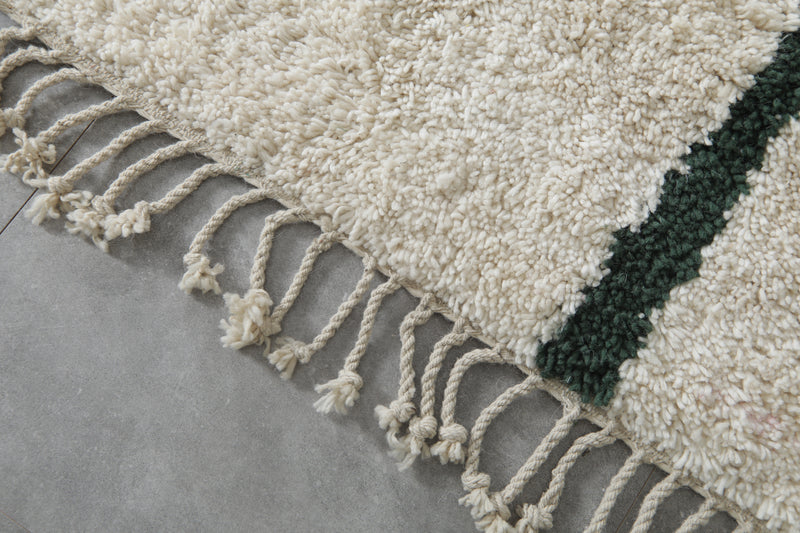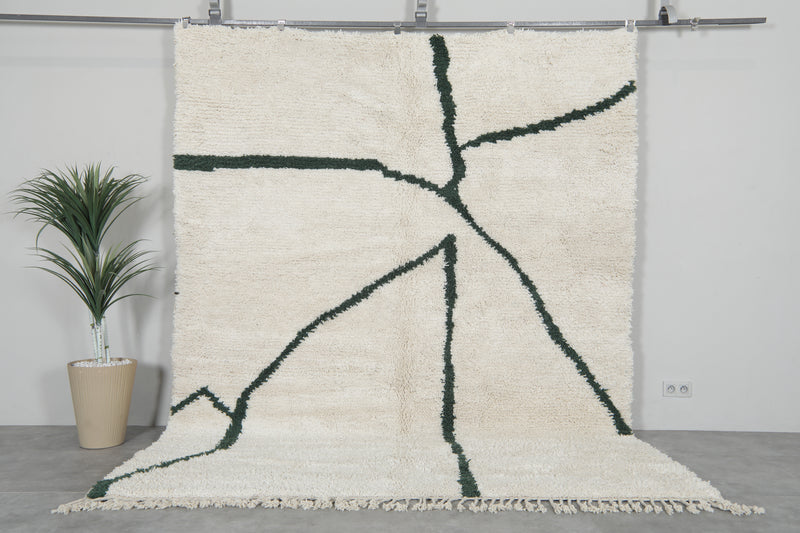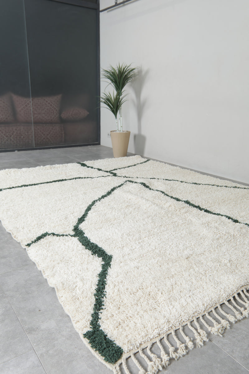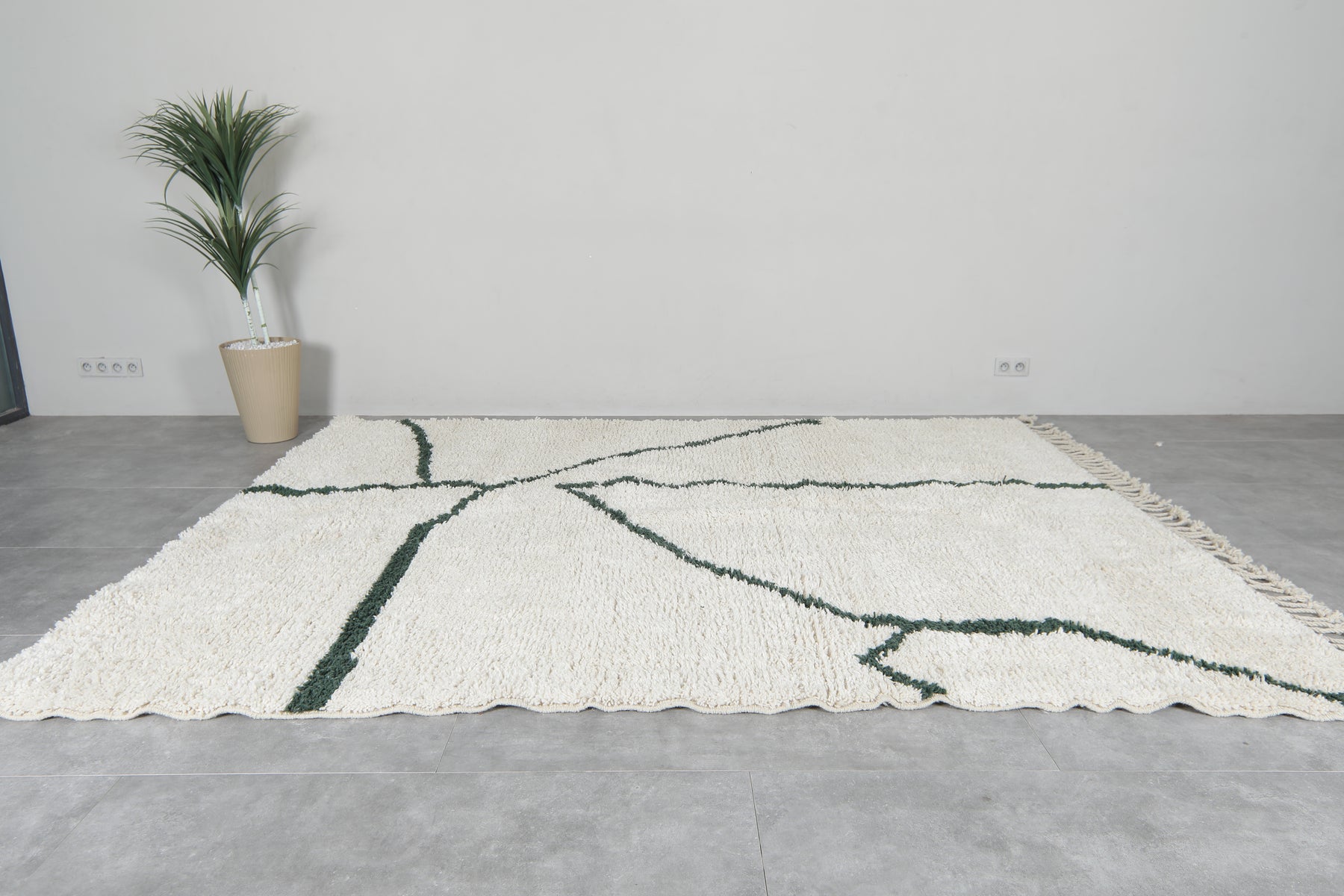 Enhance your home with this stunning handwoven Moroccan rug, crafted from luxurious wool and featuring an artistic abstract pattern in deep green on a soft cream base. Designed to complement modern interiors, this rug seamlessly blends traditional craftsmanship with a contemporary aesthetic for a truly unique statement piece.