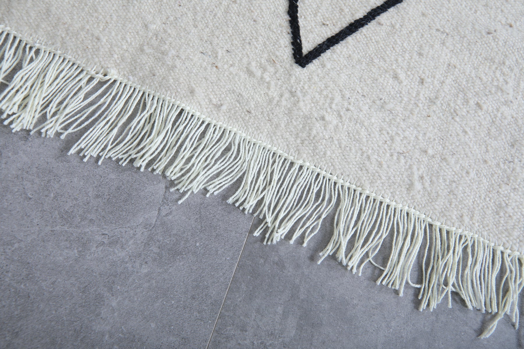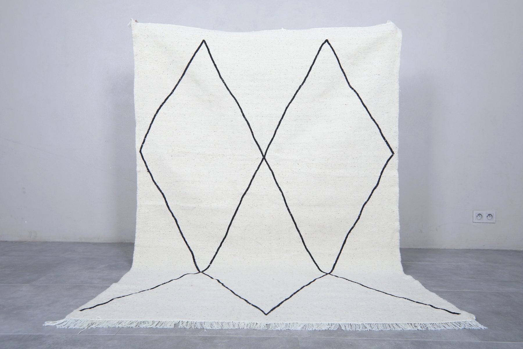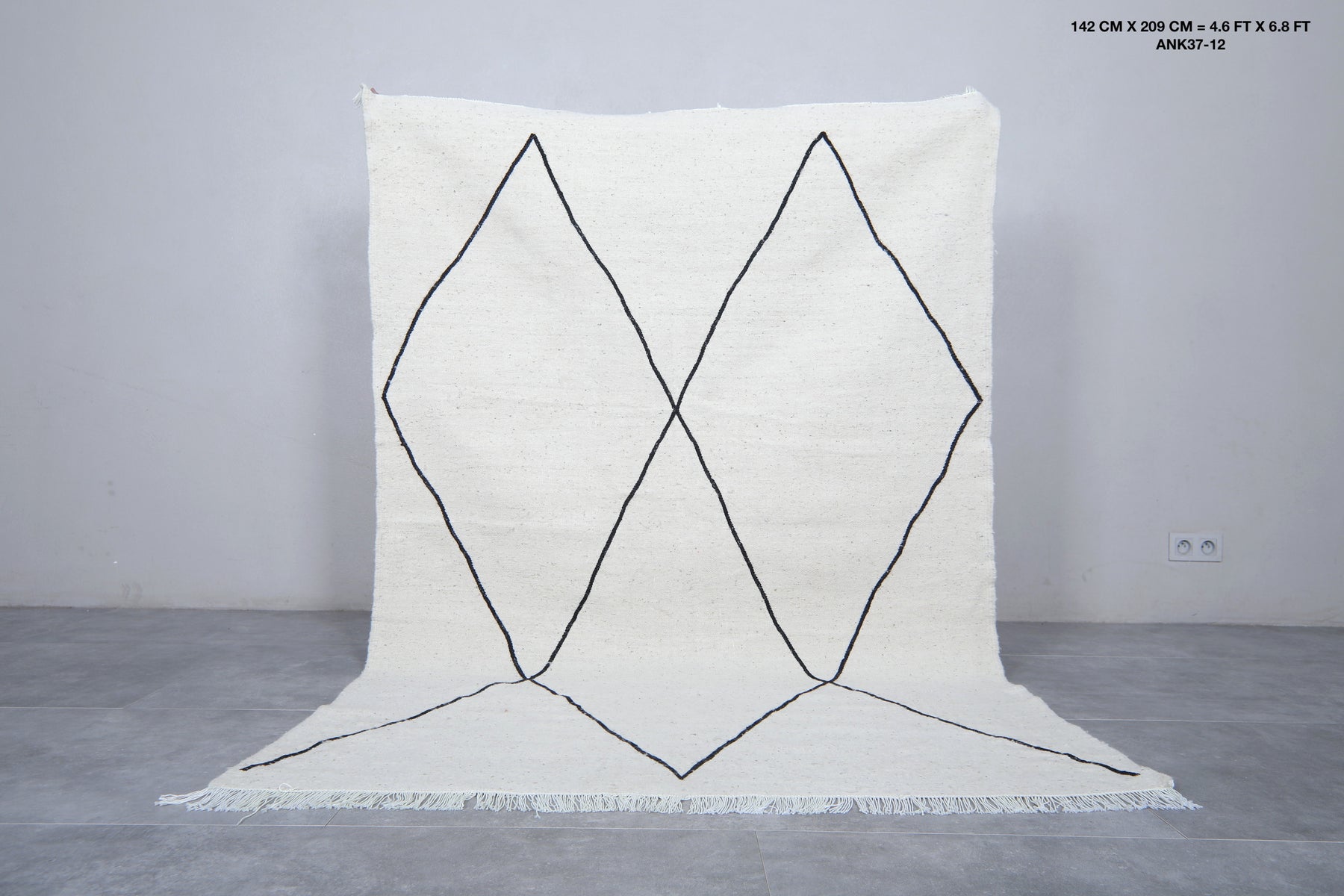 This 4.6 x 6.8 feet handwoven Moroccan wool rug embodies timeless elegance, featuring a bold black geometric diamond pattern on a soft white wool base. A seamless fusion of sophistication and tradition, it’s perfect for modern, Scandinavian, or bohemian-inspired interiors.