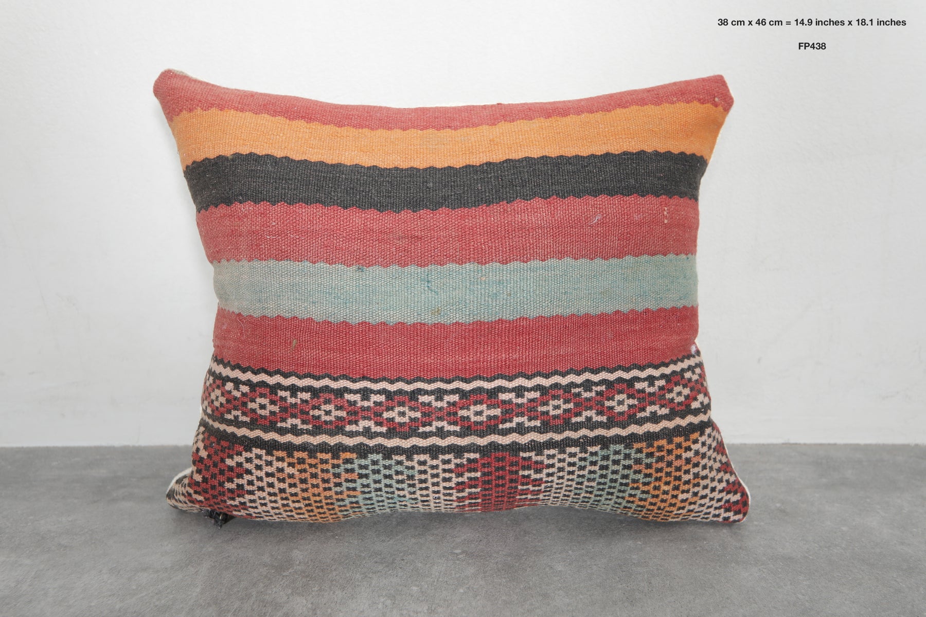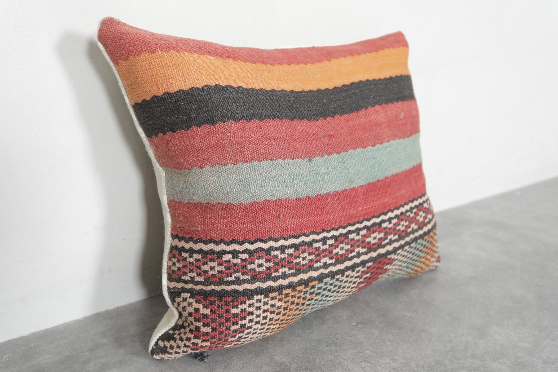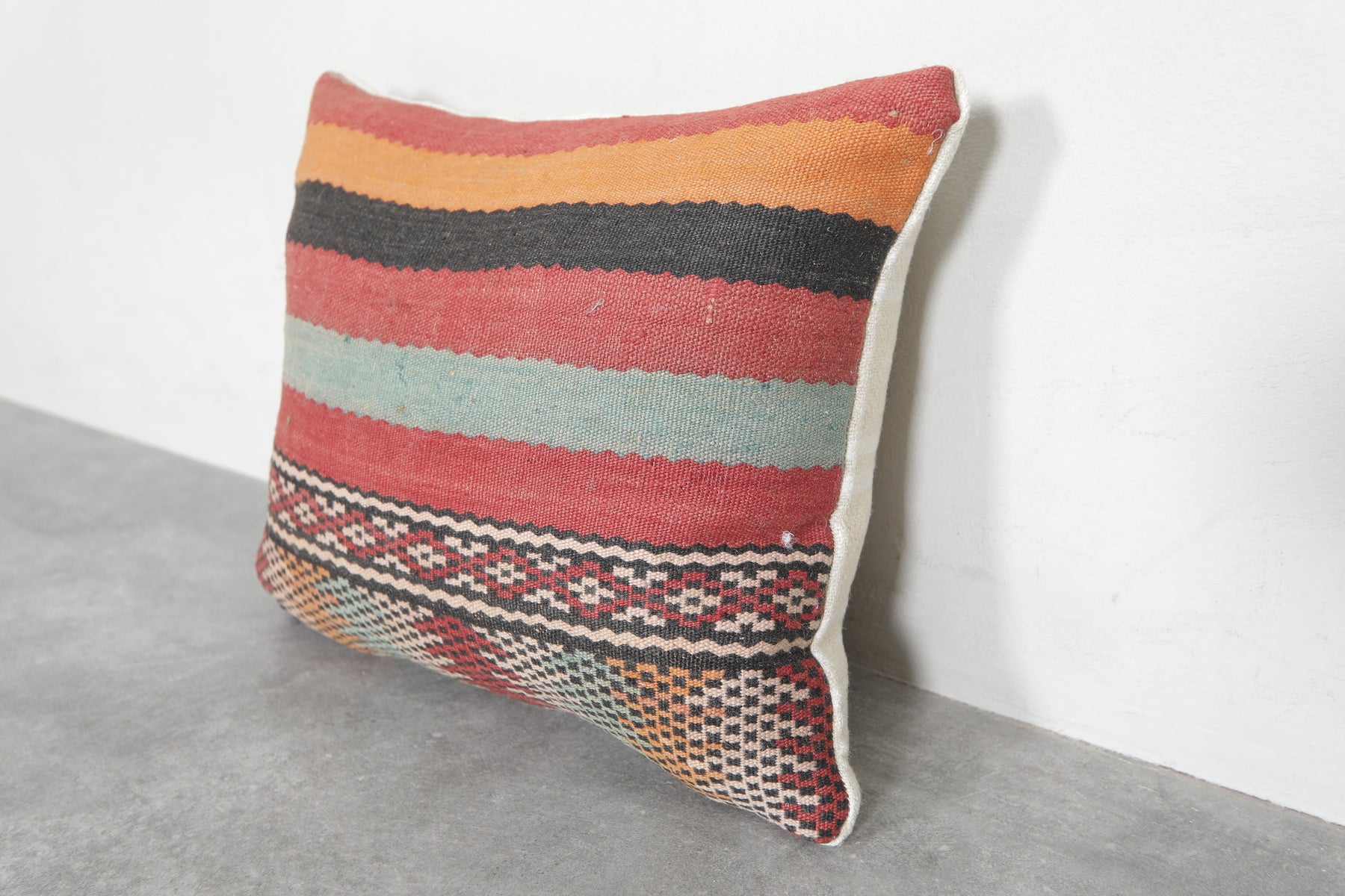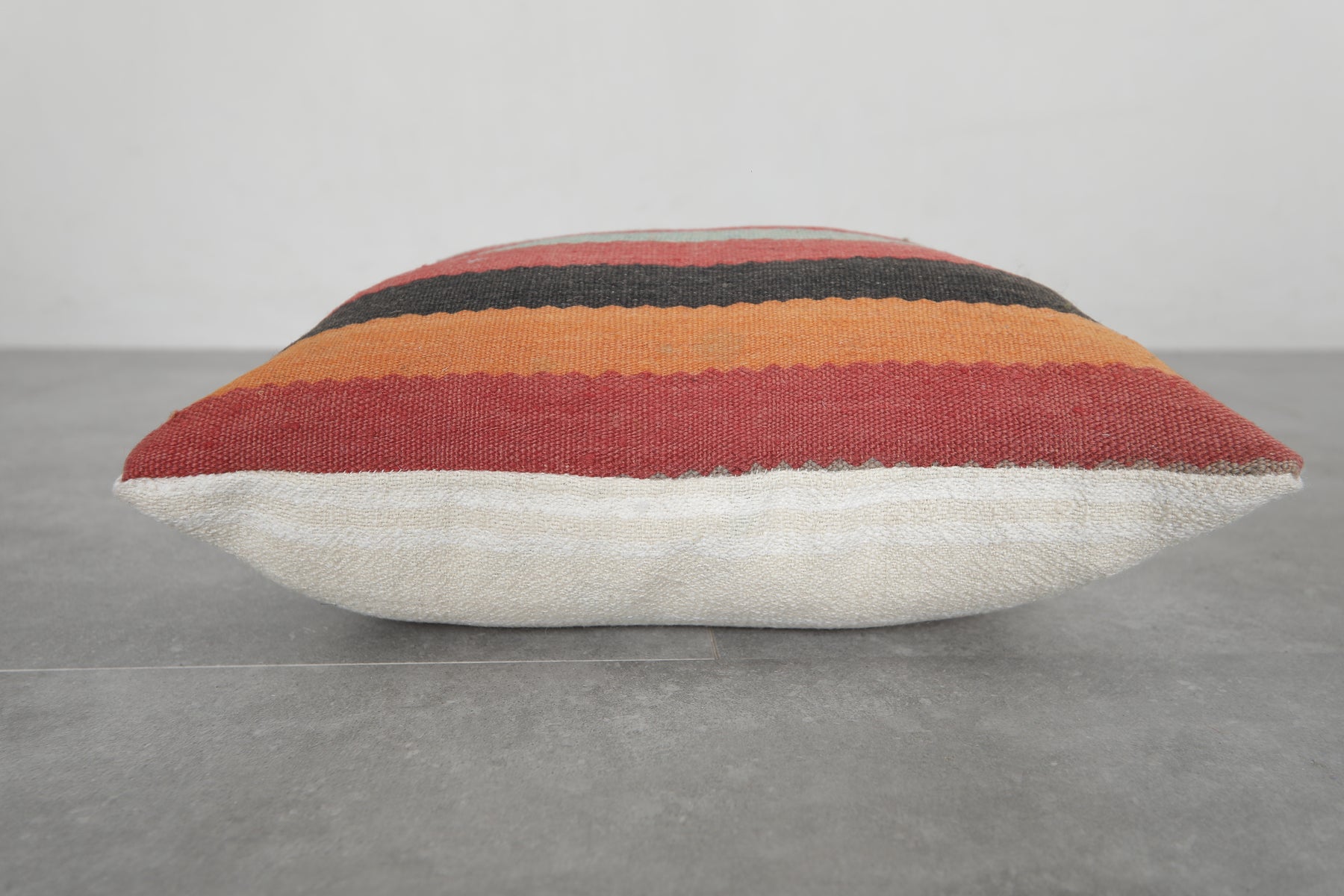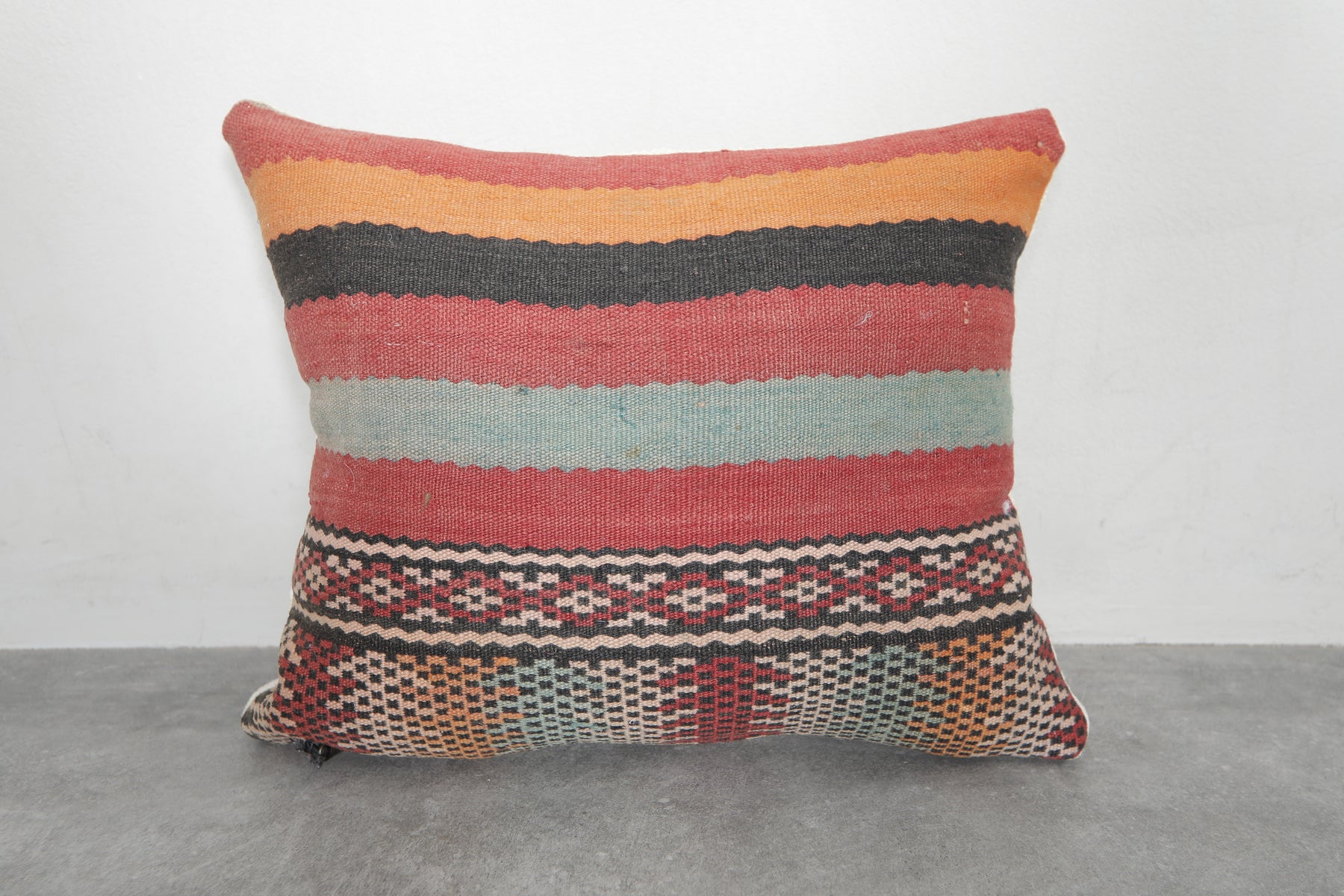 Bring a splash of color to your home with this striped Moroccan kilim pillow. Featuring a harmonious blend of warm orange, red, and black tones with soft teal accents, this handwoven pillow adds texture and charm. The intricate lower border design enhances its unique appeal, making it a perfect fit for sofas, chairs, or beds.
