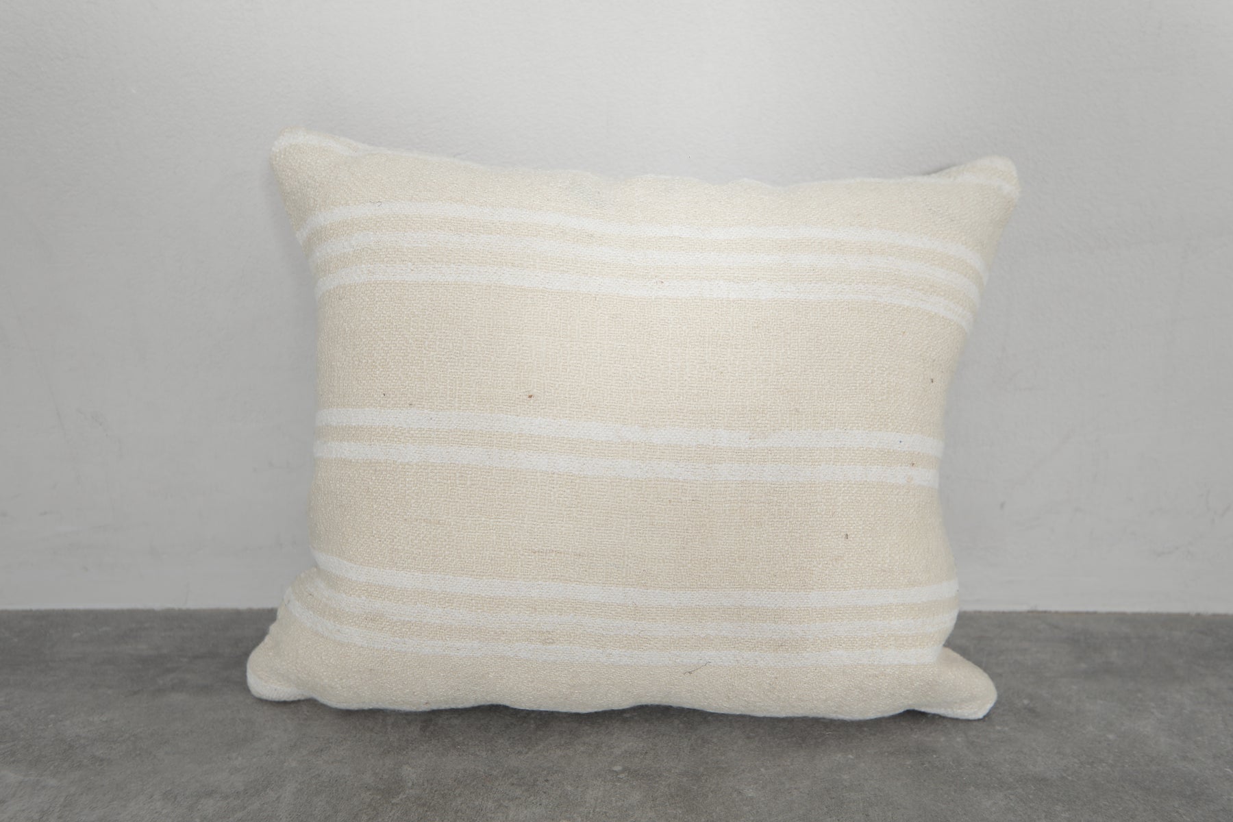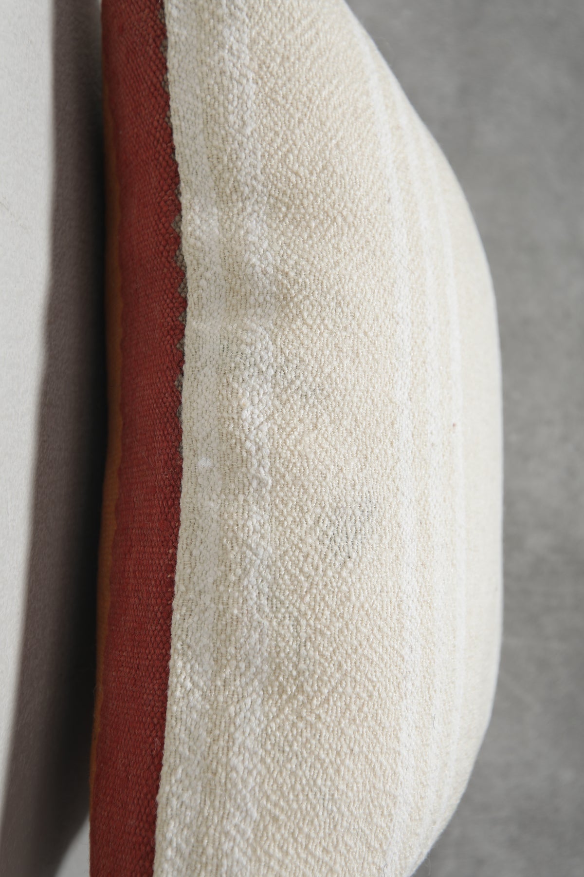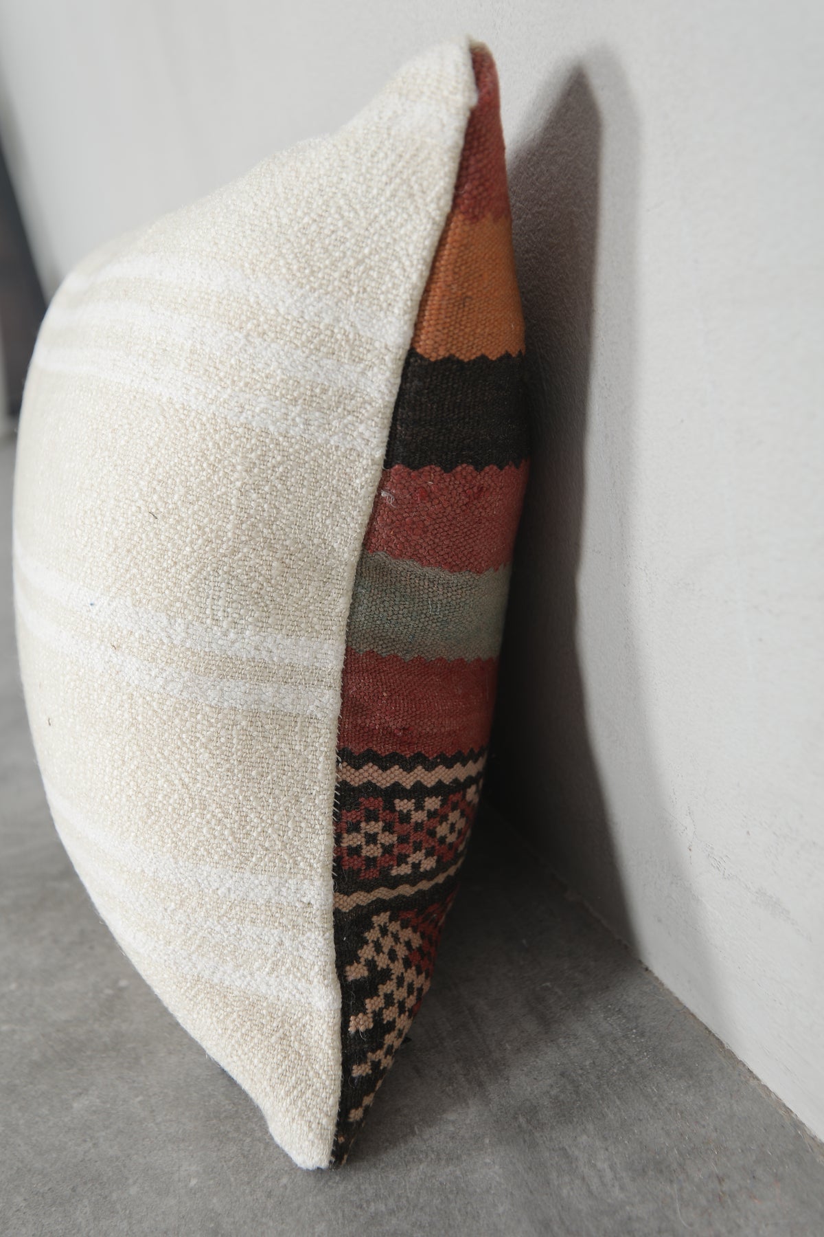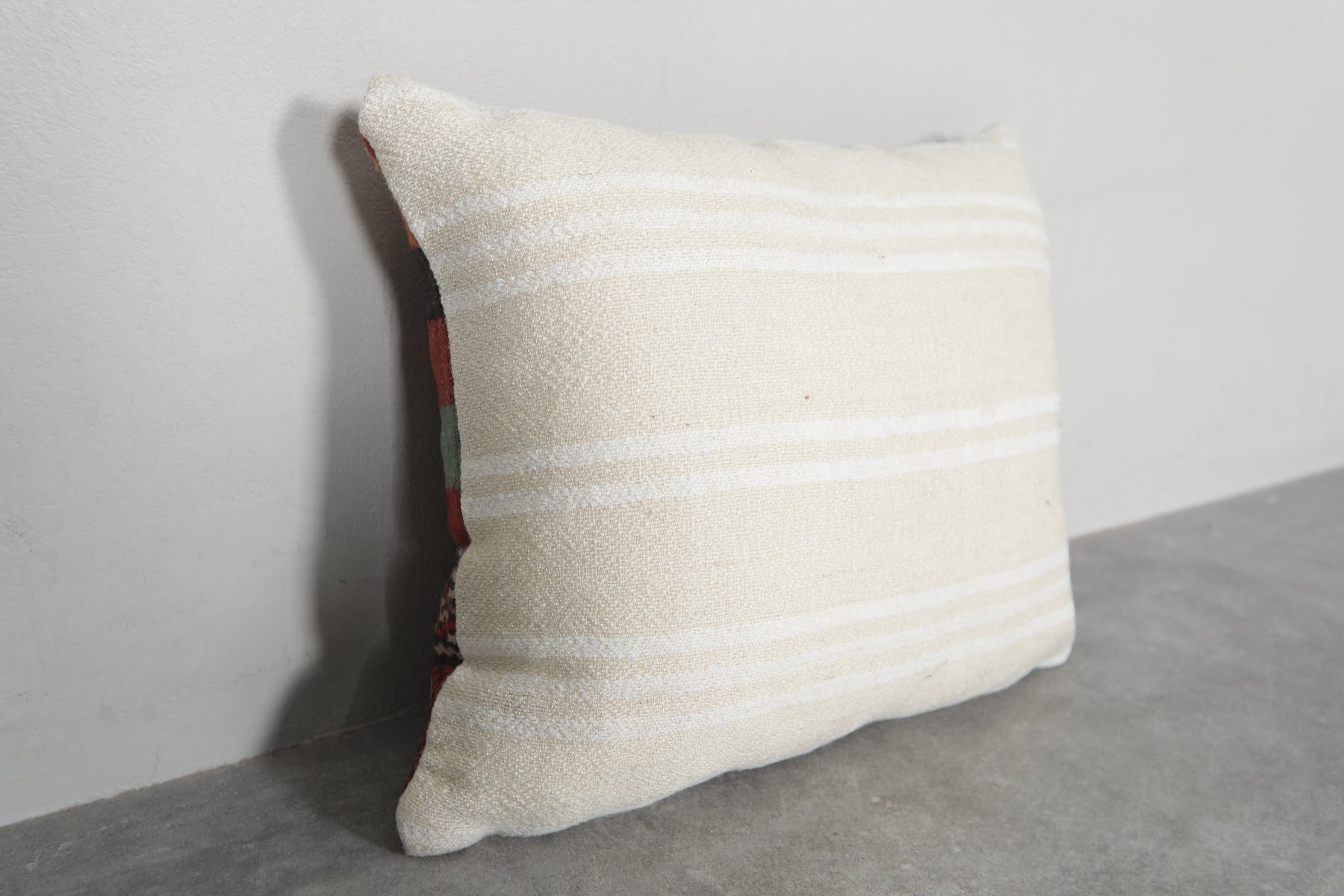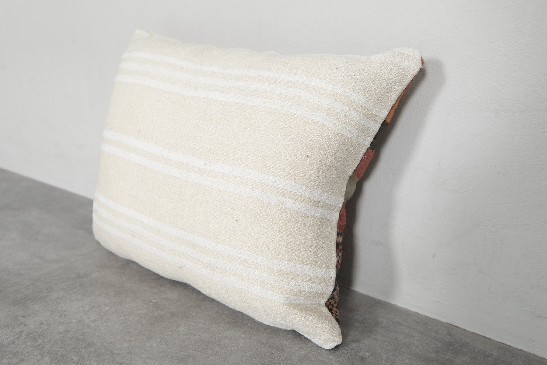Bring a splash of color to your home with this striped Moroccan kilim pillow. Featuring a harmonious blend of warm orange, red, and black tones with soft teal accents, this handwoven pillow adds texture and charm. The intricate lower border design enhances its unique appeal, making it a perfect fit for sofas, chairs, or beds.