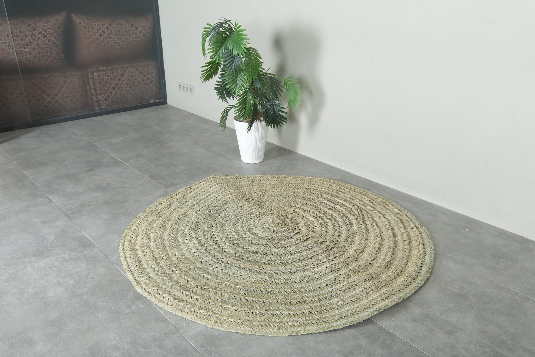 Whether used as a floor rug, a prayer mat, or a stylish base for low seating, the Hassira brings cultural heritage and sustainable living into your home. Its tightly braided circular pattern ensures durability, while its neutral tones blend seamlessly with any decor style.